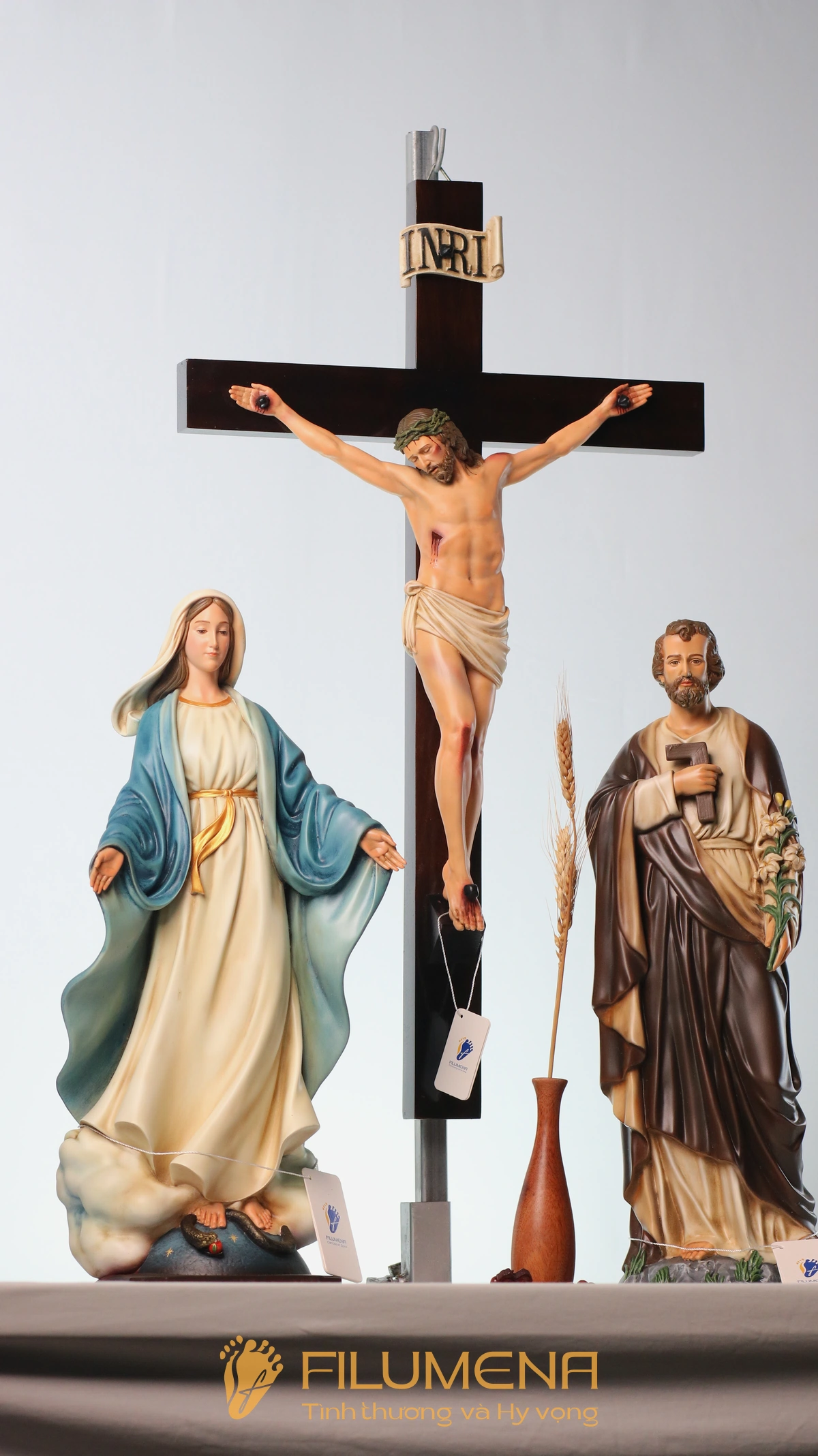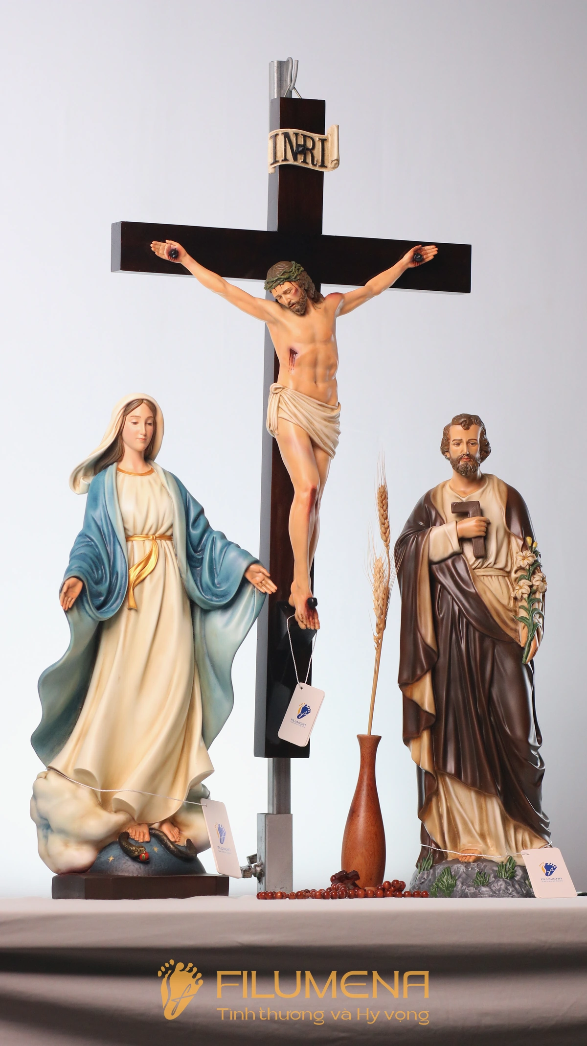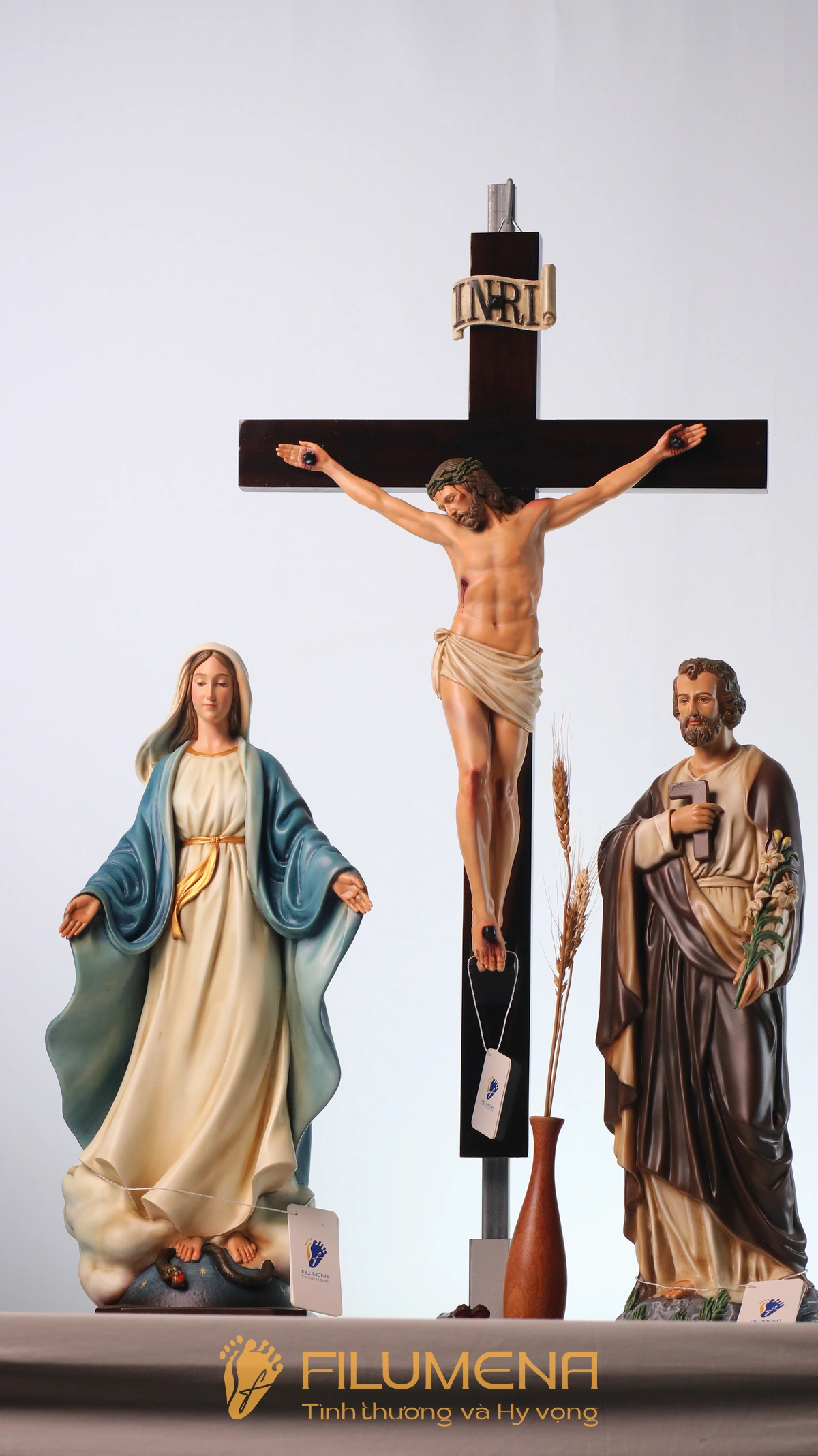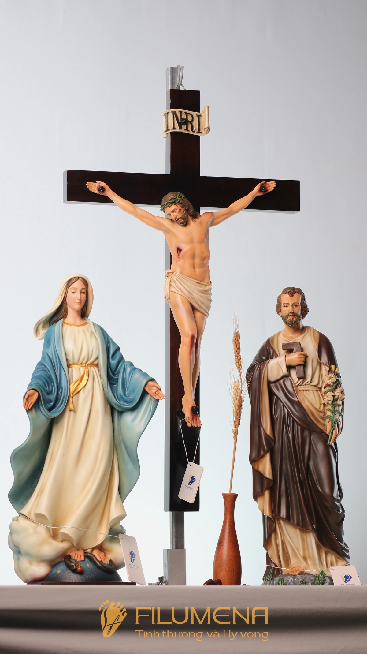 Bên trái là tượng Đức Mẹ Ban Ơn 50 cm màu xanh dương, với tư thế đứng thẳng, hai tay mở rộng như đang tuôn đổ ơn lành trên gia đình. Tông xanh dương truyền thống giúp tượng nổi bật mà vẫn dịu mắt, rất hài hòa với màu gỗ nâu của thánh giá và bàn thờ. Bên phải là tượng Thánh Giuse 50 cm, dáng đứng vững chãi, gợi lên hình ảnh người cha hiền âm thầm bảo trợ gia đình.