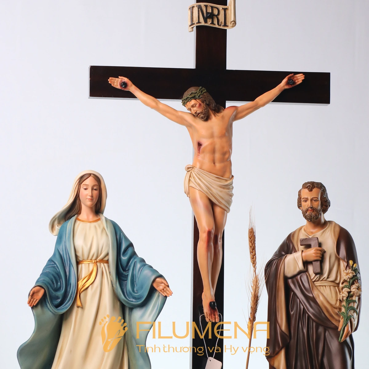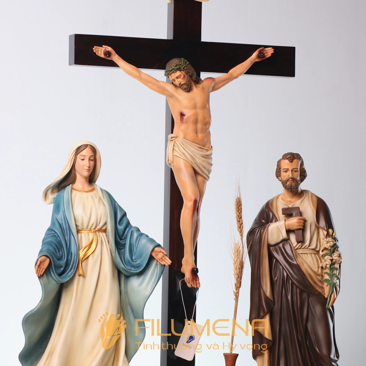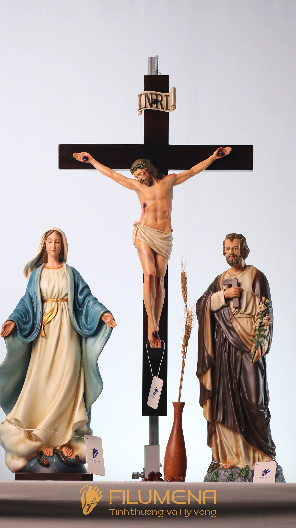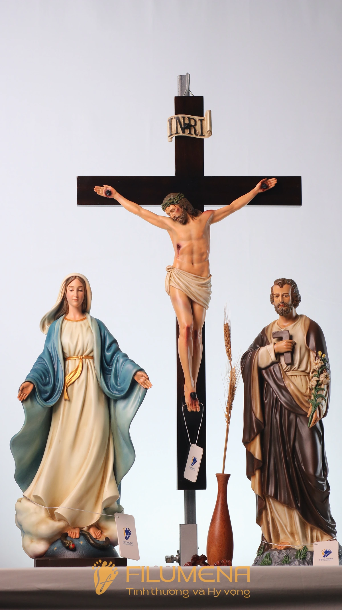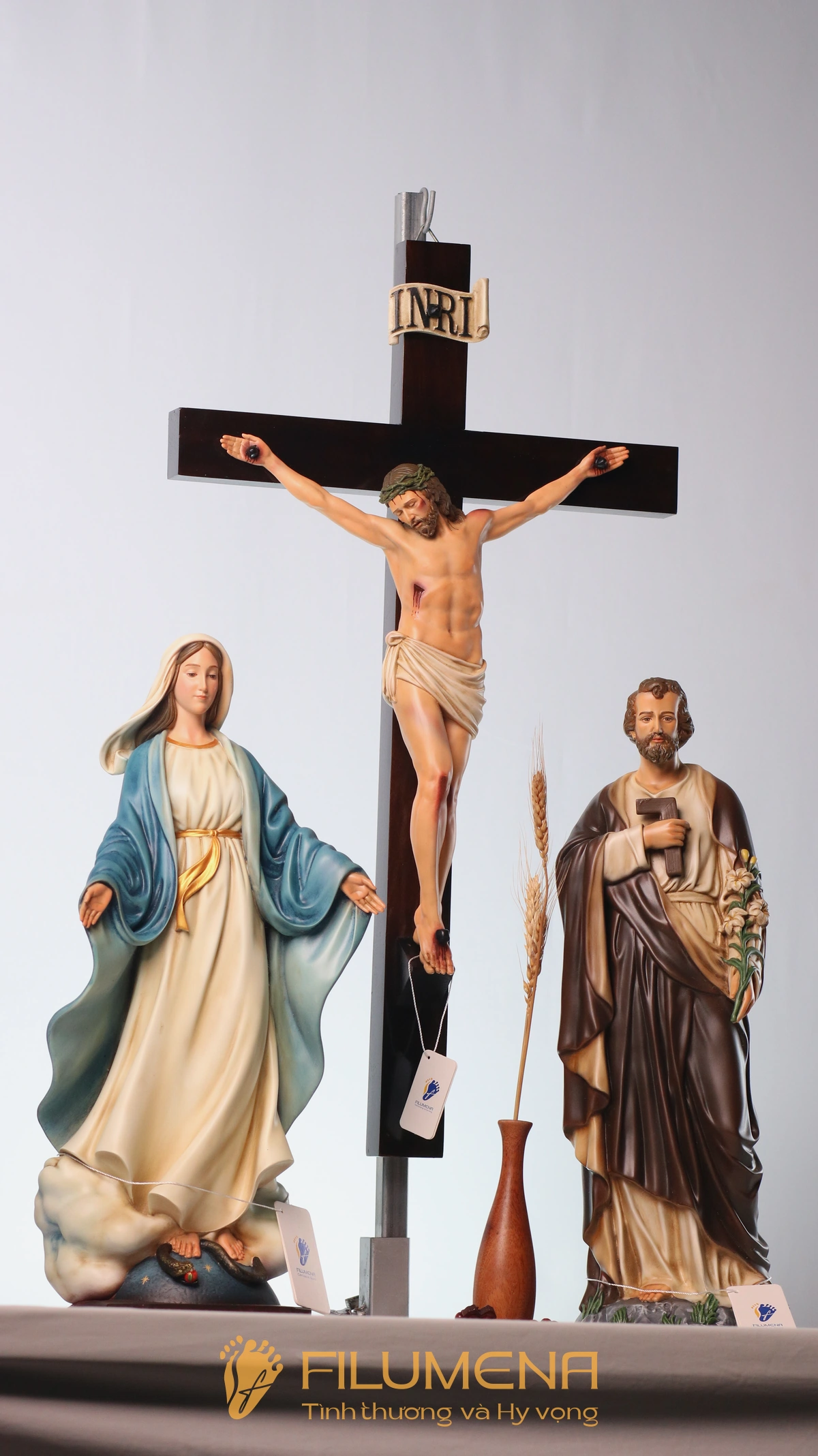 Bên trái là tượng Đức Mẹ Ban Ơn 50 cm màu xanh dương, với tư thế đứng thẳng, hai tay mở rộng như đang tuôn đổ ơn lành trên gia đình. Tông xanh dương truyền thống giúp tượng nổi bật mà vẫn dịu mắt, rất hài hòa với màu gỗ nâu của thánh giá và bàn thờ. Bên phải là tượng Thánh Giuse 50 cm, dáng đứng vững chãi, gợi lên hình ảnh người cha hiền âm thầm bảo trợ gia đình.
