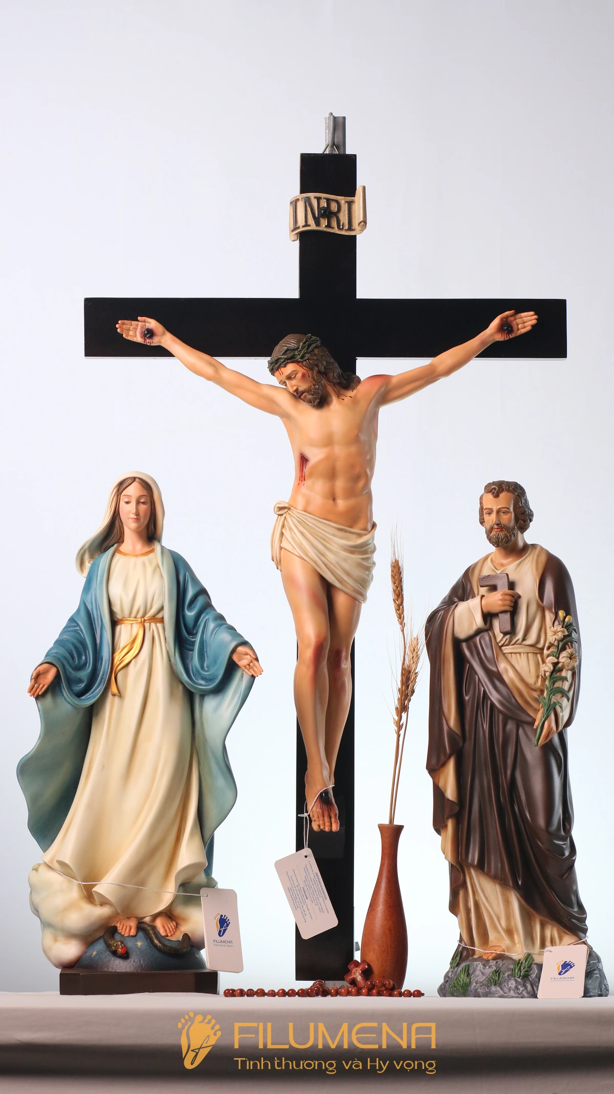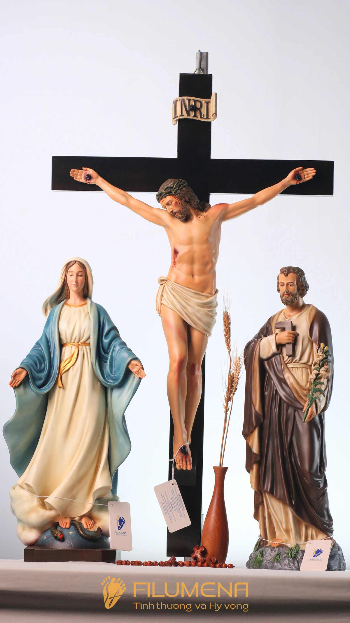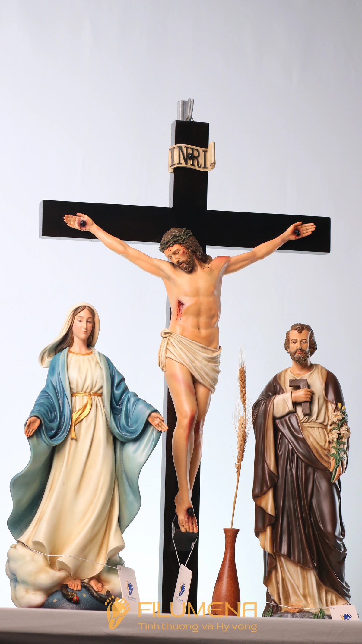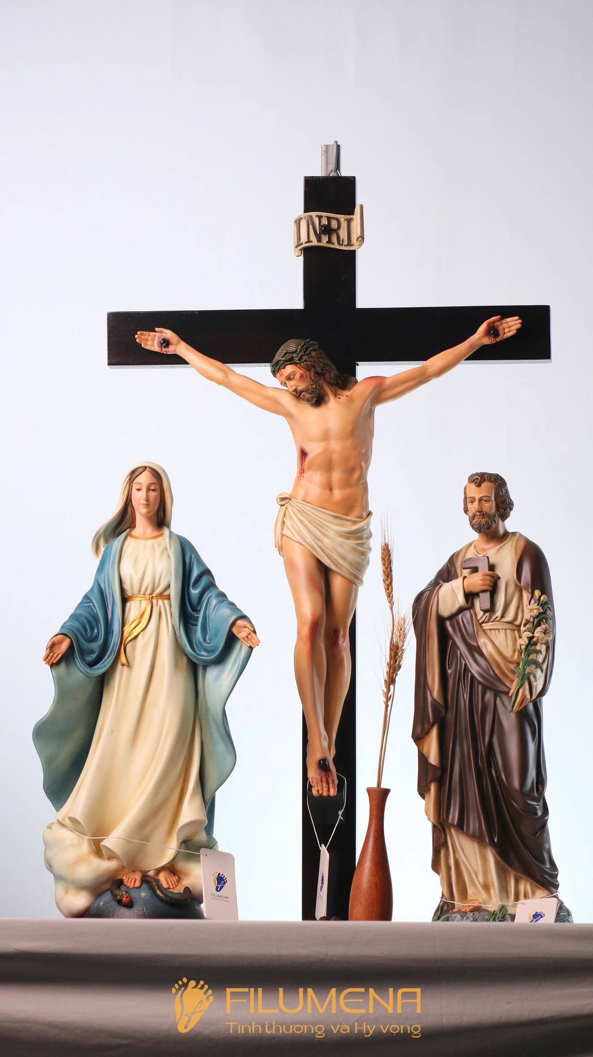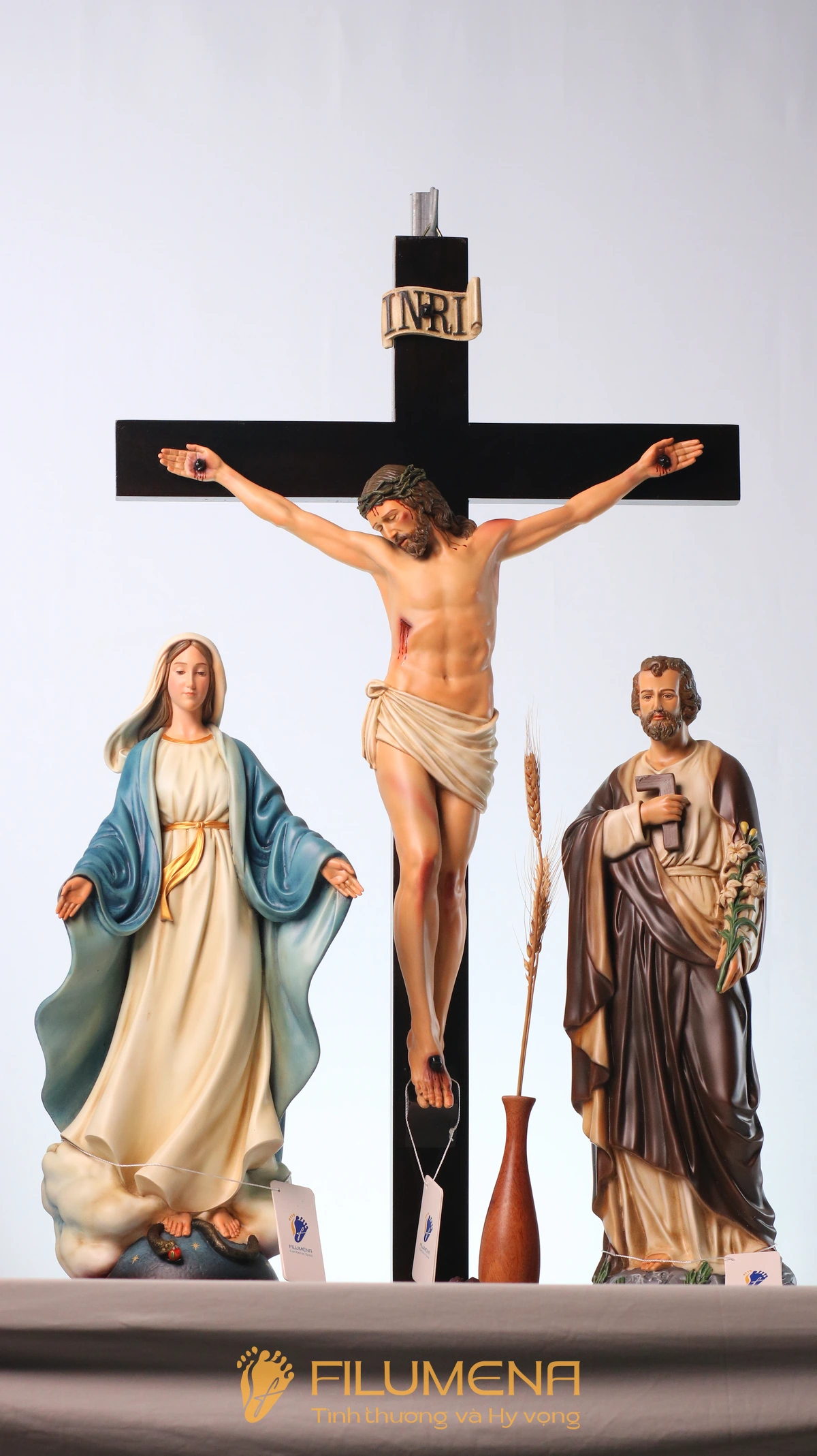 Khi treo Thánh giá Chúa gỗ lát 80 x 46 cm ở giữa, đặt Đức Mẹ Ban Ơn 50 cm màu xanh dương bên trái và Thánh Giuse 50 cm màu nâu bên phải, anh/chị sẽ có ngay một bàn thờ Chúa 50 cm hài hòa, cổ điển, rất dễ cầu nguyện: