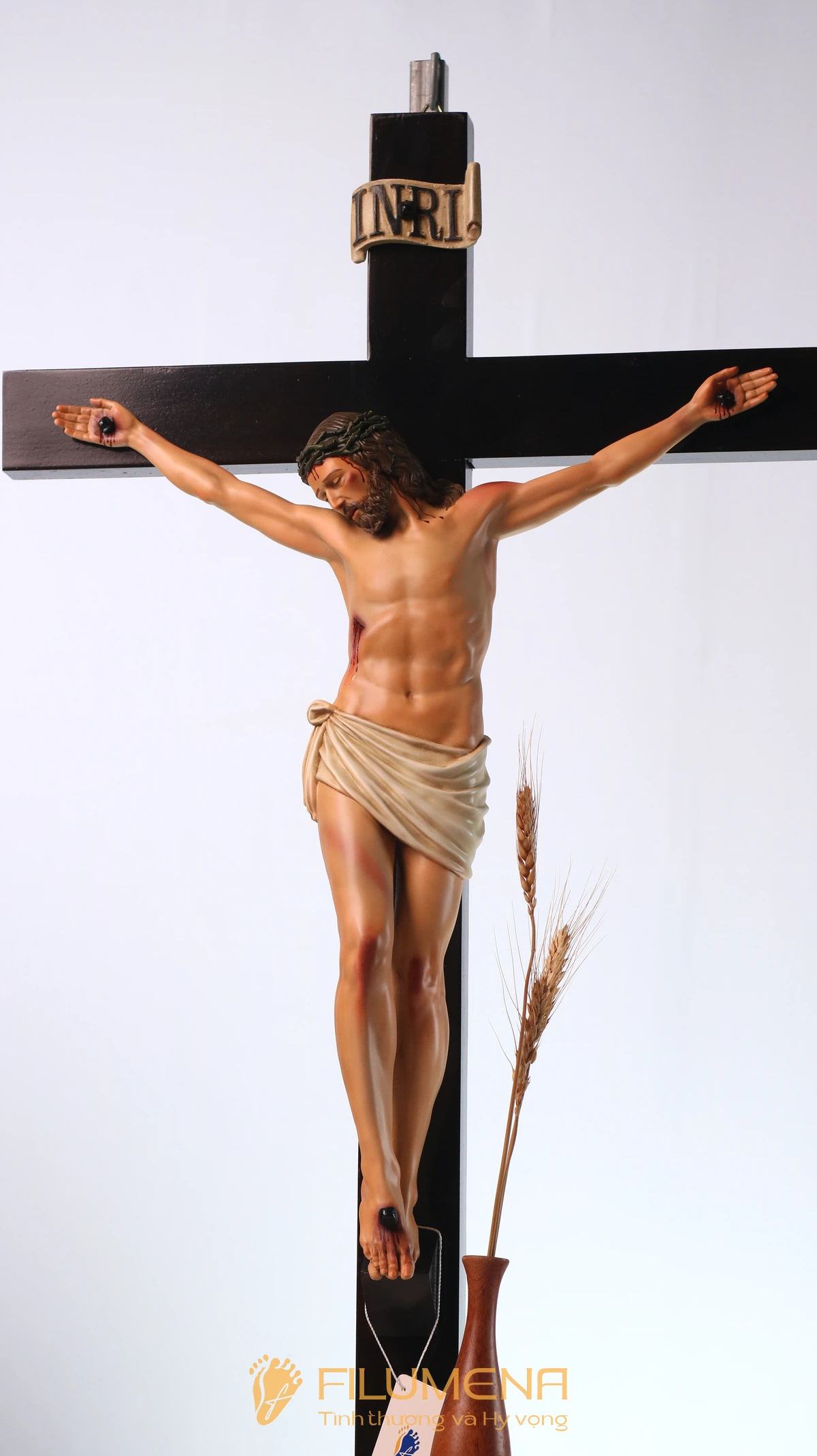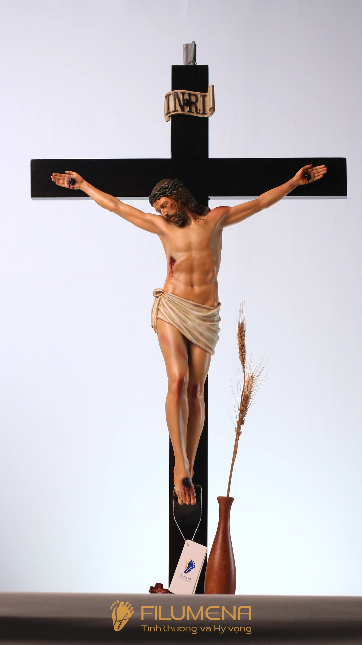 Ở trung tâm là Thánh giá Chúa bằng gỗ lát kích thước 80 x 46 cm, treo trên tường phía sau bàn thờ. Gỗ lát vân đẹp, màu nâu trầm, tạo nền vững chãi và sang trọng cho tượng Chúa chịu nạn (tùy mẫu anh/chị chọn). Kích thước 80 x 46 cm vừa đủ lớn để nổi bật trên tường phòng khách, nhưng không quá “áp đảo” không gian; khi treo trên nền tường kem hoặc vàng nhạt, Thánh giá trở thành điểm quy chiếu rõ ràng cho mọi ánh nhìn trong căn phòng.