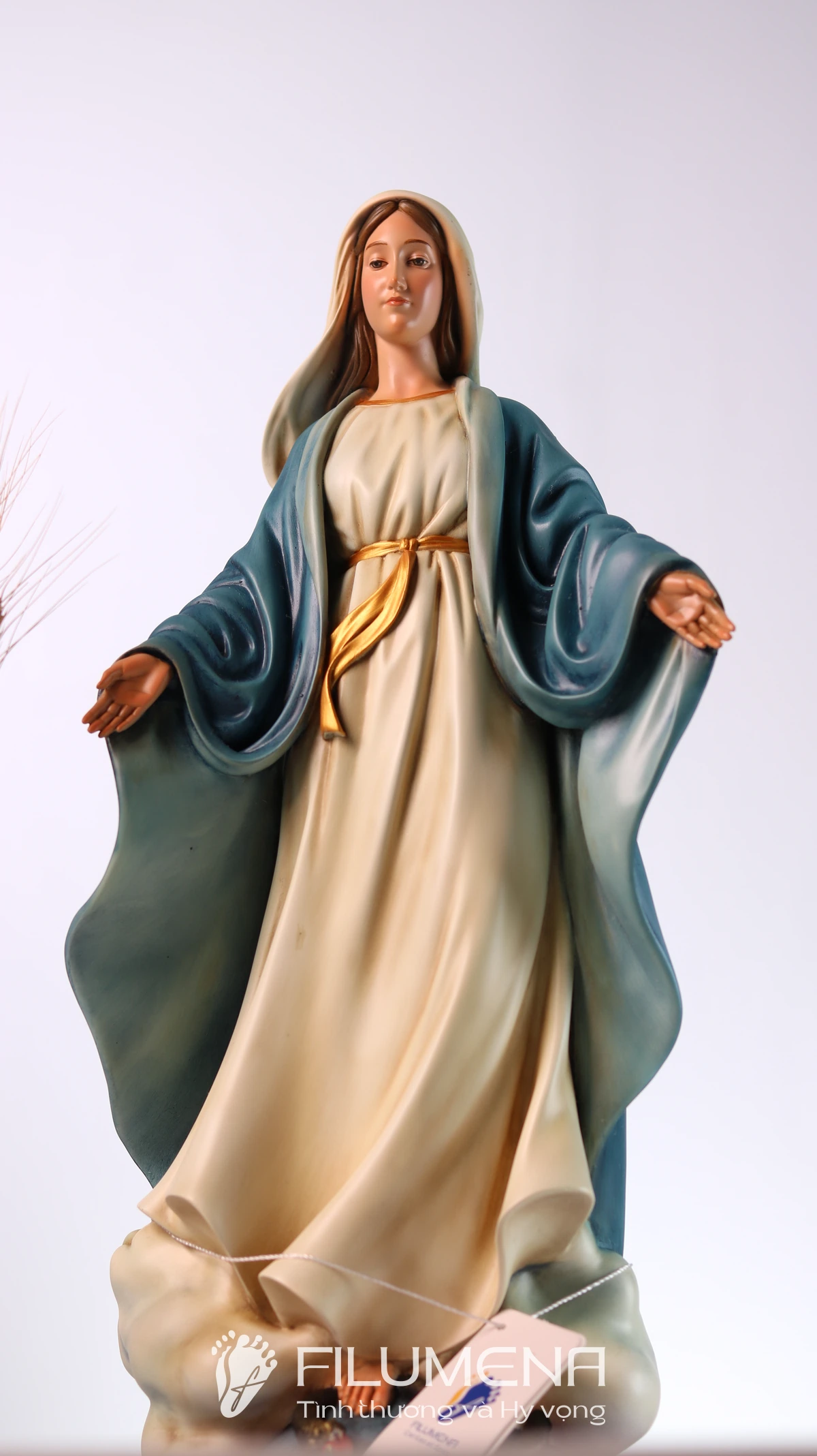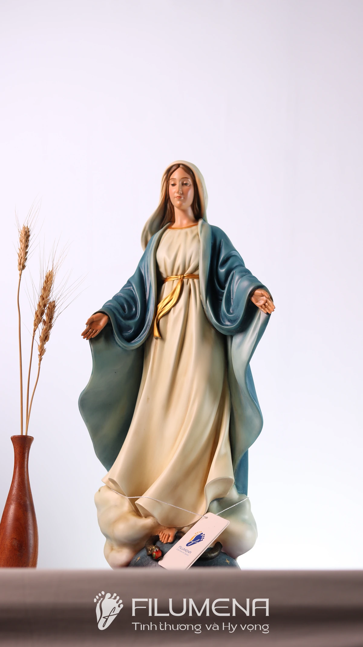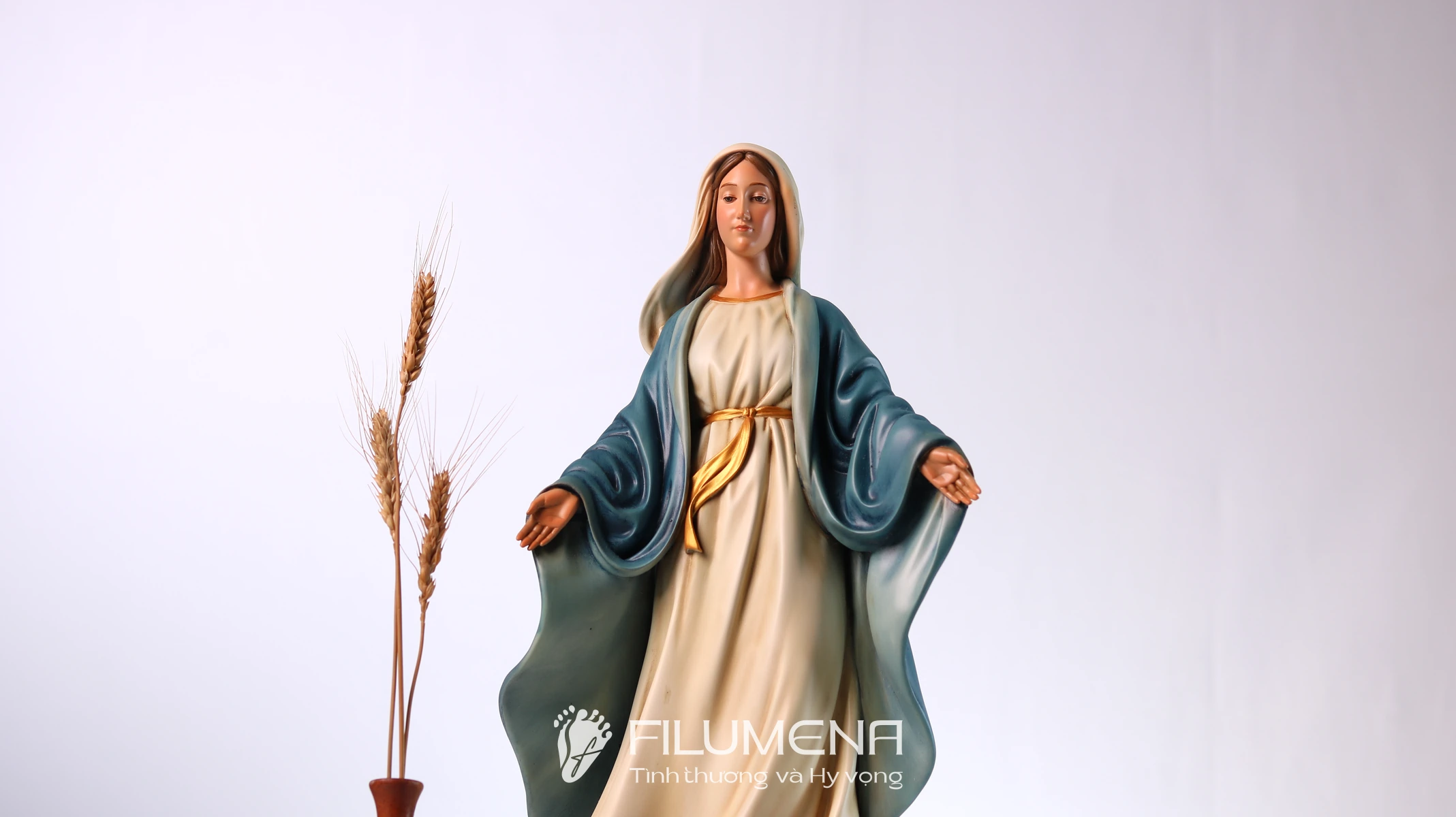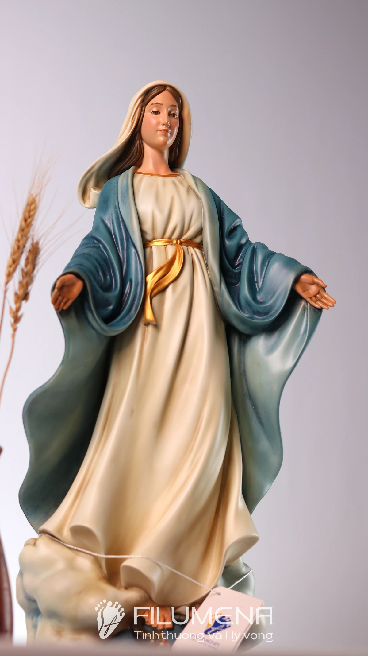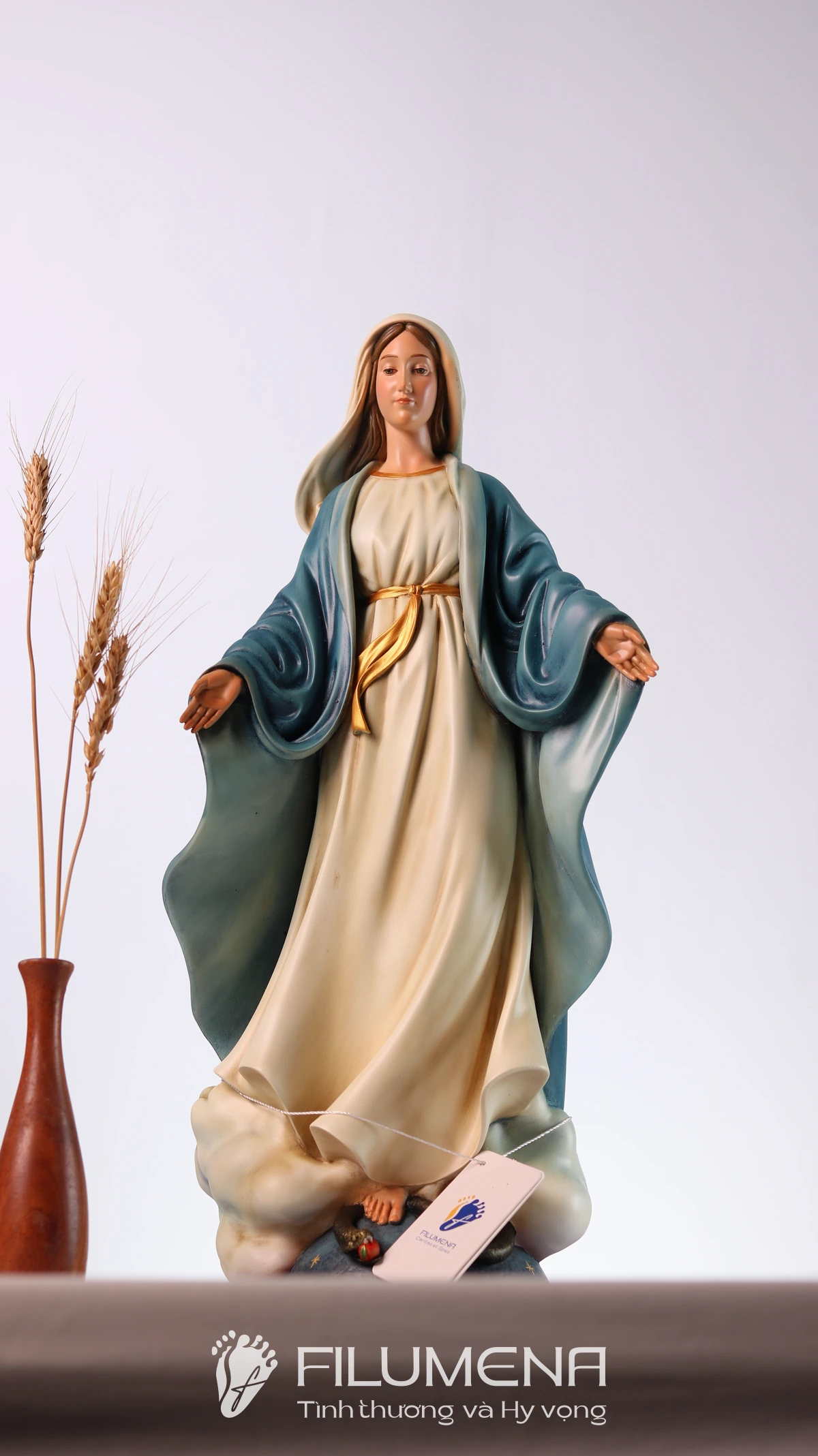 Bên trái là tượng Đức Mẹ Ban Ơn 50 cm màu xanh dương cổ điển. Mẹ khoác áo choàng xanh dương truyền thống, áo trong màu sáng hơn, viền áo được điểm xuyết vừa đủ, gợi lại hình ảnh Đức Mẹ trong các ảnh tượng kinh điển của Giáo Hội. Mẹ đứng thẳng, hai tay mở rộng, lòng bàn tay hướng xuống như đang nhẹ nhàng tuôn đổ ân sủng trên gia đình. Khuôn mặt Mẹ hiền từ, ánh mắt nhìn xuống dịu dàng, rất dễ đưa người chiêm ngắm vào cầu nguyện, nhất là khi lần chuỗi Mân Côi hay đọc kinh tối chung.