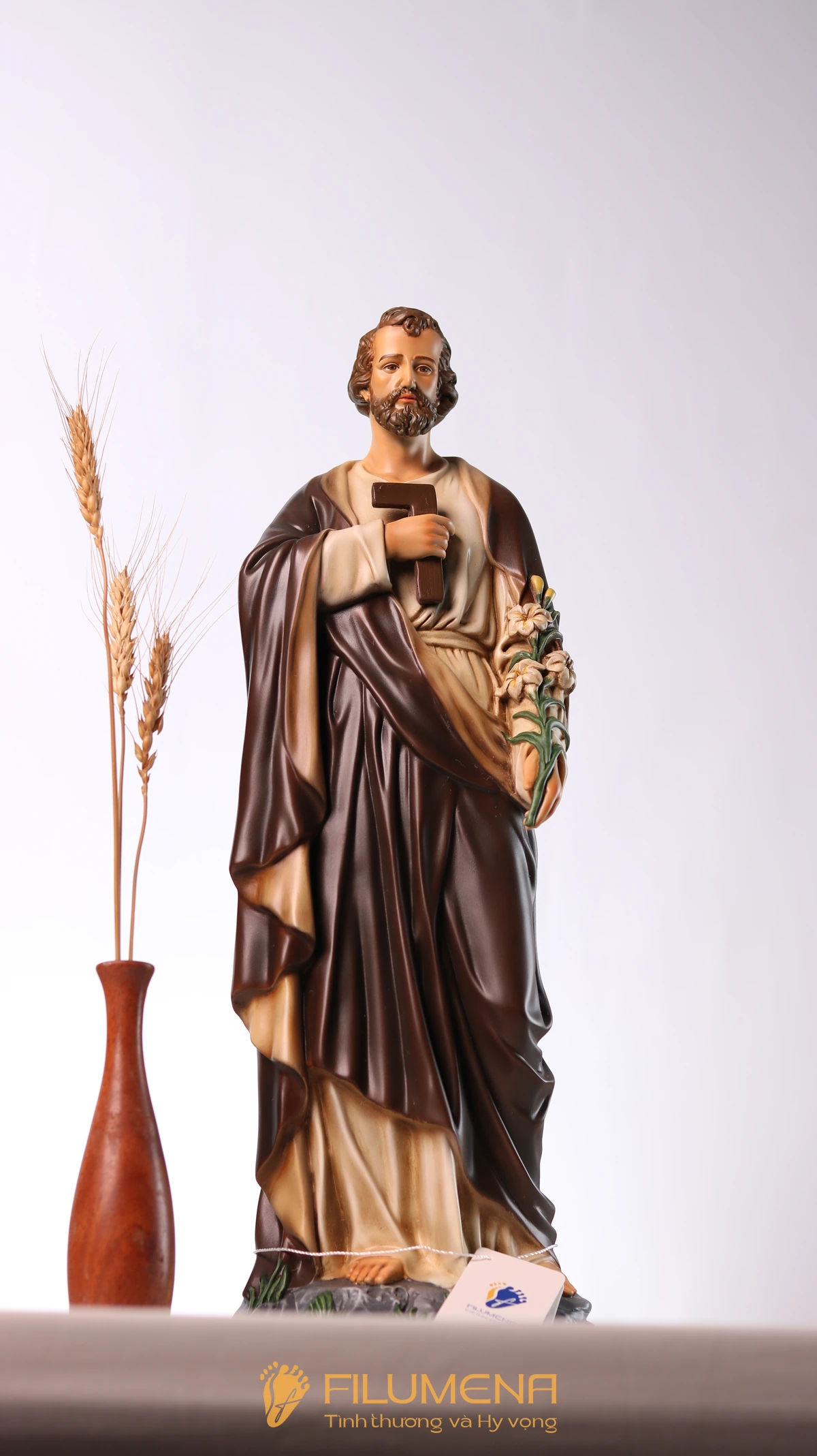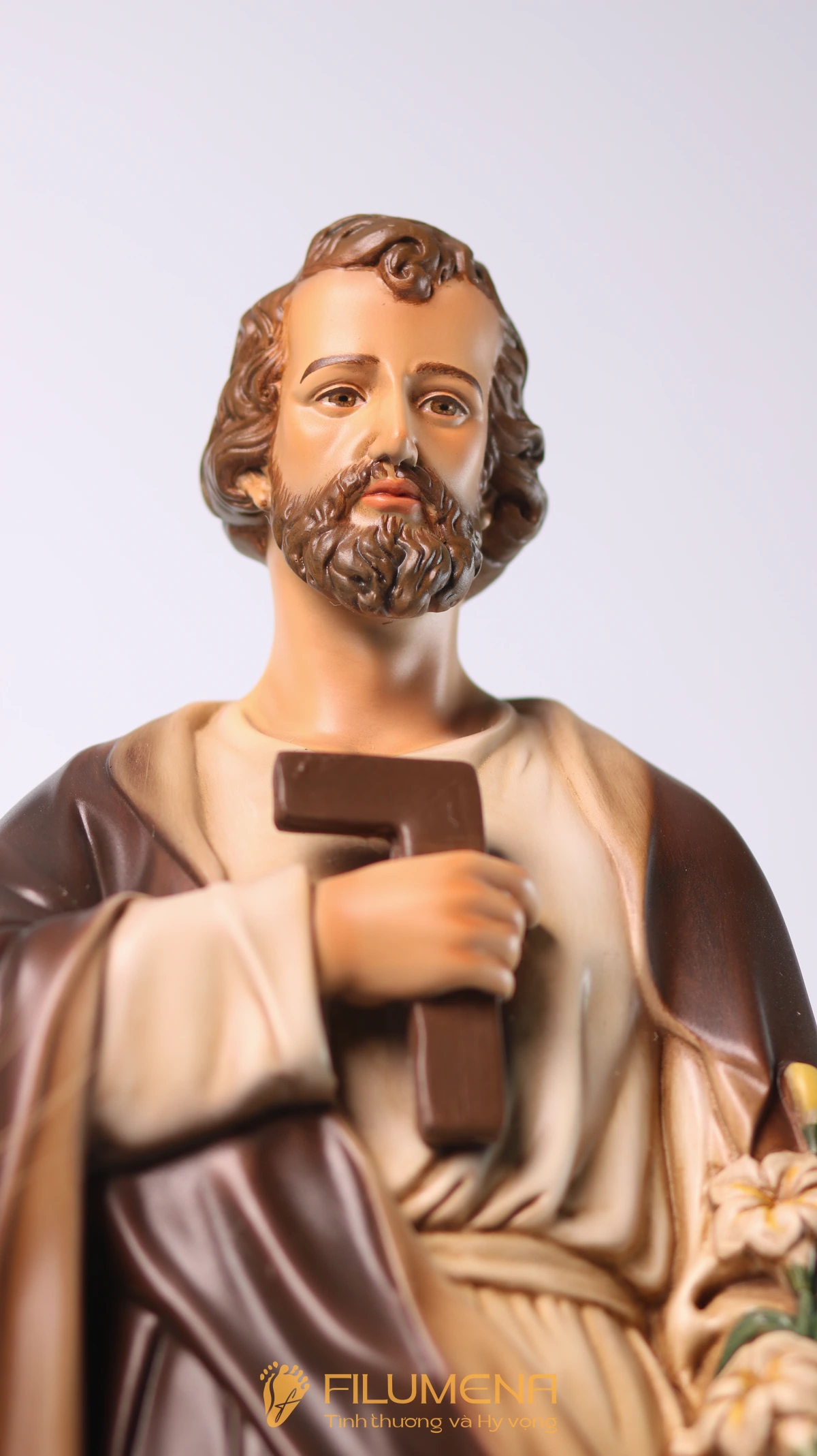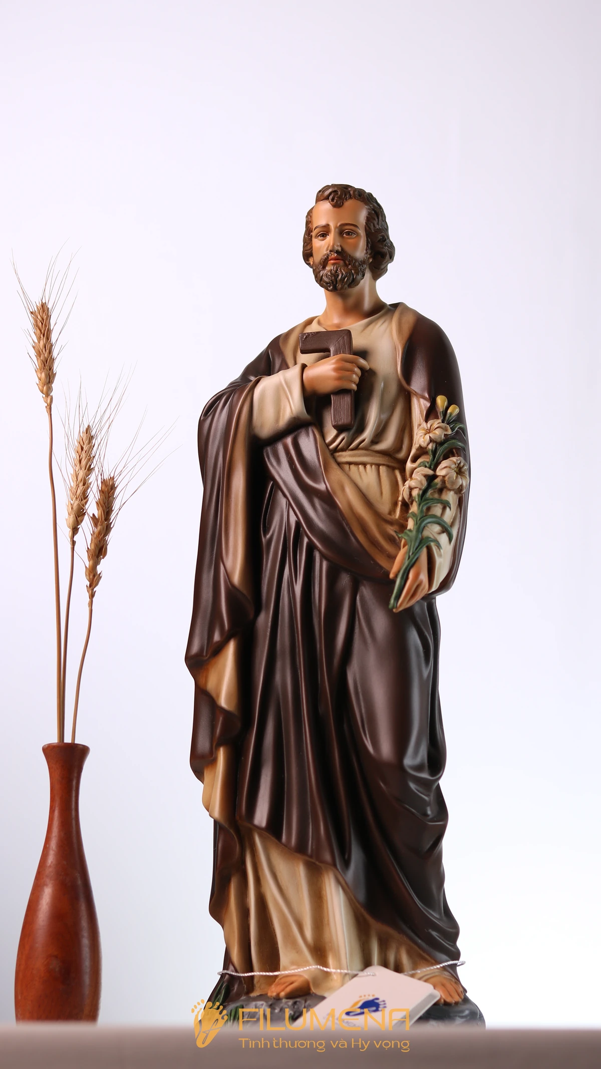 Bên phải là tượng Thánh Giuse 50 cm màu nâu cổ điển. Thánh nhân khoác áo choàng nâu trầm, áo trong sáng hơn, dáng đứng vững chãi, tay nâng nhành huệ hoặc dụng cụ nghề mộc (tùy phiên bản), gợi lại hình ảnh người cha hiền, vừa lao động âm thầm vừa tin tưởng phó thác cho Thiên Chúa. Nét mặt Thánh Giuse trầm lắng nhưng hiền hậu, rất thích hợp để các gia trưởng và những người đang mang nhiều trách nhiệm trong gia đình, công việc tìm đến xin ngài bầu cử và nâng đỡ.