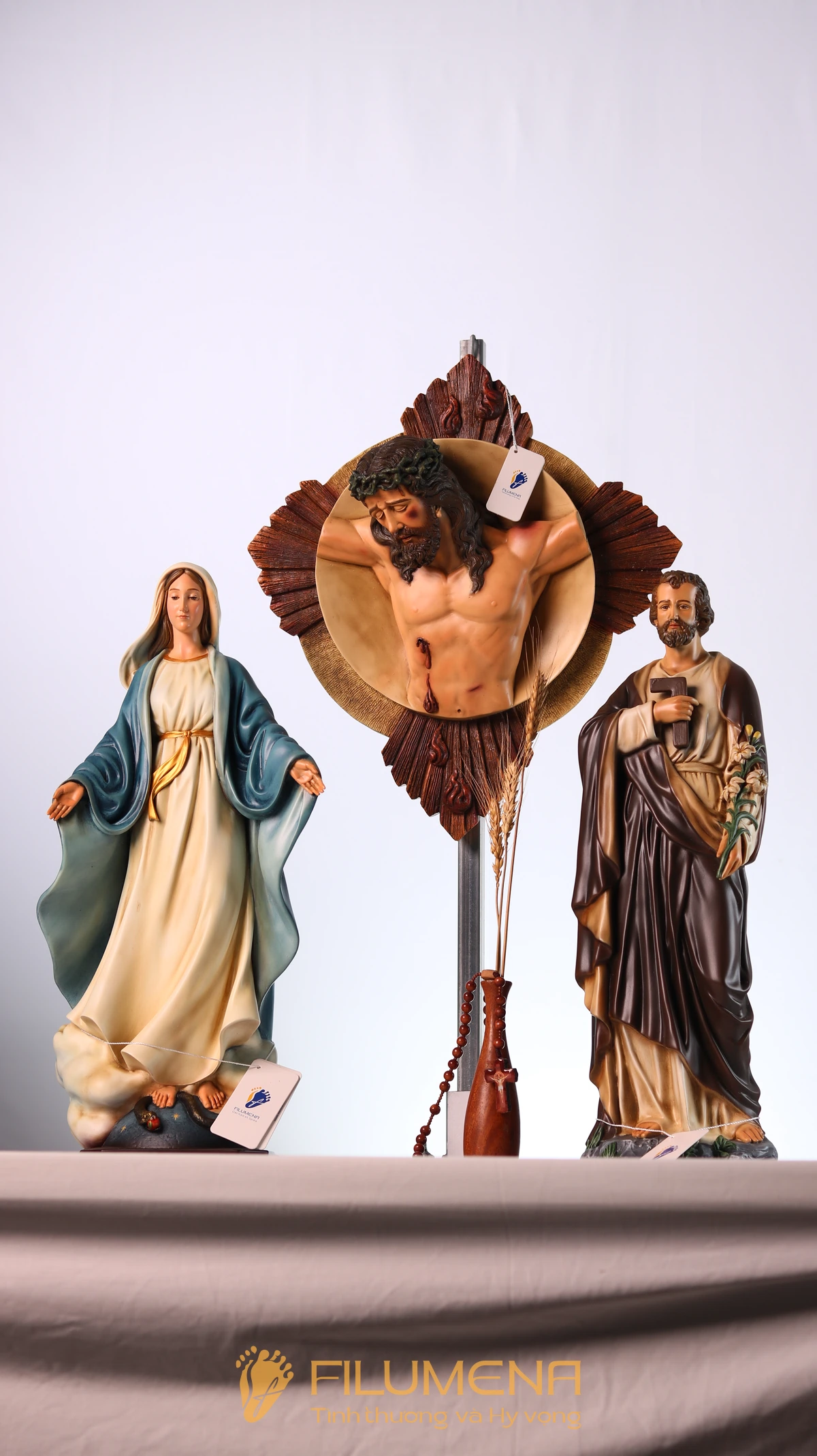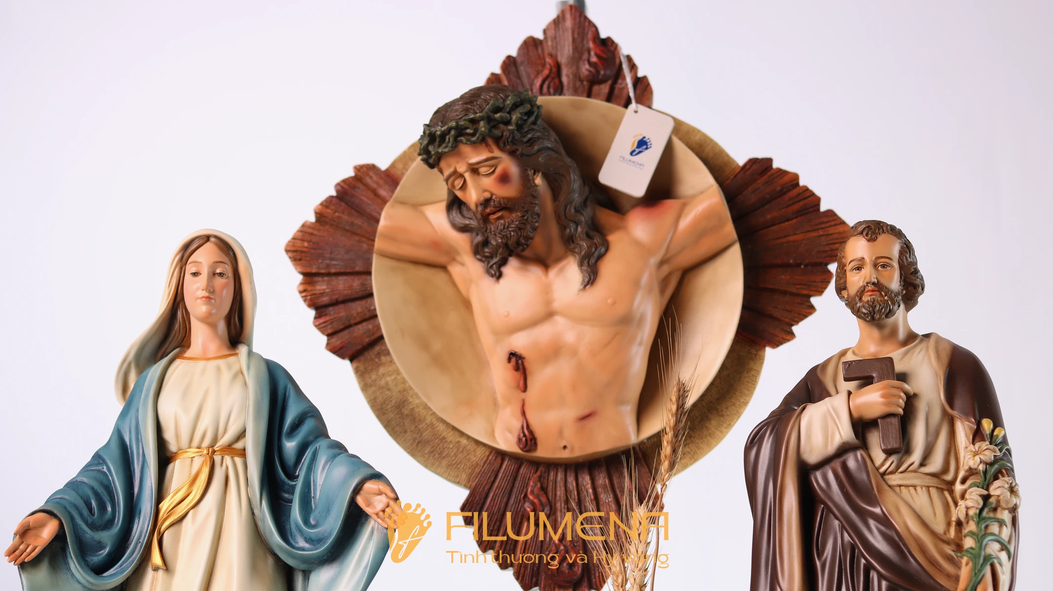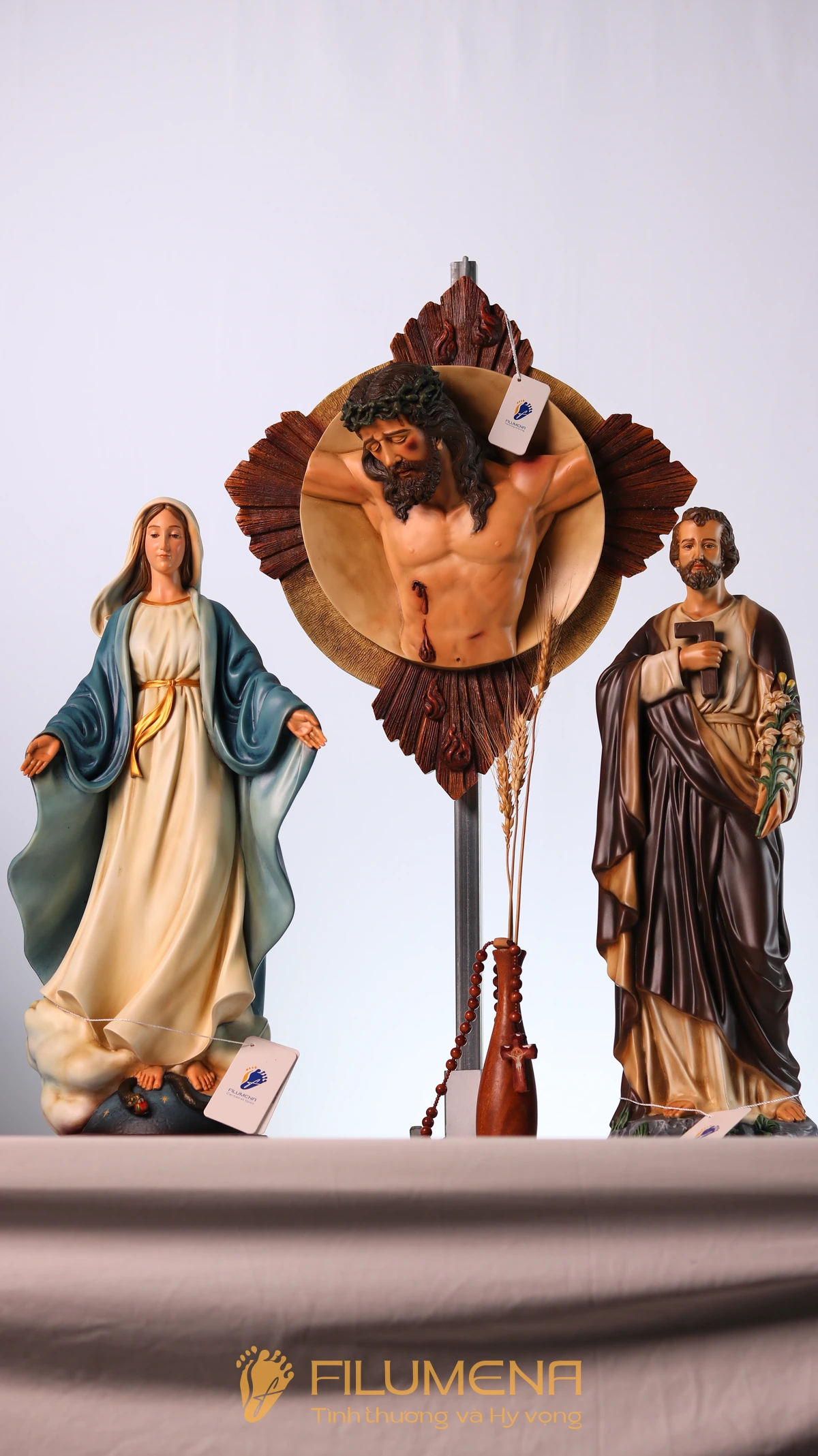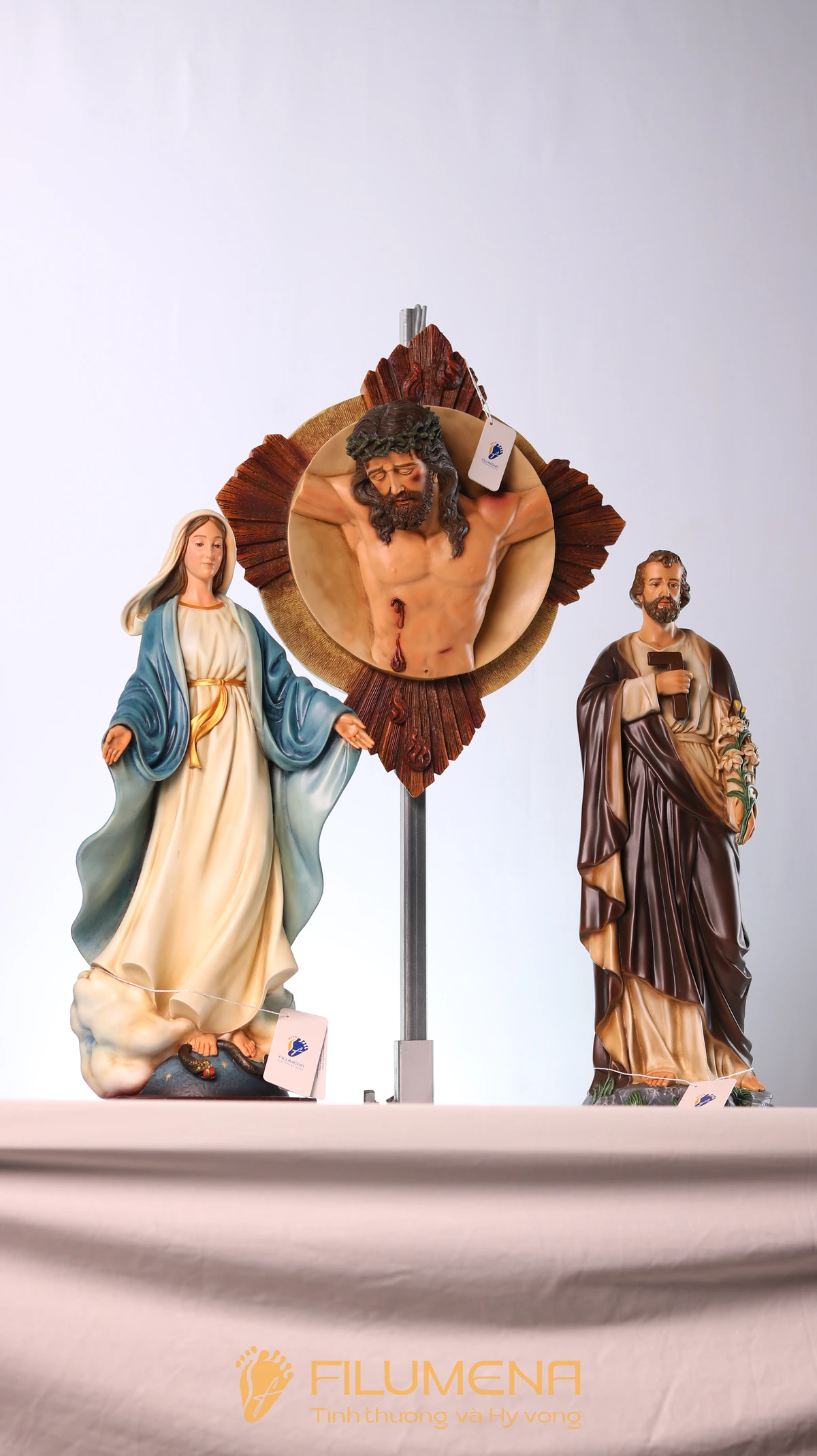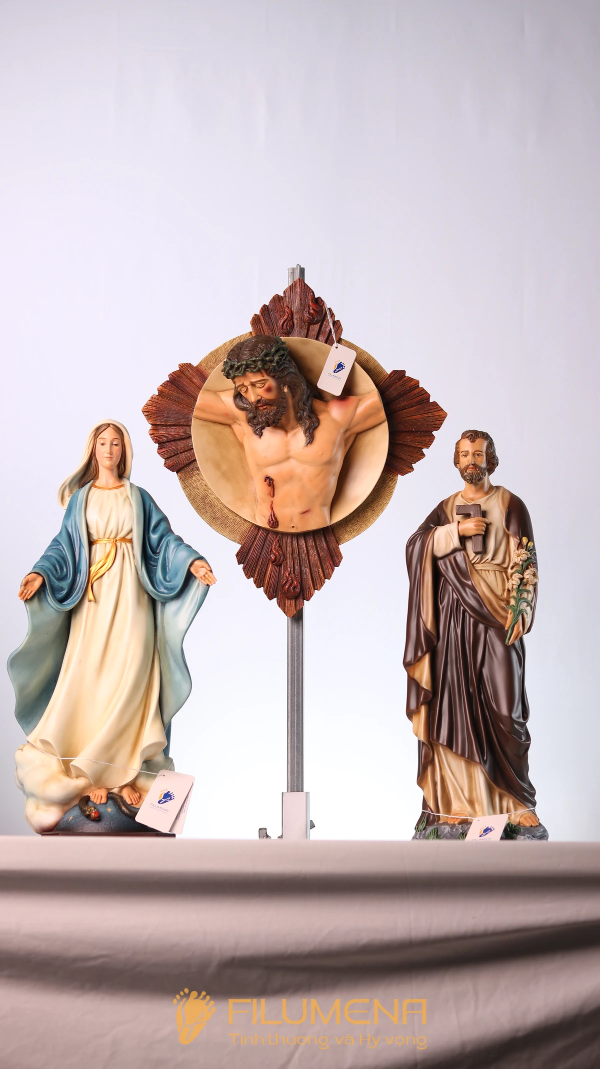 Bộ tượng Bàn thờ Chúa 50 cm tông màu cổ điển M1 với phù điêu Chúa Chuộc Tội 40 cm được Filumena thiết kế như một “bộ ba” hoàn chỉnh cho bàn thờ phòng khách, phòng nguyện gia đình hoặc nhà nguyện nhỏ, khi anh/chị muốn bộ tượng vừa trang trọng, vừa gọn gàng, dễ bày trí.