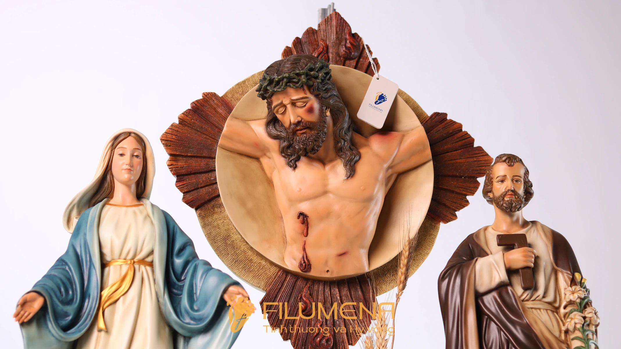 Khi treo phù điêu Chúa Chuộc Tội 40 cm ở giữa, bên dưới là hai tượng Đức Mẹ Ban Ơn 50 cm và Thánh Giuse 50 cm, gia đình có ngay một bố cục bàn thờ cổ điển, rõ ràng và rất dễ cầu nguyện: