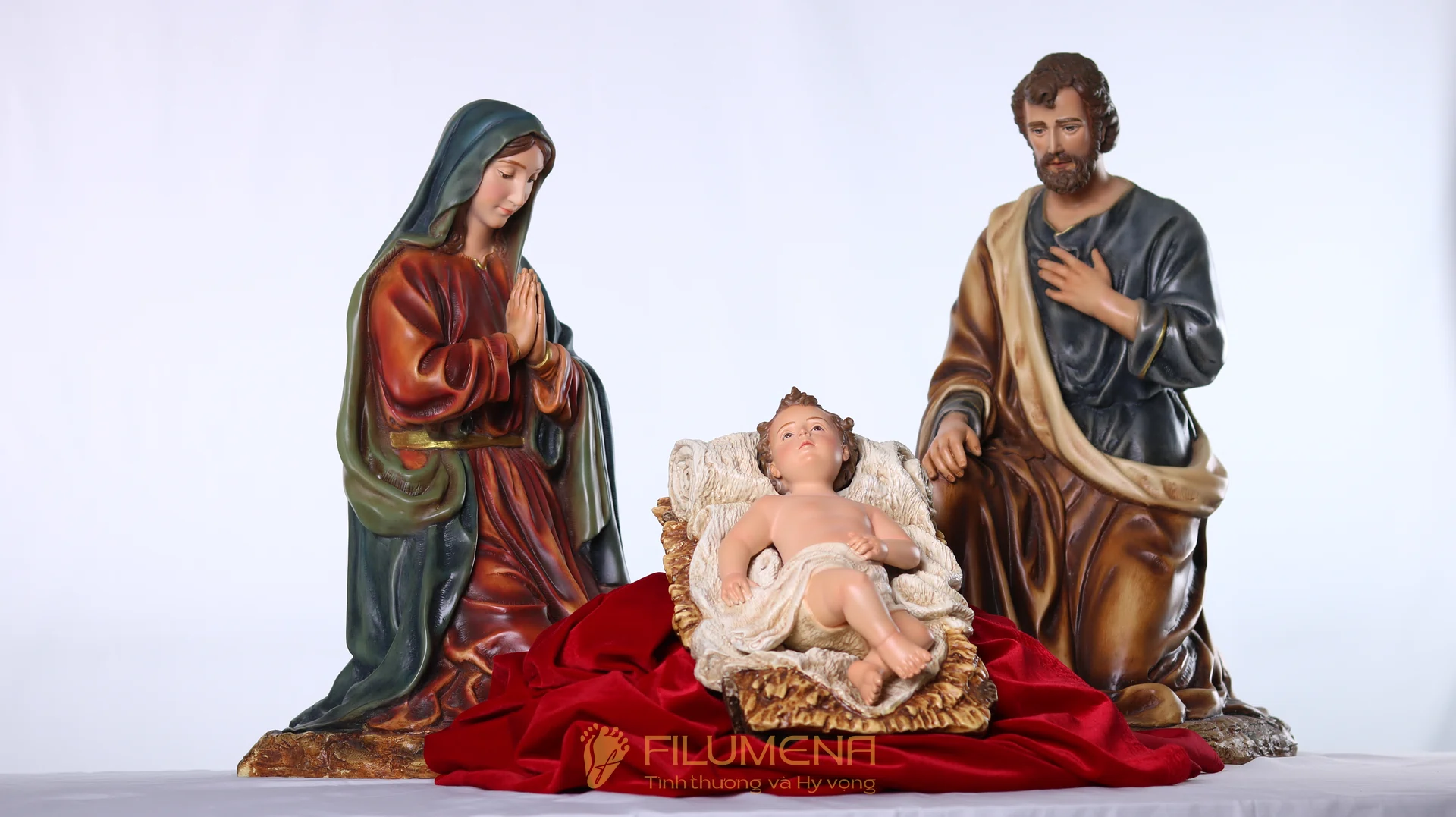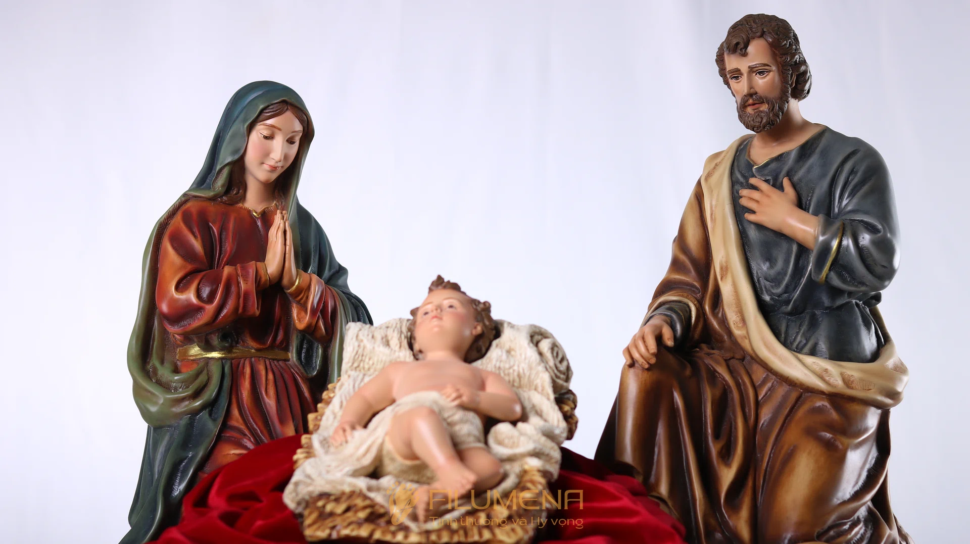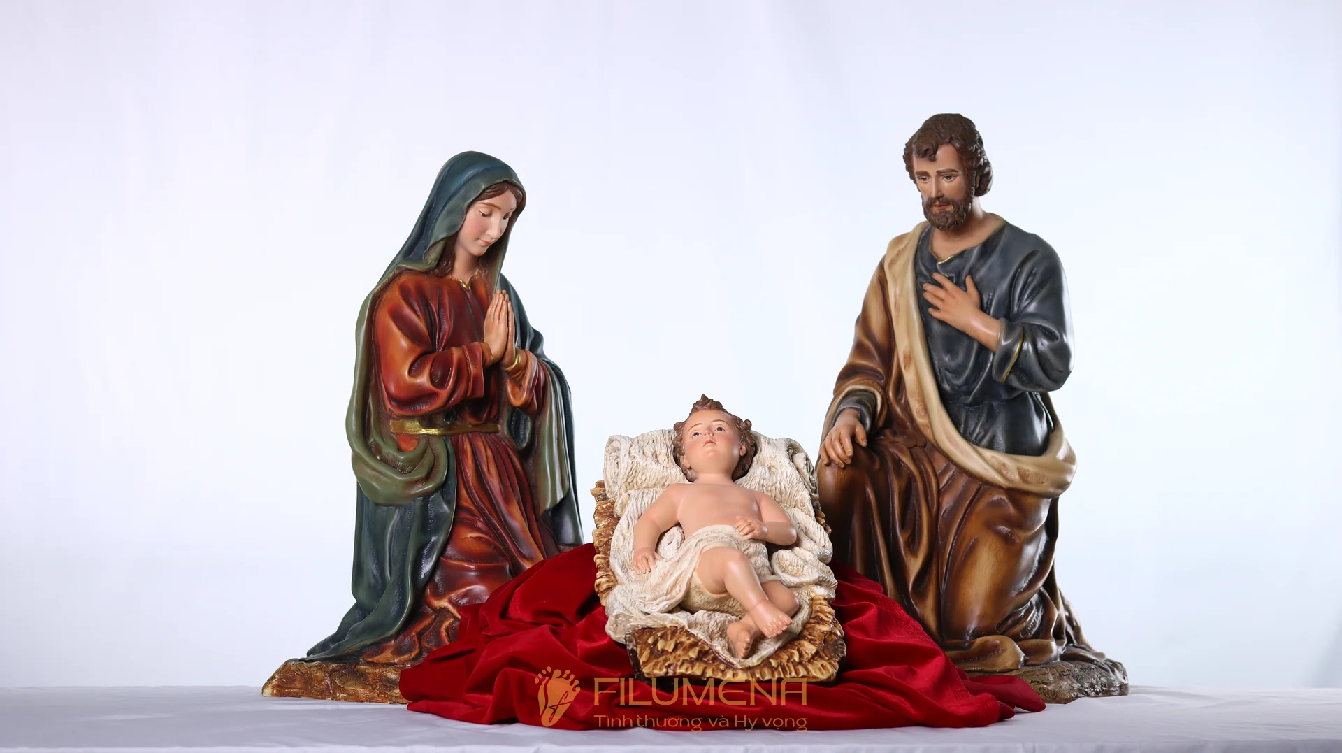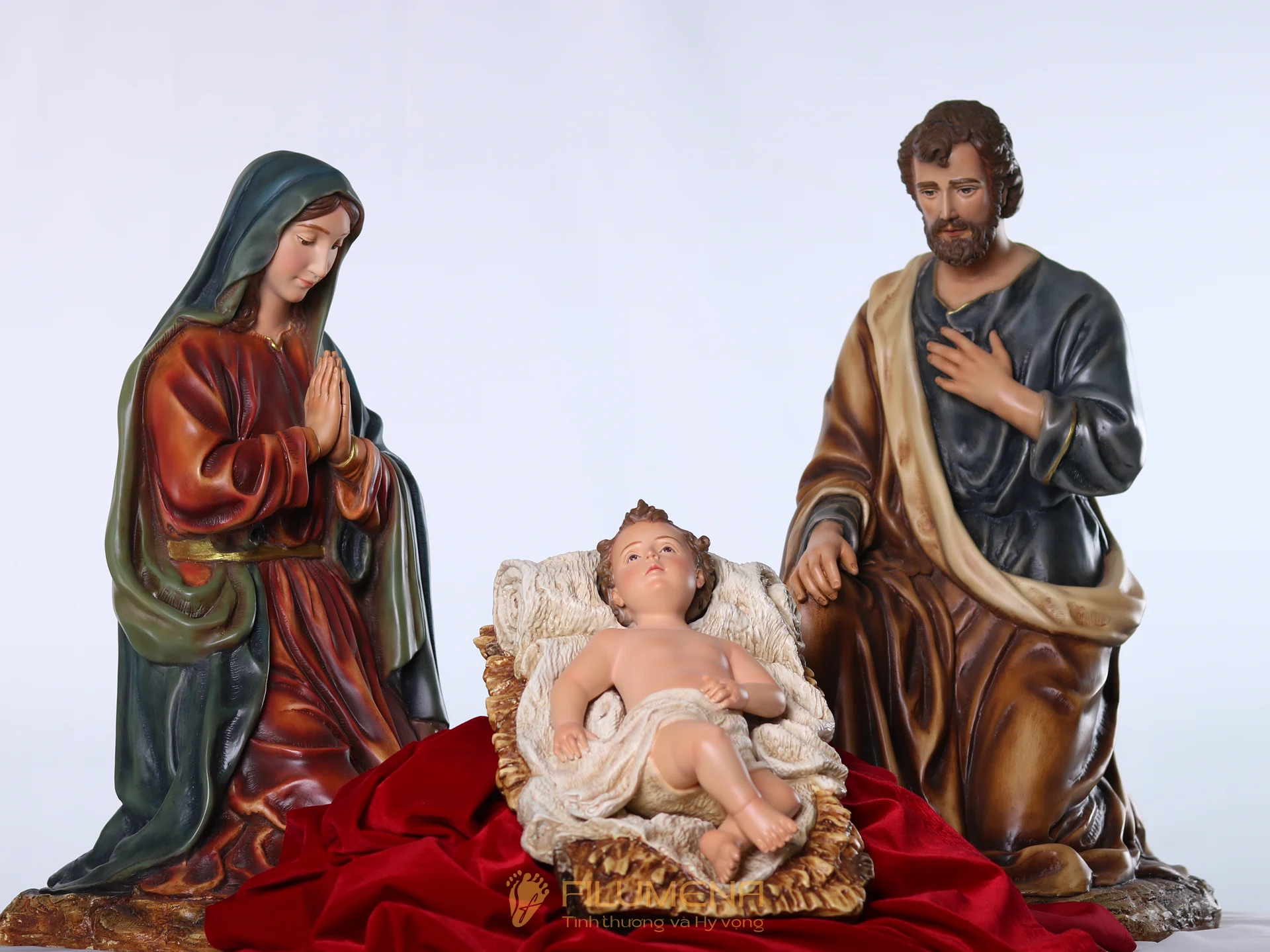 Ý nghĩa: Bộ tượng nhấn vào trung tâm mầu nhiệm Nhập Thể – Hài Đồng là điểm hội tụ ánh nhìn; Đức Mẹ và Thánh Giuse tạo vòng ôm che chở, gợi lời cầu nguyện ấm áp trong gia đình.