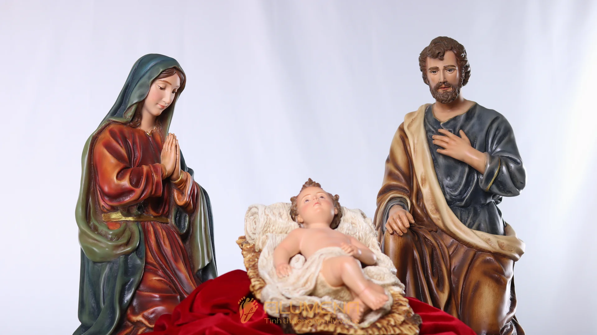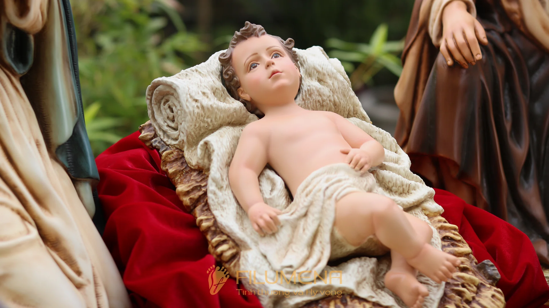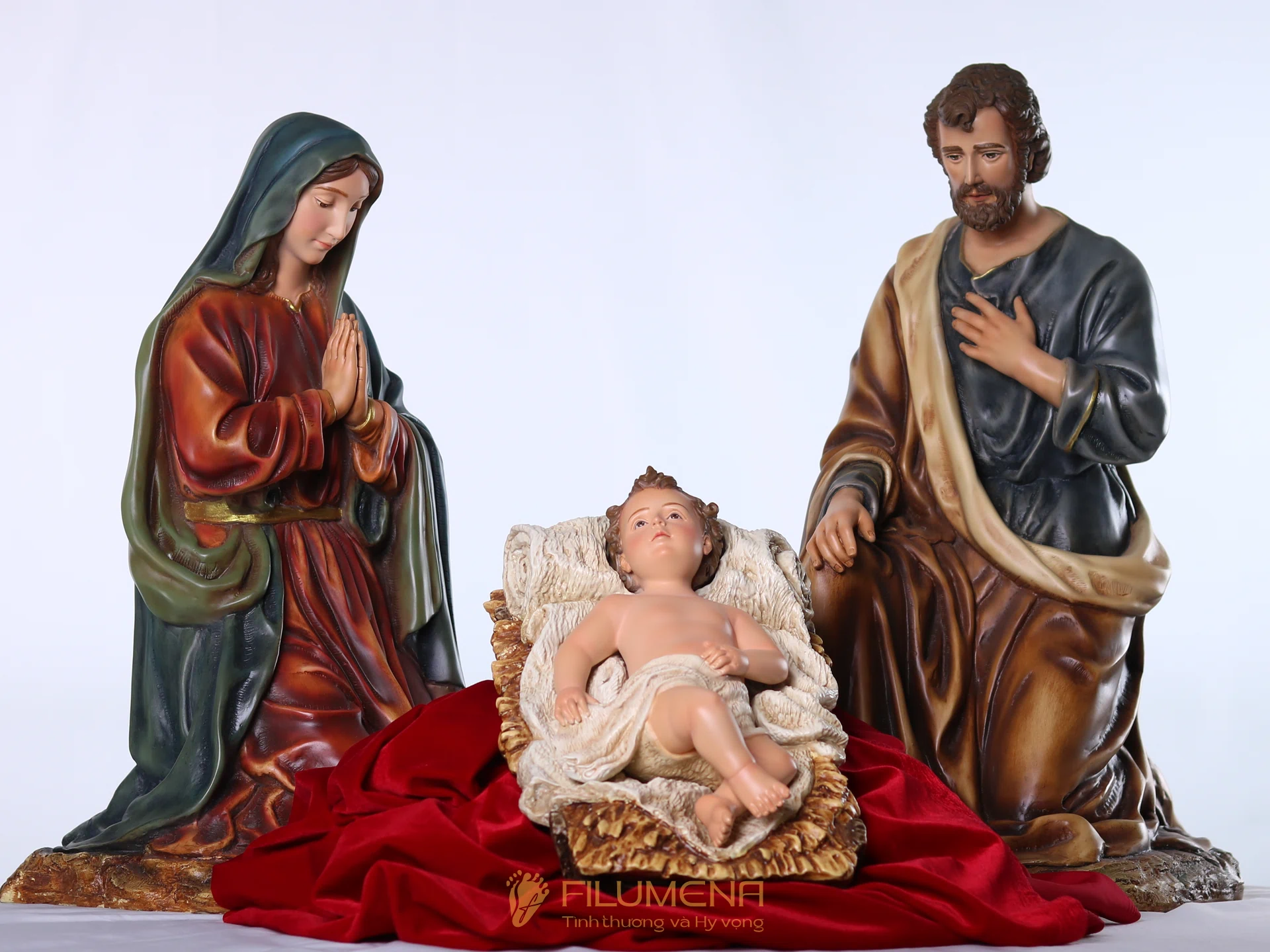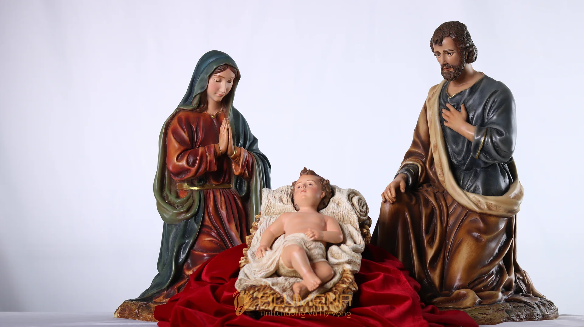 Ý nghĩa: Bộ tượng nhấn vào trung tâm mầu nhiệm Nhập Thể – Hài Đồng là điểm hội tụ ánh nhìn; Đức Mẹ và Thánh Giuse tạo vòng ôm che chở, gợi lời cầu nguyện ấm áp trong gia đình.