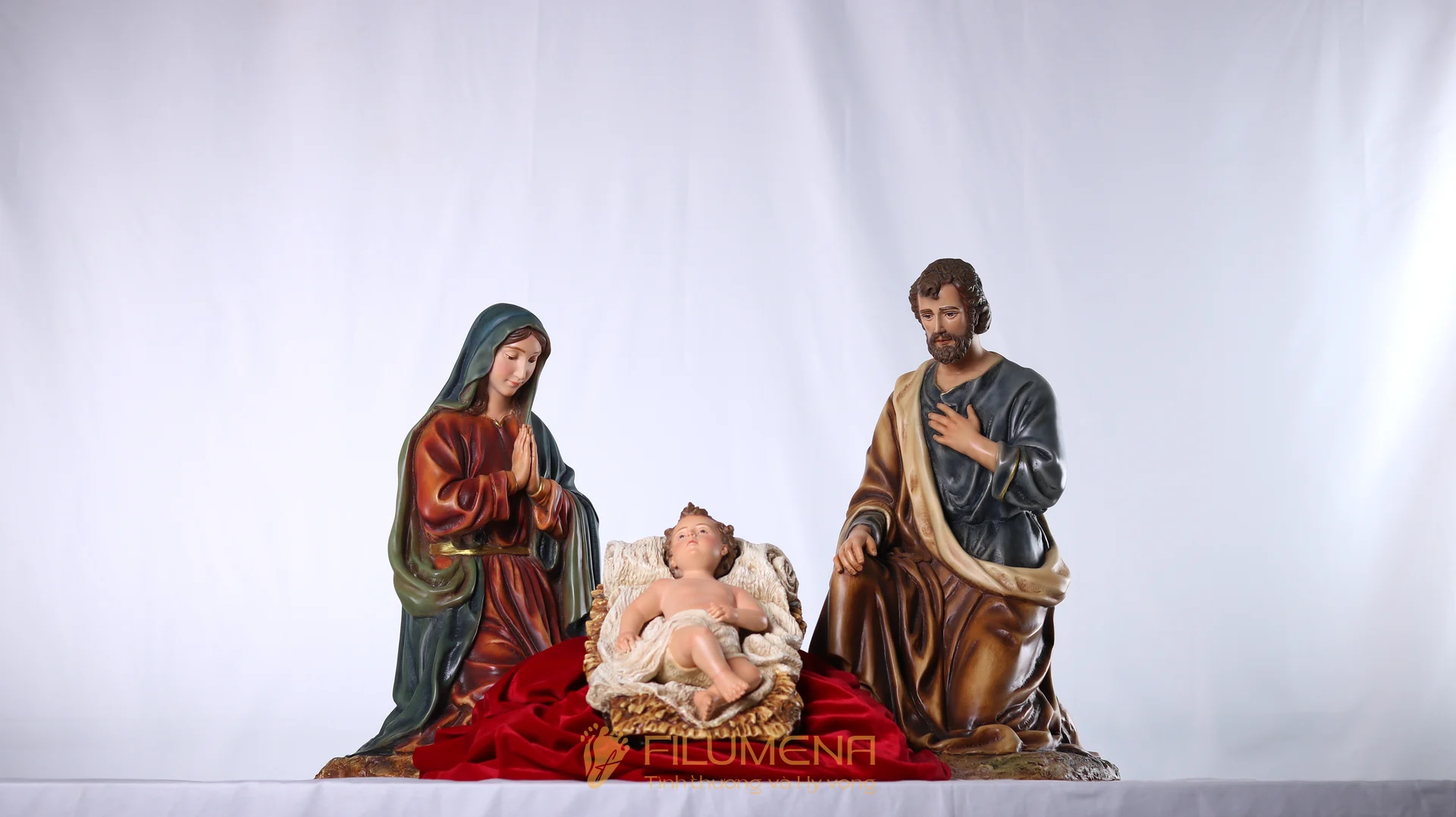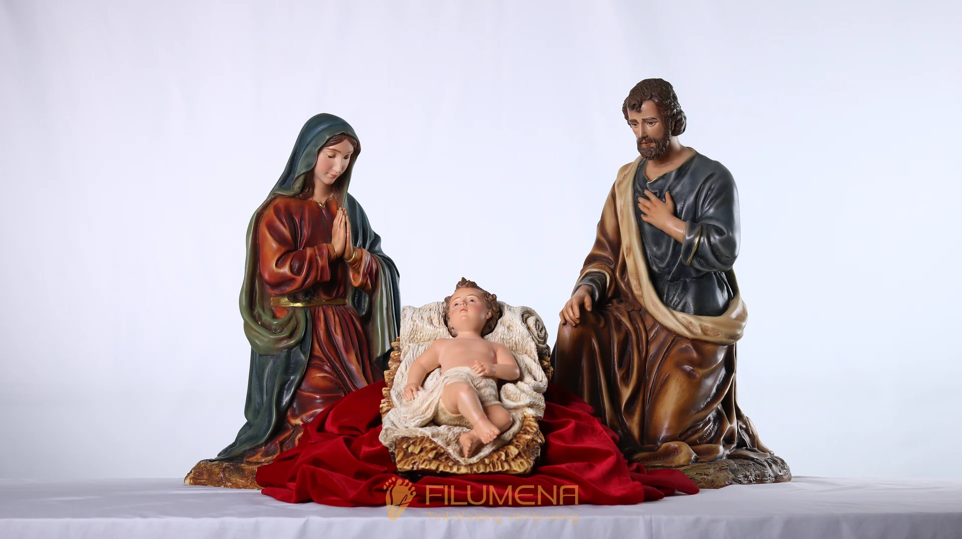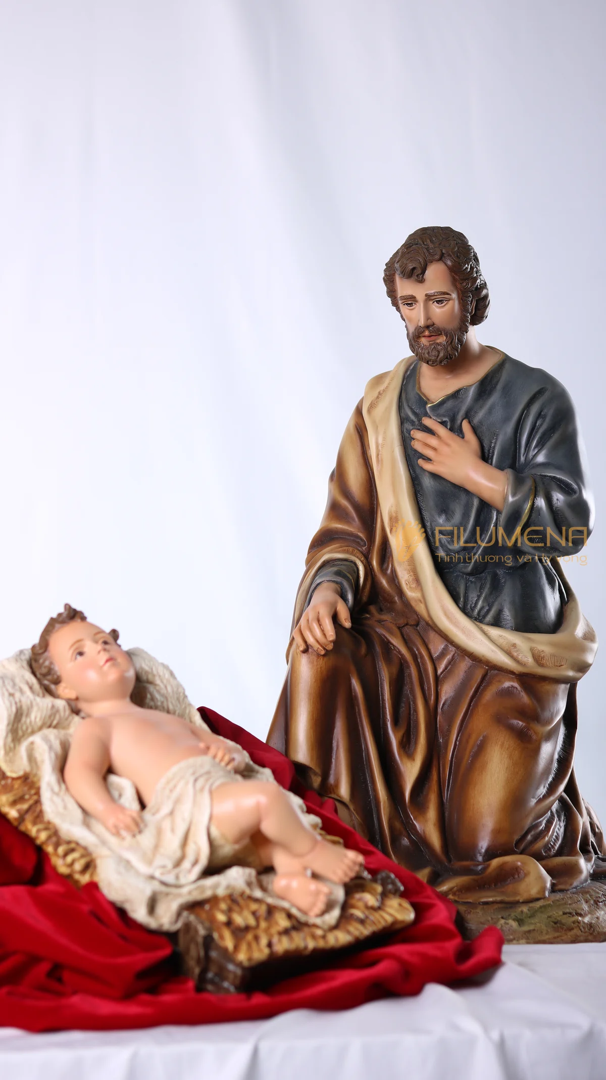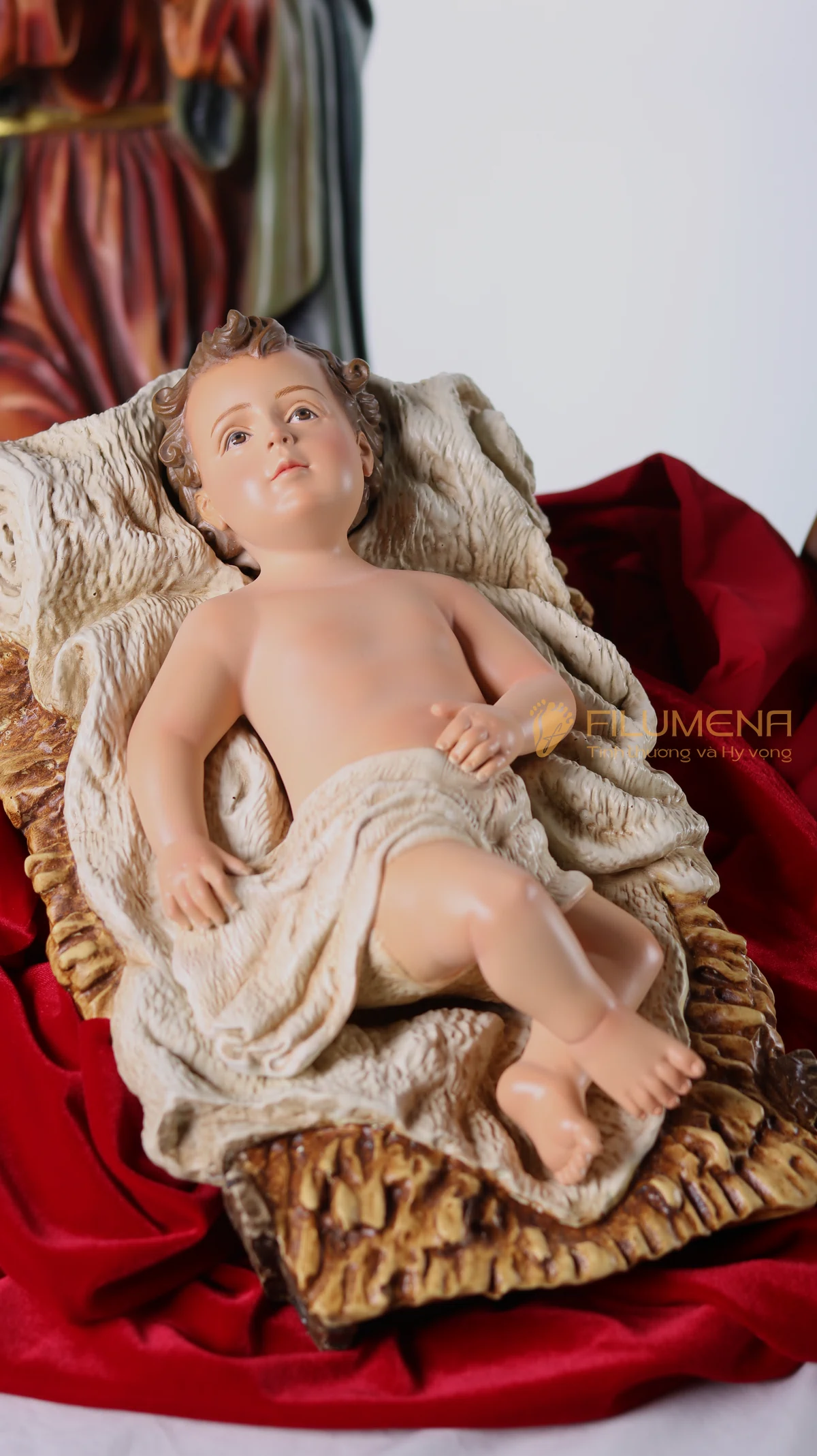 Ý nghĩa: Bộ tượng nhấn vào trung tâm mầu nhiệm Nhập Thể – Hài Đồng là điểm hội tụ ánh nhìn; Đức Mẹ và Thánh Giuse tạo vòng ôm che chở, gợi lời cầu nguyện ấm áp trong gia đình.
