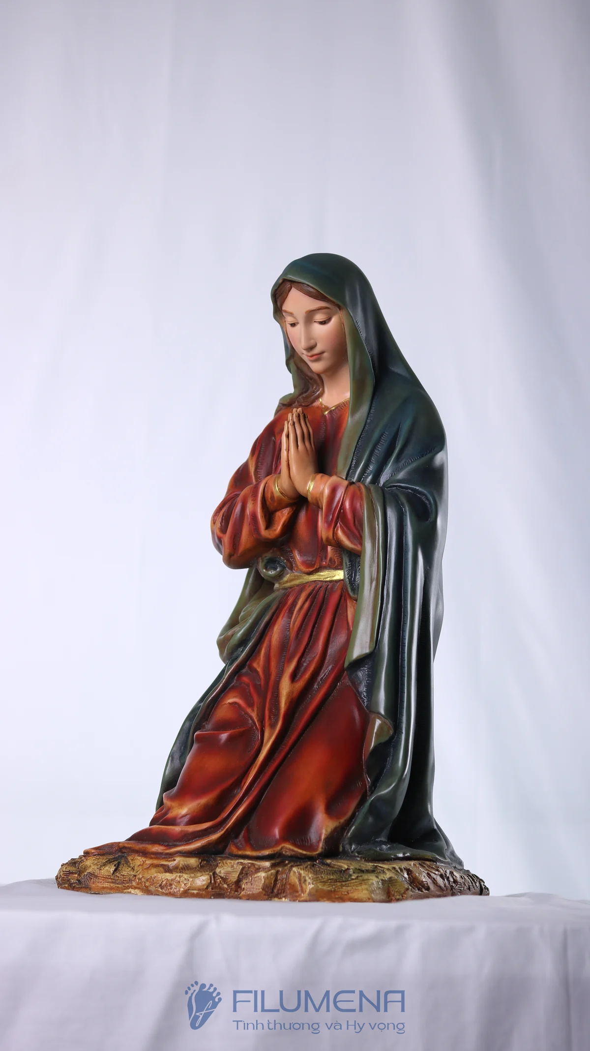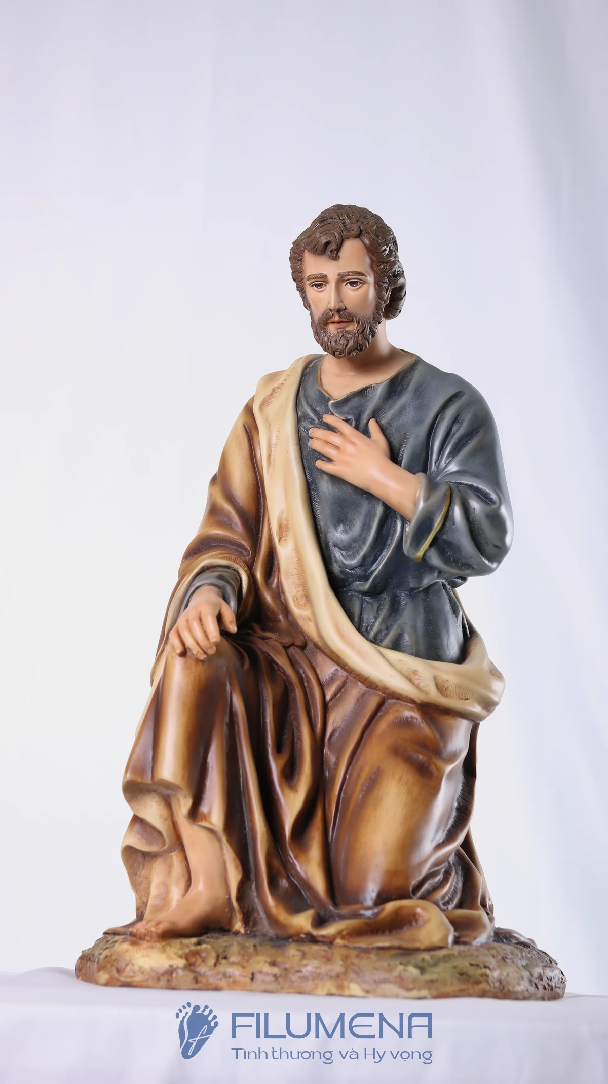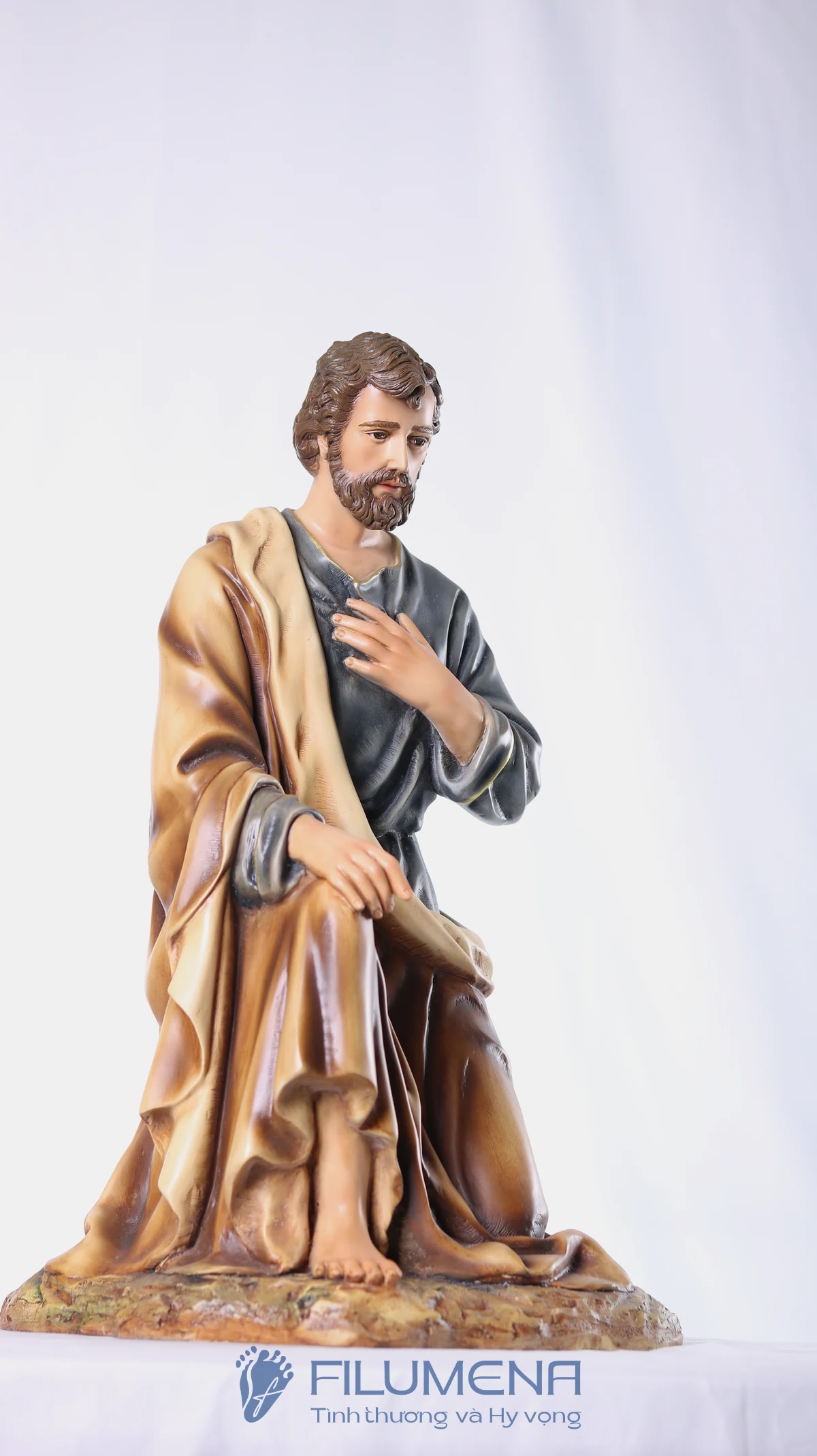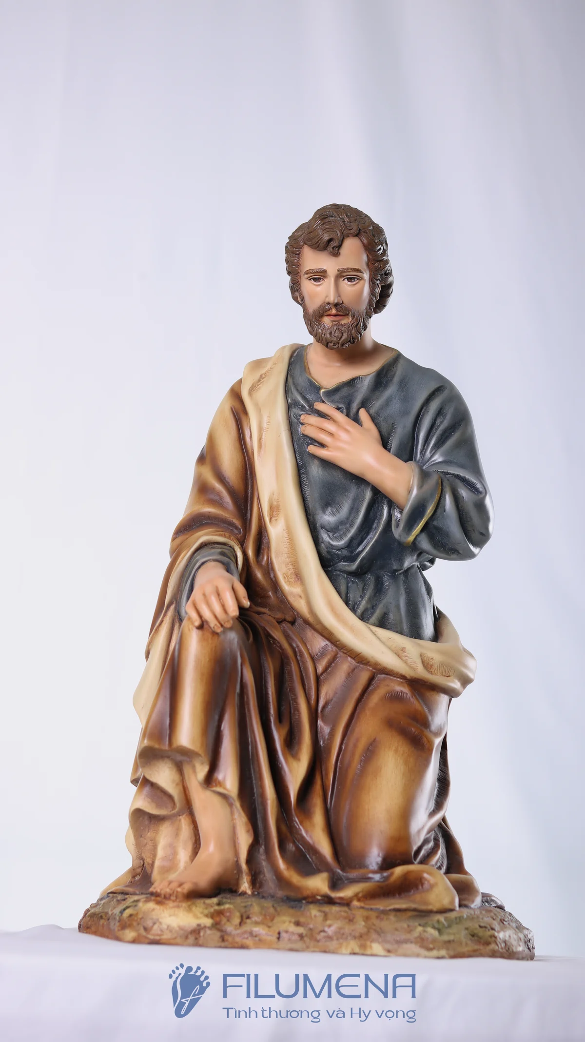 Bộ tượng Giáng Sinh 50 cm (3 nhân vật: Chúa Hài Đồng, Đức Mẹ, Thánh Giuse quỳ) tông màu trầm cổ điển. Tượng bằng chất liệu bột đá + resin, sơn tay nhiều lớp, bền màu – dễ bày trí bàn thờ gia đình. Có các cỡ 20/30/50 cm. Mỗi tác phẩm đóng góp cho hoạt động bác ái cùng Quỹ Filumena Tình Thương Và Hy Vọng. (C) Filumena Art 2025.