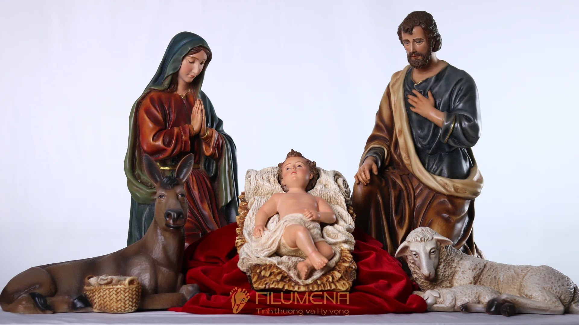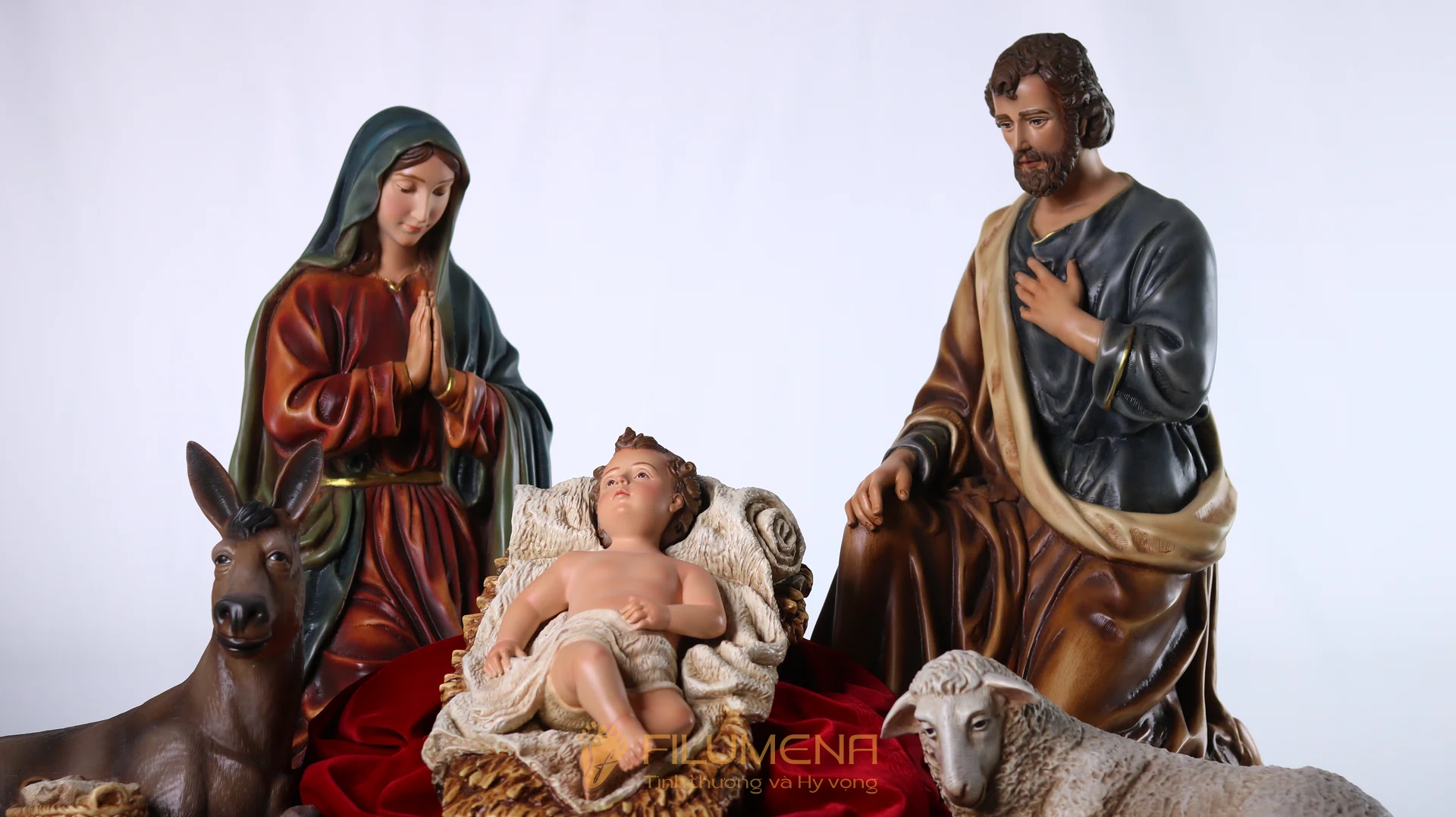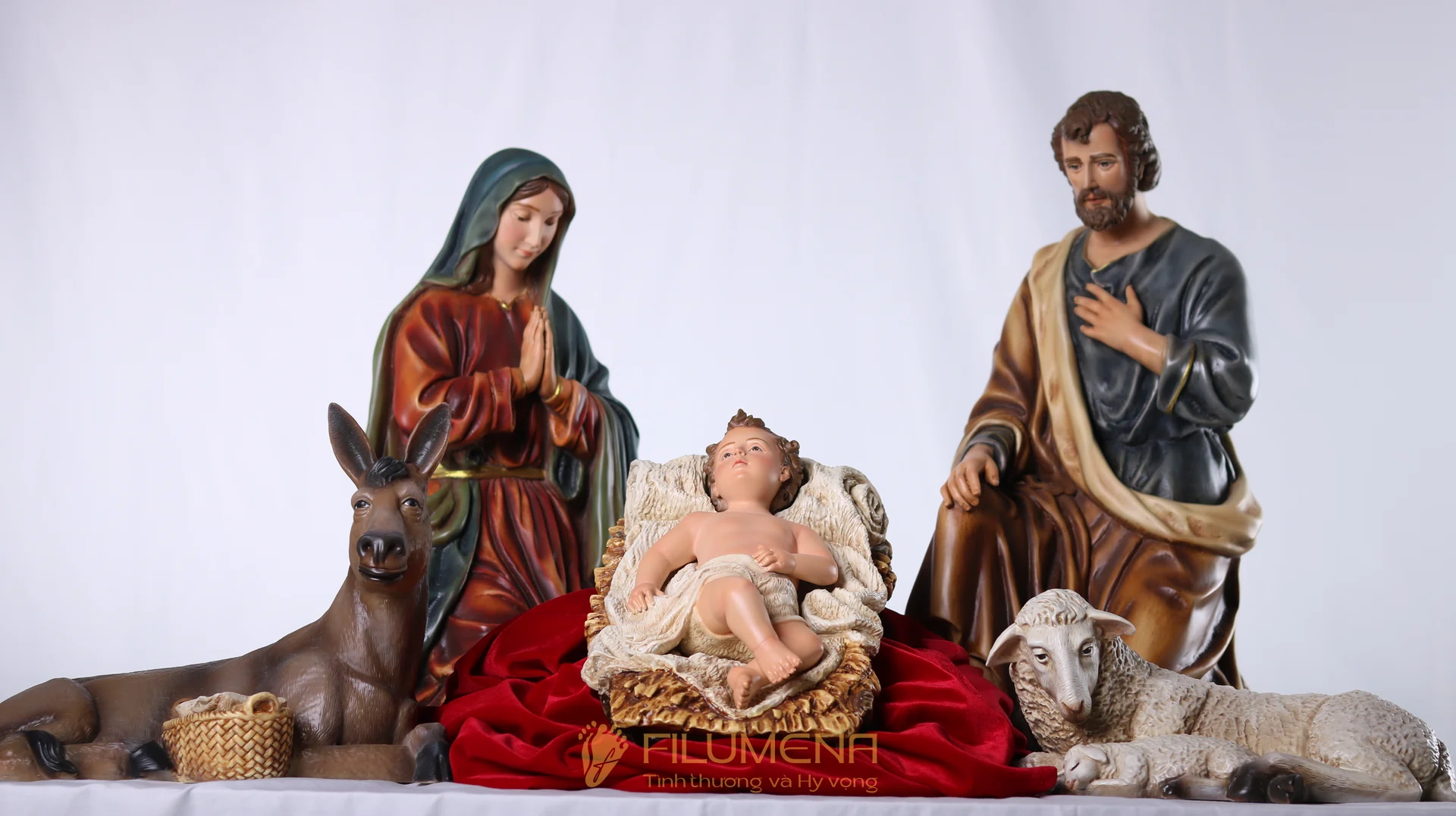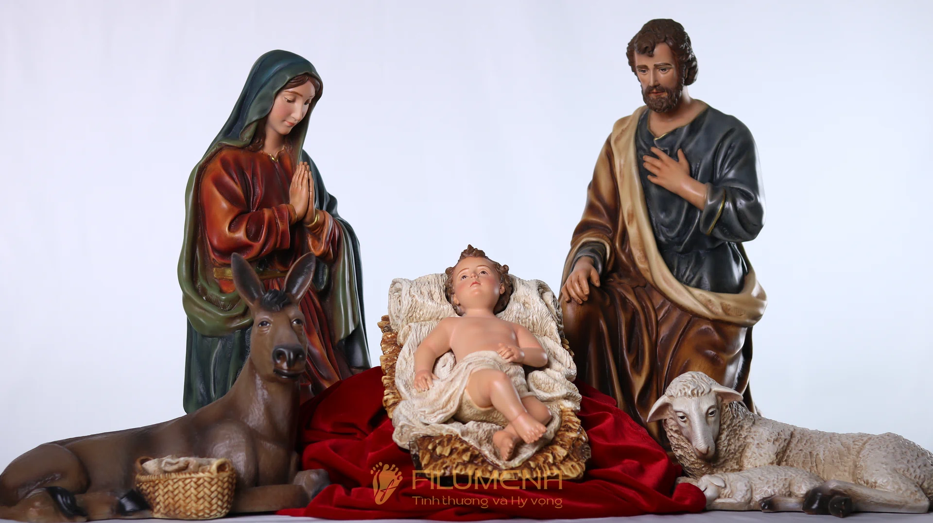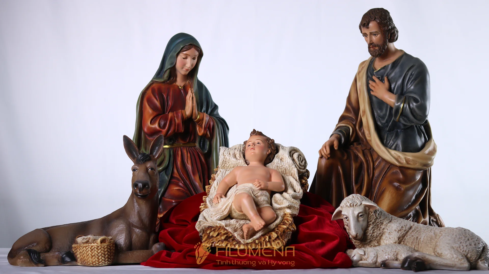 Bộ tượng Giáng Sinh 50 cm 5 nhân vật vẽ màu trầm cổ điển gồm: Chúa Hài Đồng, Đức Mẹ, Thánh Giuse (quỳ), chiên và lừa. Bố cục trung tâm tôn vinh mầu nhiệm Nhập Thể, dễ bày trí tại bàn thờ gia đình, phòng khách hoặc không gian mục vụ nhỏ.
