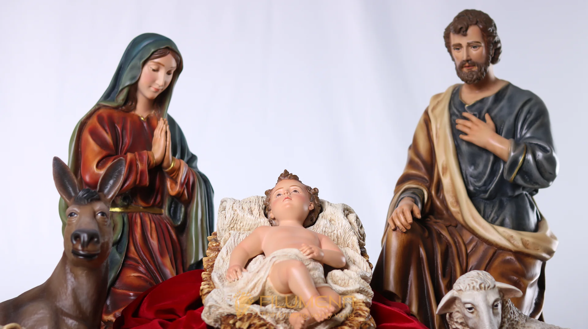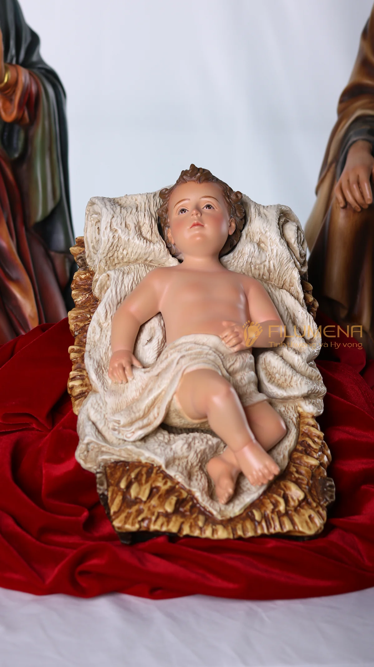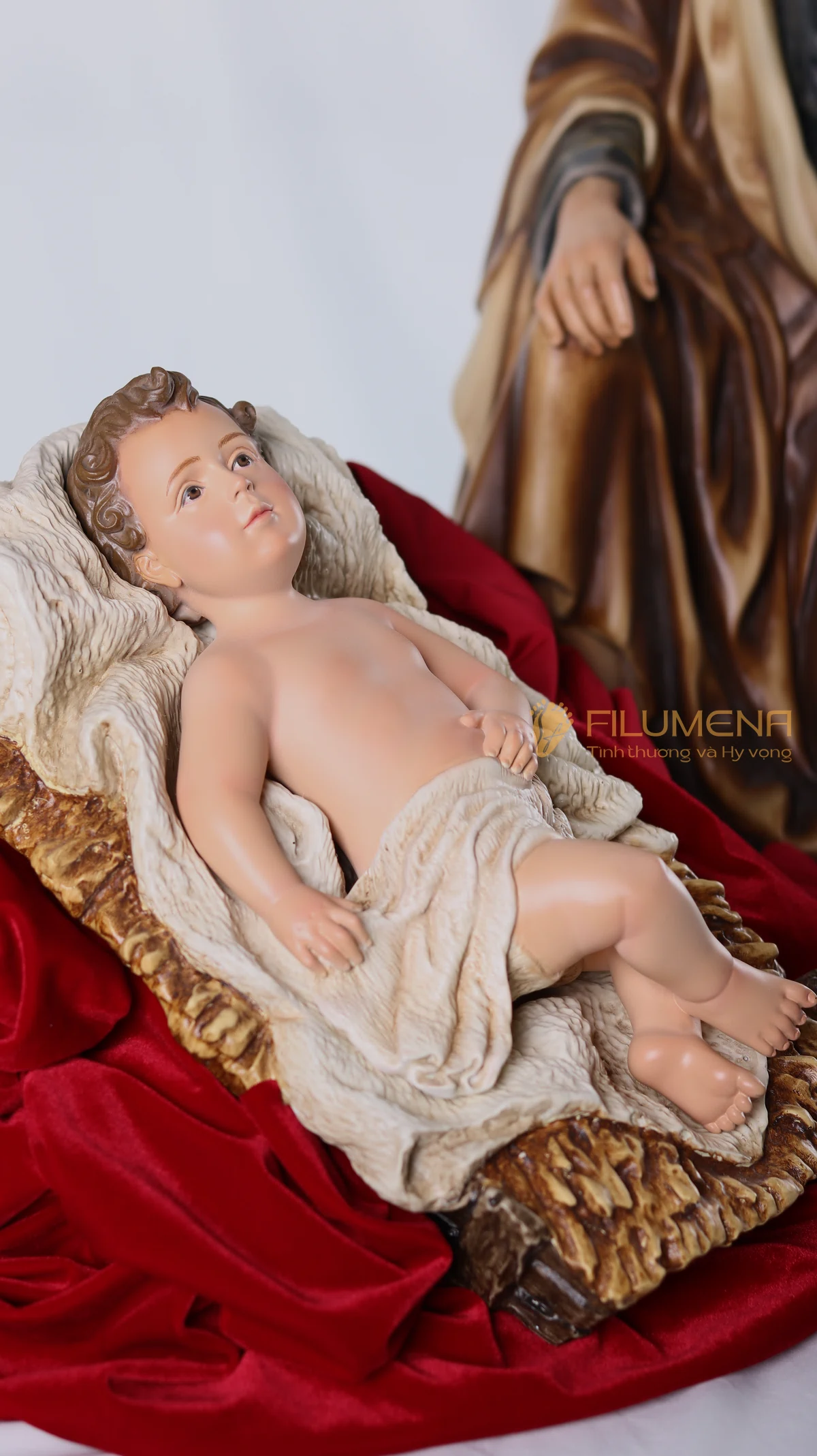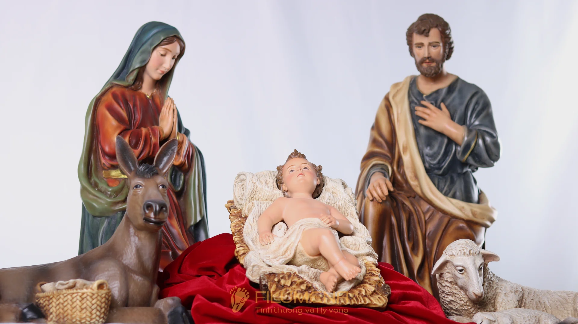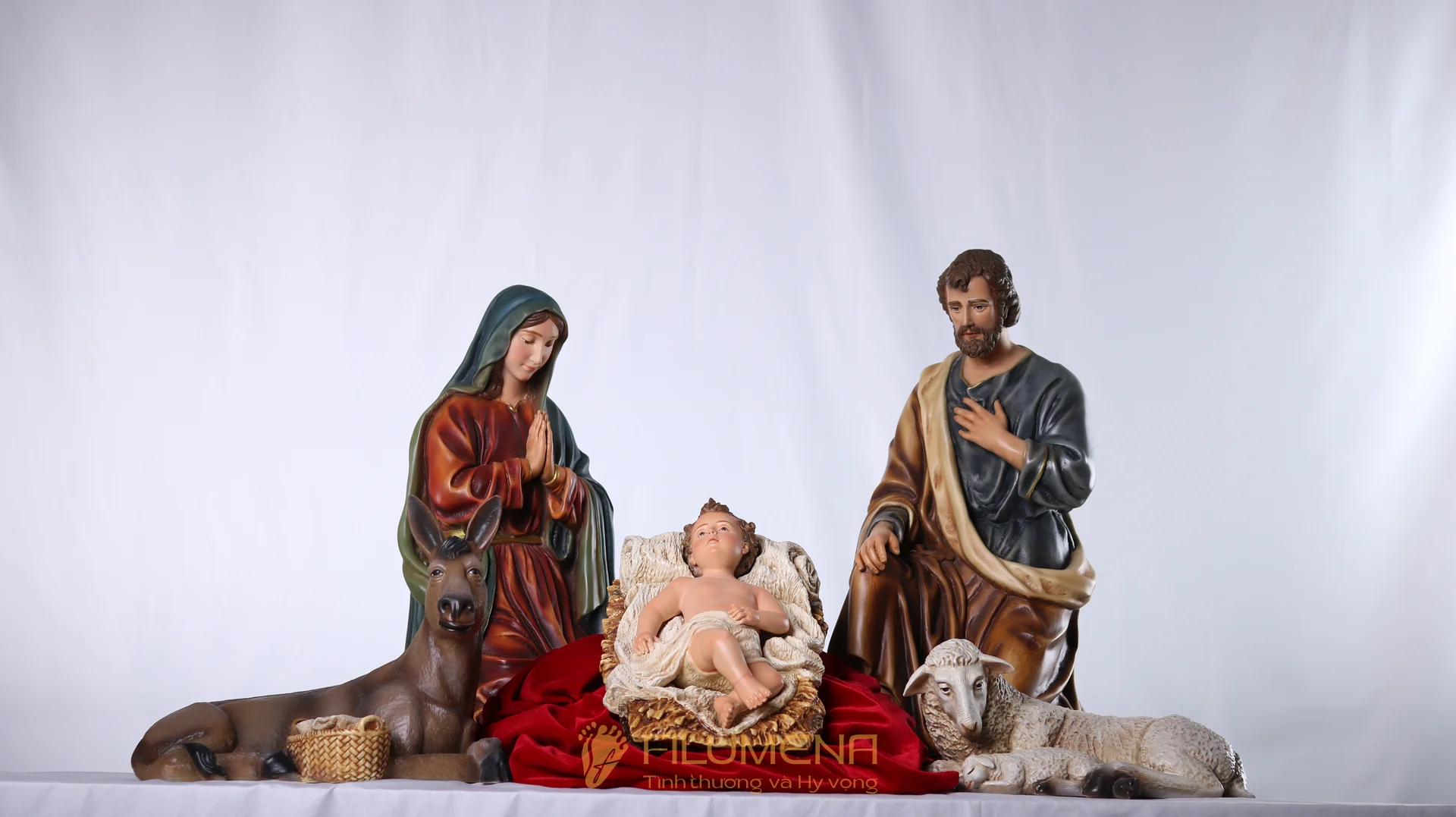 Bộ tượng Giáng Sinh 50 cm 5 nhân vật vẽ màu trầm cổ điển gồm: Chúa Hài Đồng, Đức Mẹ, Thánh Giuse (quỳ), chiên và lừa. Bố cục trung tâm tôn vinh mầu nhiệm Nhập Thể, dễ bày trí tại bàn thờ gia đình, phòng khách hoặc không gian mục vụ nhỏ.