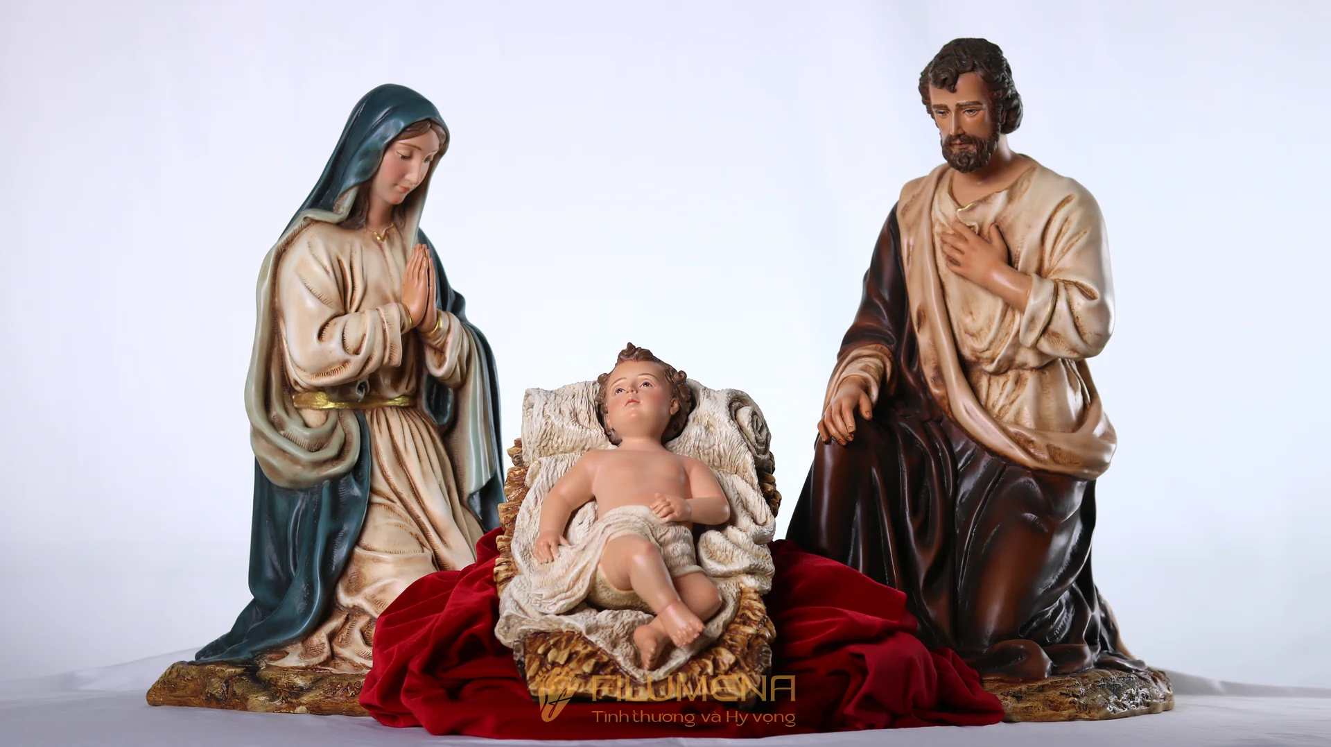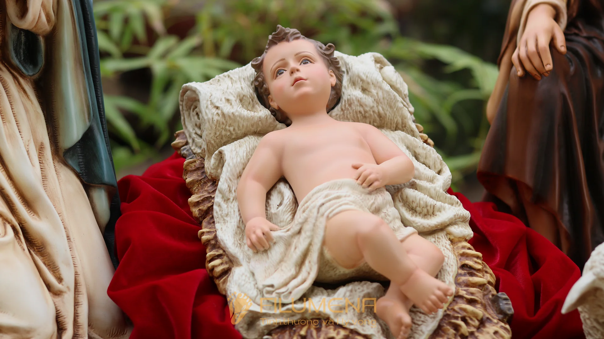 Ý nghĩa: Bộ tượng nhấn vào trung tâm mầu nhiệm Nhập Thể – Hài Đồng là điểm hội tụ ánh nhìn; Đức Mẹ và Thánh Giuse tạo vòng ôm che chở, gợi lời cầu nguyện ấm áp trong gia đình.