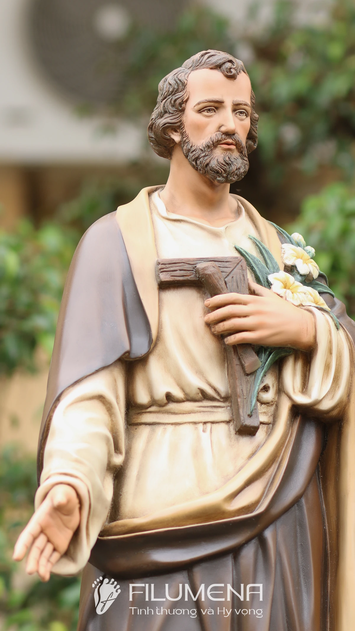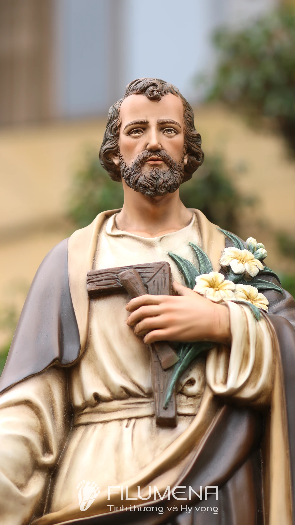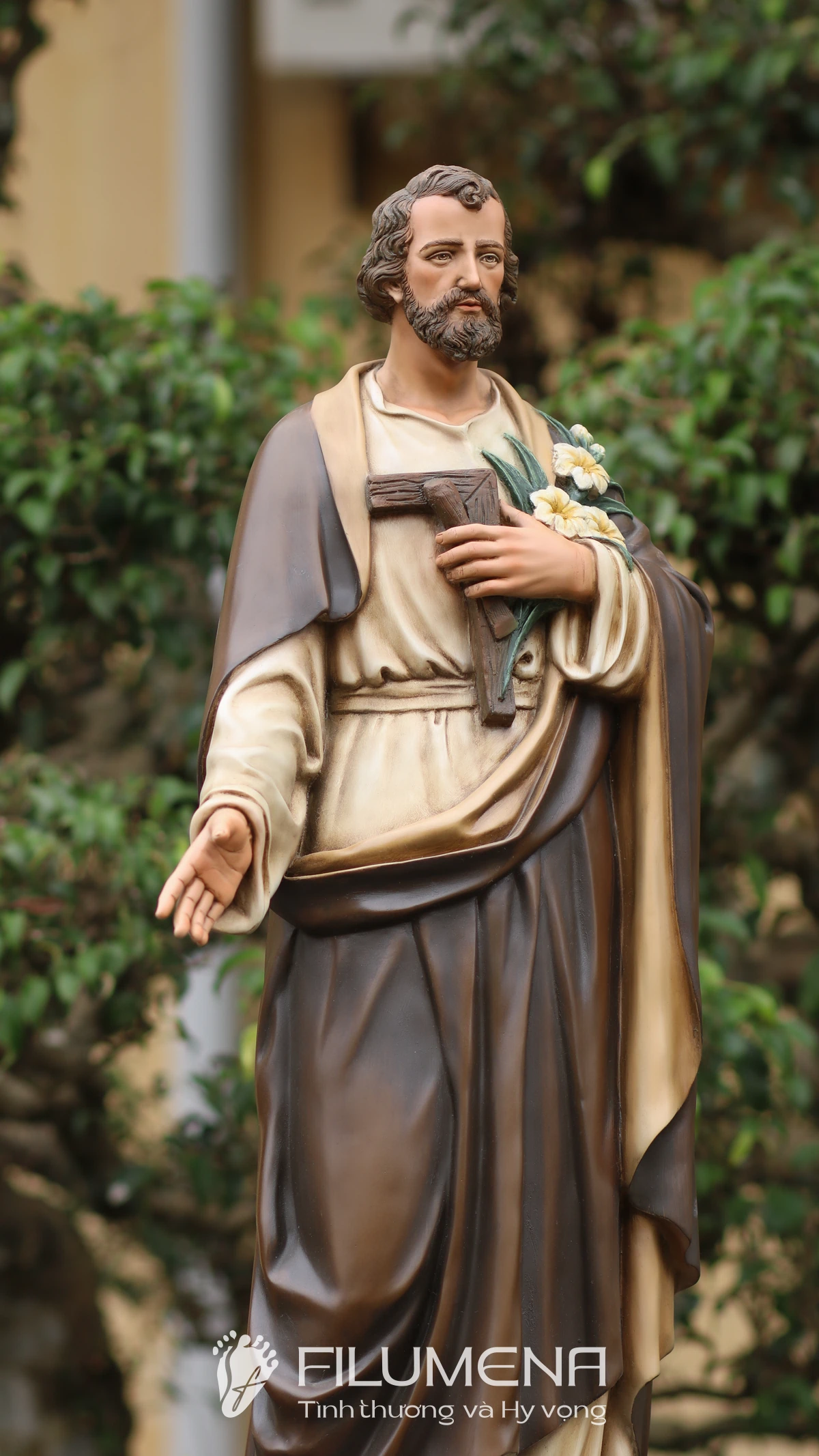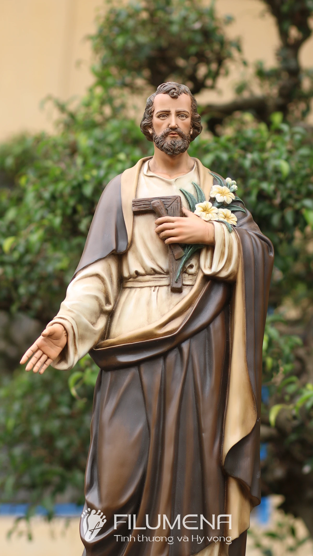 Trên tay trái, Thánh nhân ôm cành huệ trắng – biểu tượng của đời sống thanh khiết và trọn vẹn thuộc về Thiên Chúa – cùng với dụng cụ nghề mộc gợi lại những năm tháng lao động âm thầm tại Nazareth. Áo trong màu sáng, phủ ngoài là áo choàng nâu cổ điển với những nếp gấp sâu, tạo cảm giác ấm áp, gần gũi mà vẫn trang nghiêm. Khuôn mặt Thánh Giuse được thể hiện với đôi mắt hiền, hàng râu tóc mềm tự nhiên, nét trầm lắng của người đàn ông từng trải nhưng đầy lòng tin tưởng, dễ khiến người chiêm ngắm cảm nhận đây là một “người cha thiêng liêng” có thể nương tựa được.