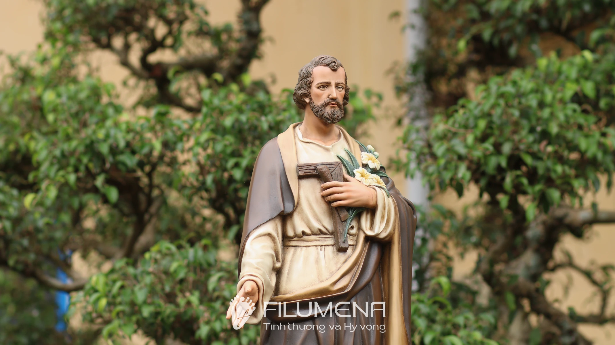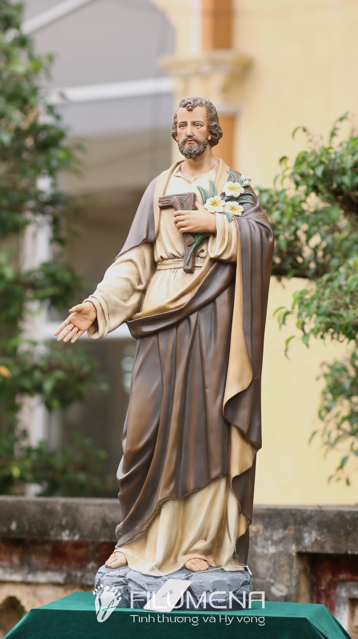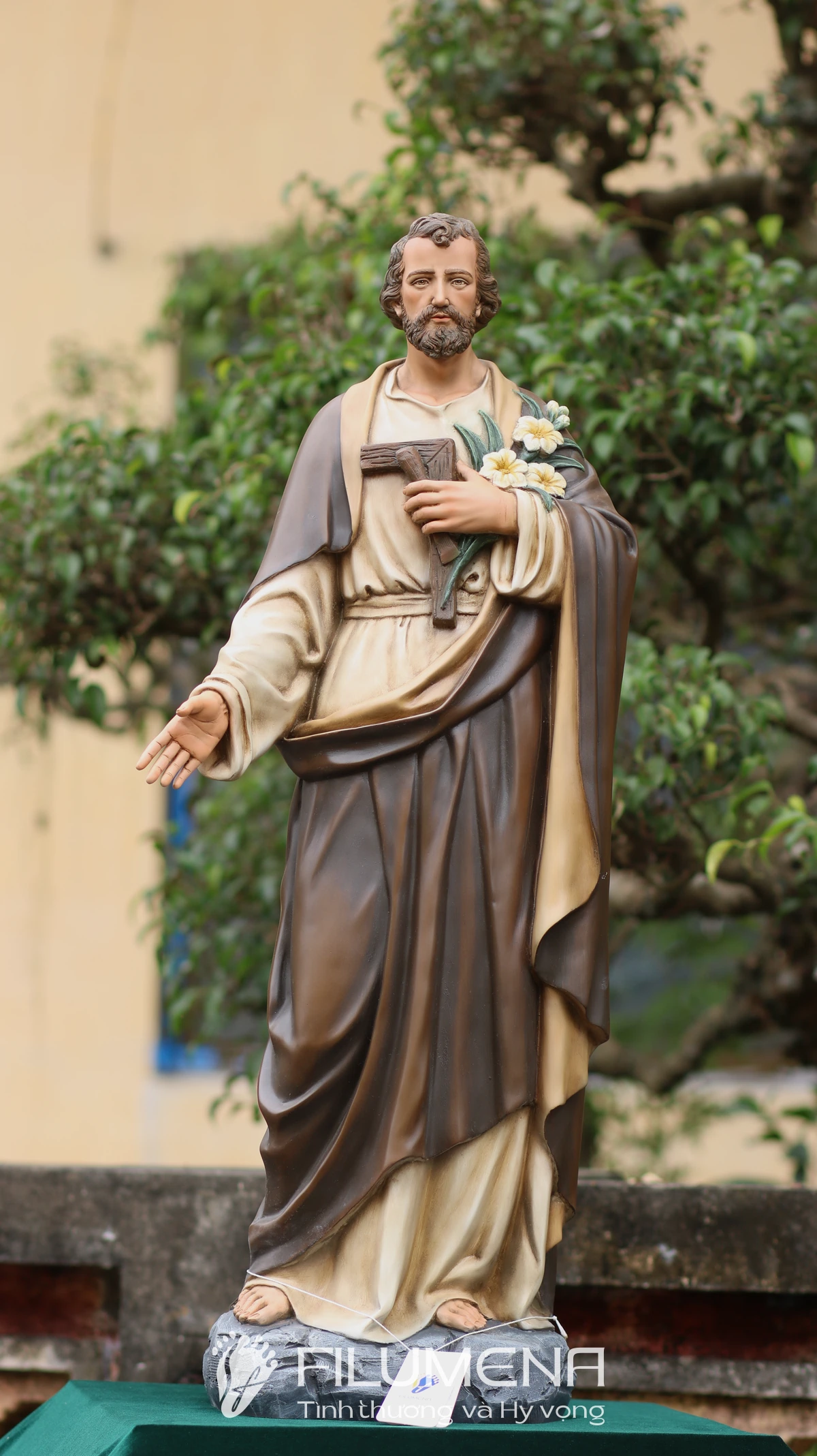 Trên tay trái, Thánh nhân ôm cành huệ trắng – biểu tượng của đời sống thanh khiết và trọn vẹn thuộc về Thiên Chúa – cùng với dụng cụ nghề mộc gợi lại những năm tháng lao động âm thầm tại Nazareth. Áo trong màu sáng, phủ ngoài là áo choàng nâu cổ điển với những nếp gấp sâu, tạo cảm giác ấm áp, gần gũi mà vẫn trang nghiêm. Khuôn mặt Thánh Giuse được thể hiện với đôi mắt hiền, hàng râu tóc mềm tự nhiên, nét trầm lắng của người đàn ông từng trải nhưng đầy lòng tin tưởng, dễ khiến người chiêm ngắm cảm nhận đây là một “người cha thiêng liêng” có thể nương tựa được.