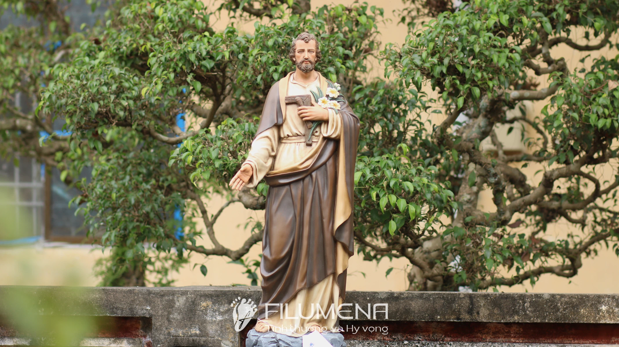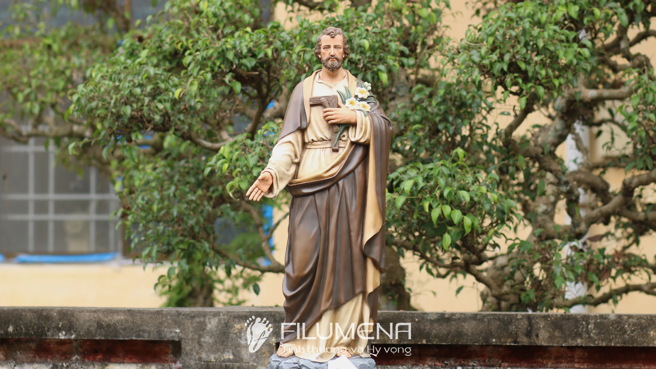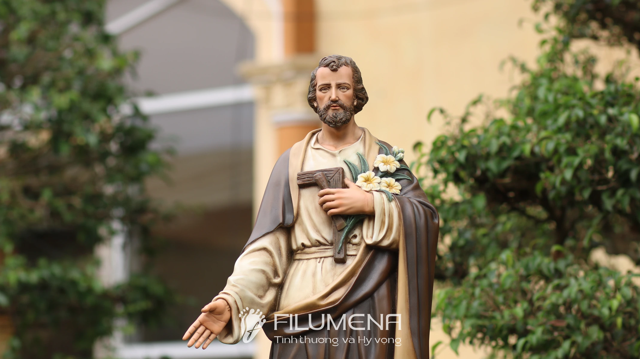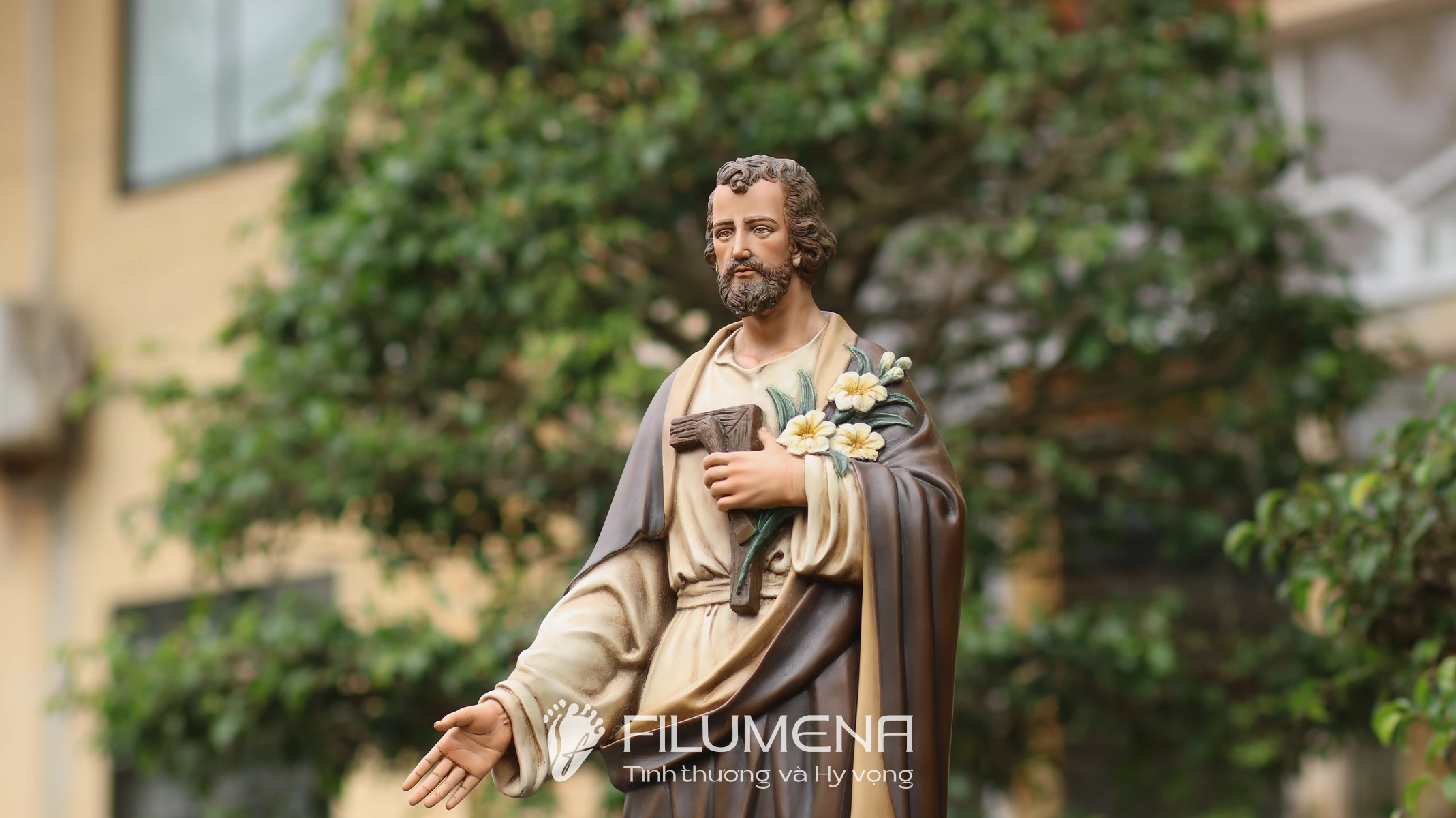 Trên tay trái, Thánh nhân ôm cành huệ trắng – biểu tượng của đời sống thanh khiết và trọn vẹn thuộc về Thiên Chúa – cùng với dụng cụ nghề mộc gợi lại những năm tháng lao động âm thầm tại Nazareth. Áo trong màu sáng, phủ ngoài là áo choàng nâu cổ điển với những nếp gấp sâu, tạo cảm giác ấm áp, gần gũi mà vẫn trang nghiêm. Khuôn mặt Thánh Giuse được thể hiện với đôi mắt hiền, hàng râu tóc mềm tự nhiên, nét trầm lắng của người đàn ông từng trải nhưng đầy lòng tin tưởng, dễ khiến người chiêm ngắm cảm nhận đây là một “người cha thiêng liêng” có thể nương tựa được.