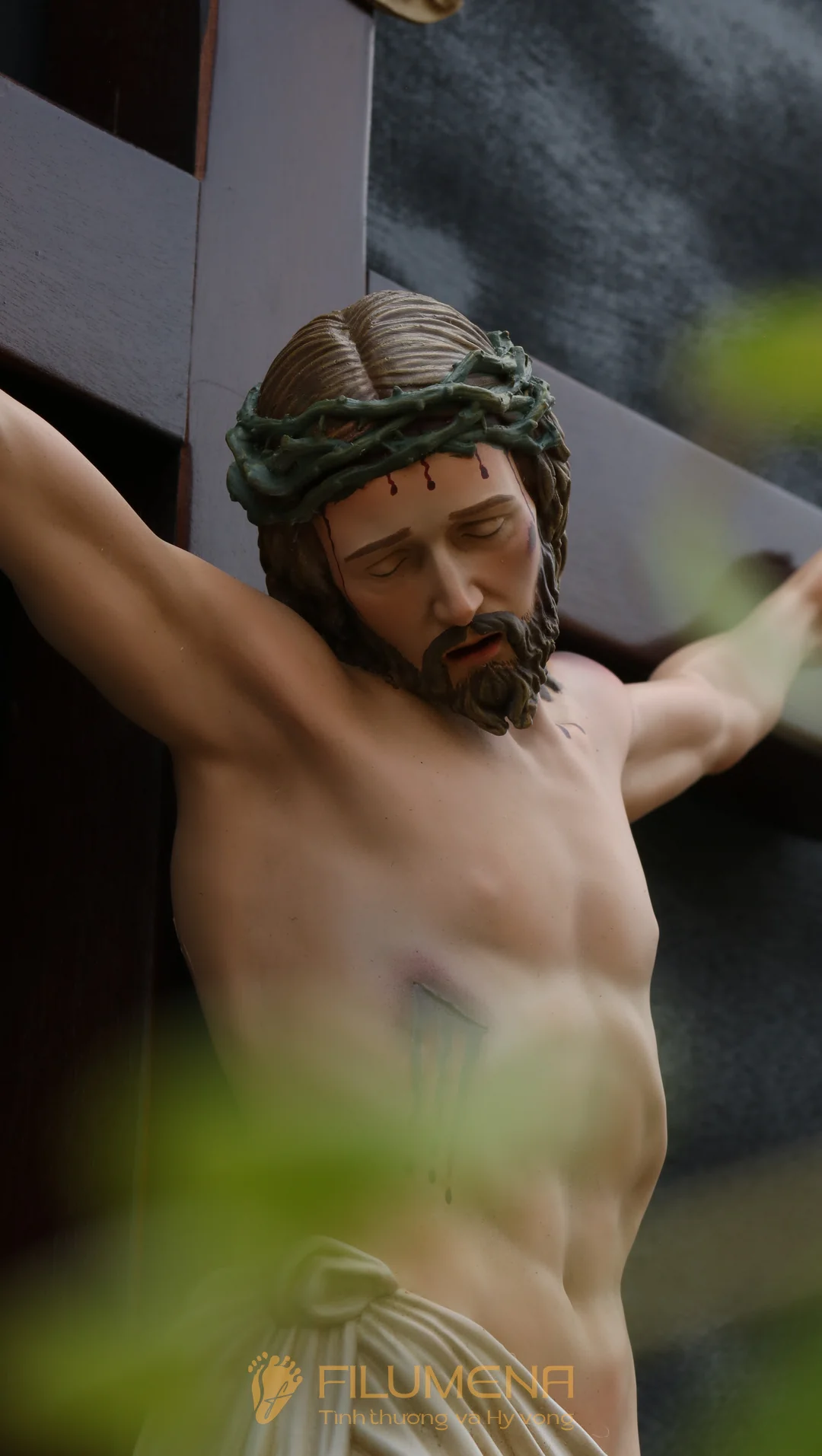 Tượng Chúa Chịu Nạn 60 cm – thánh giá gỗ lát là một tác phẩm thờ phượng được Filumena sáng tác với nhiều trân trọng dành cho mầu nhiệm Thập giá. Hình tượng Chúa Giêsu trên Thánh giá được khắc họa ở khoảnh khắc rất thiêng liêng: Chúa vừa phó thác linh hồn mình trong tay Chúa Cha. Thân mình Chúa buông xuống nhẹ, đầu cúi, gương mặt thanh thản sau khi đã hoàn tất hy tế cứu độ, gợi lên nơi người chiêm ngắm lòng biết ơn và tín thác.