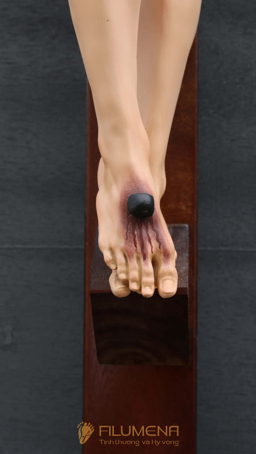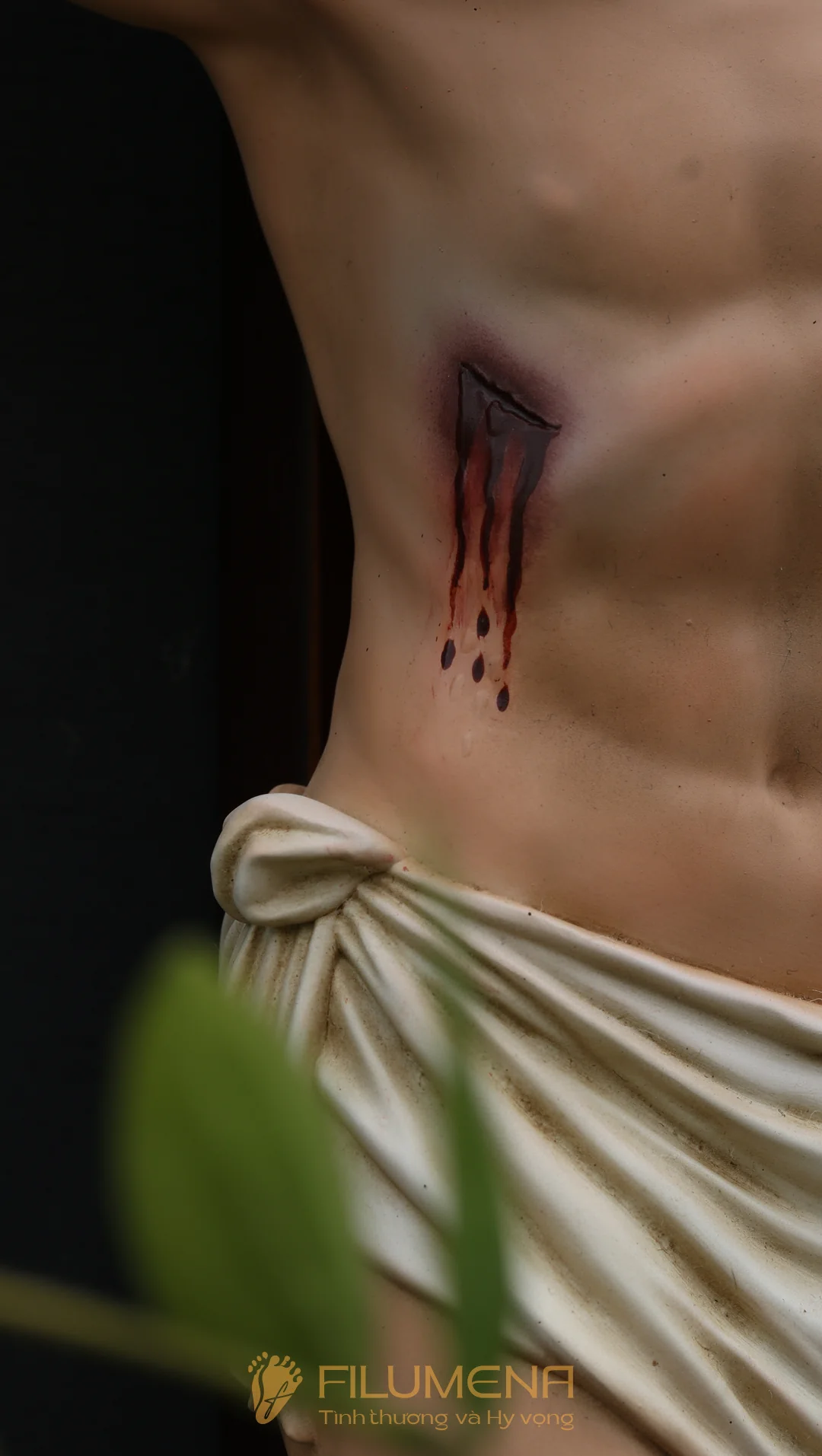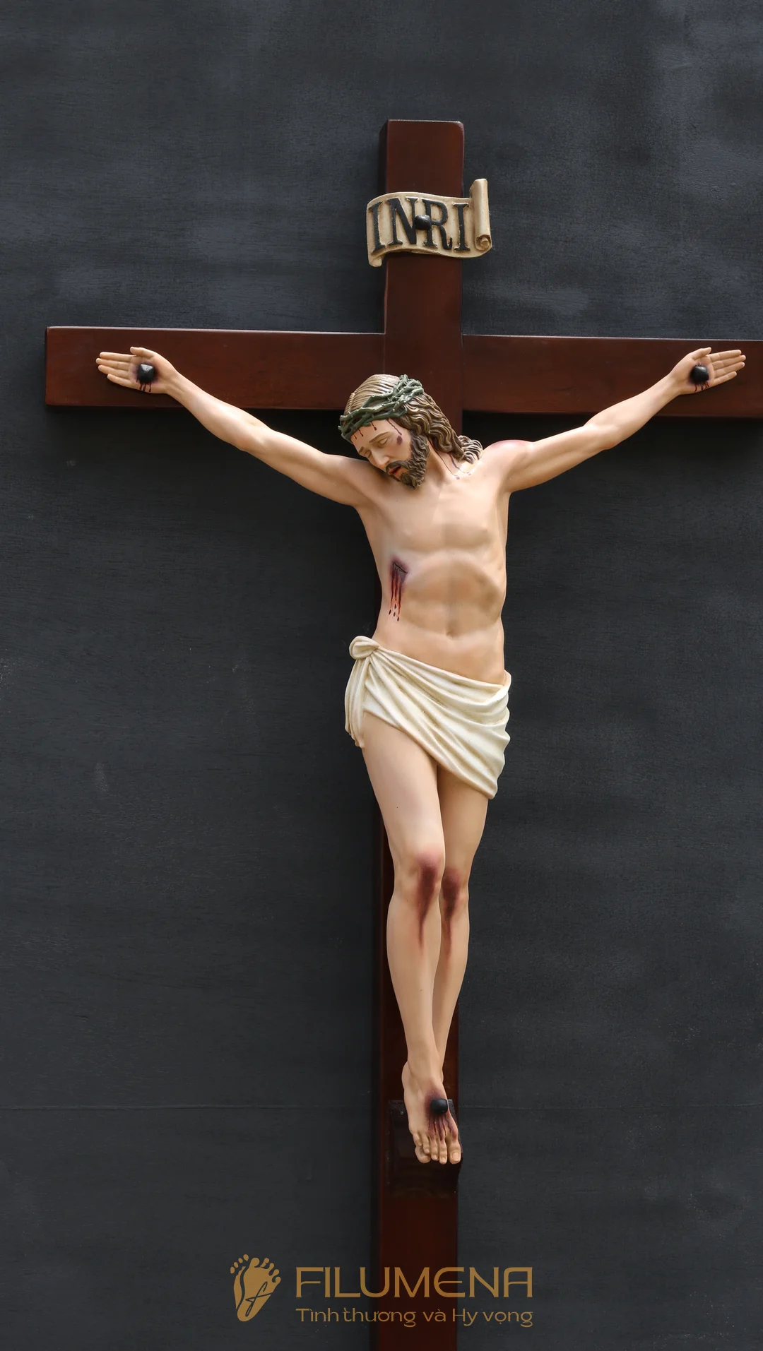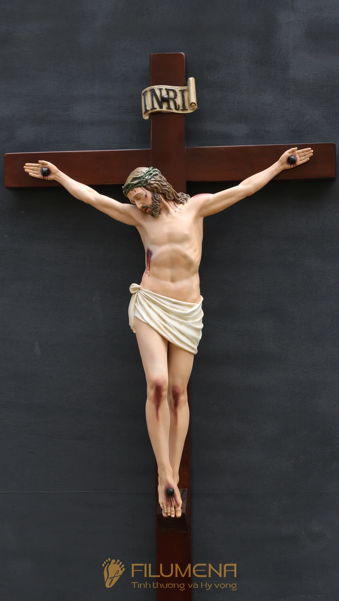 Tượng Chúa Chịu Nạn 60 cm bằng bột đá, gắn trên thánh giá gỗ lát (102 x 62 cm) – loại gỗ tốt, vân đẹp, bền chắc. Tác phẩm khắc họa giây phút Chúa Giêsu phó thác linh hồn trong tay Chúa Cha, là một trong bộ 3 tượng bàn thờ Công giáo Filumena, phù hợp treo trên bàn thờ gia đình hoặc phòng nguyện nhỏ. Mẫu tượng do Filumena sáng tác và dành 10% giá trị tác phẩm cùng ít nhất 25% lợi nhuận cho Quỹ Filumena Tình thương và Hy vọng, hỗ trợ Bảo vệ Sự sống và người nghèo.