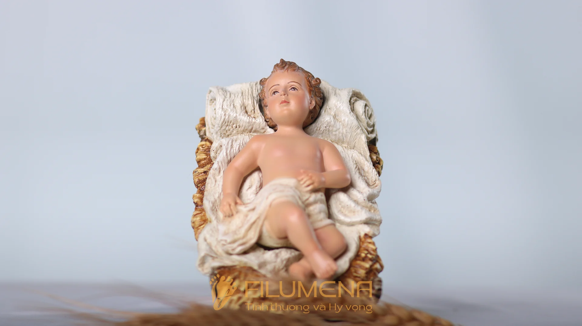 Tượng Chúa Giáng Sinh 10 cm cho bộ tượng Noel 20 cm — Hài Đồng quấn tã, nằm trong máng cỏ; tâm điểm thị giác của bố cục nhỏ gọn. Chất liệu resin + bột đá, sơn tay nhiều lớp; phù hợp bàn thờ gia đình và kệ 60–90 cm.