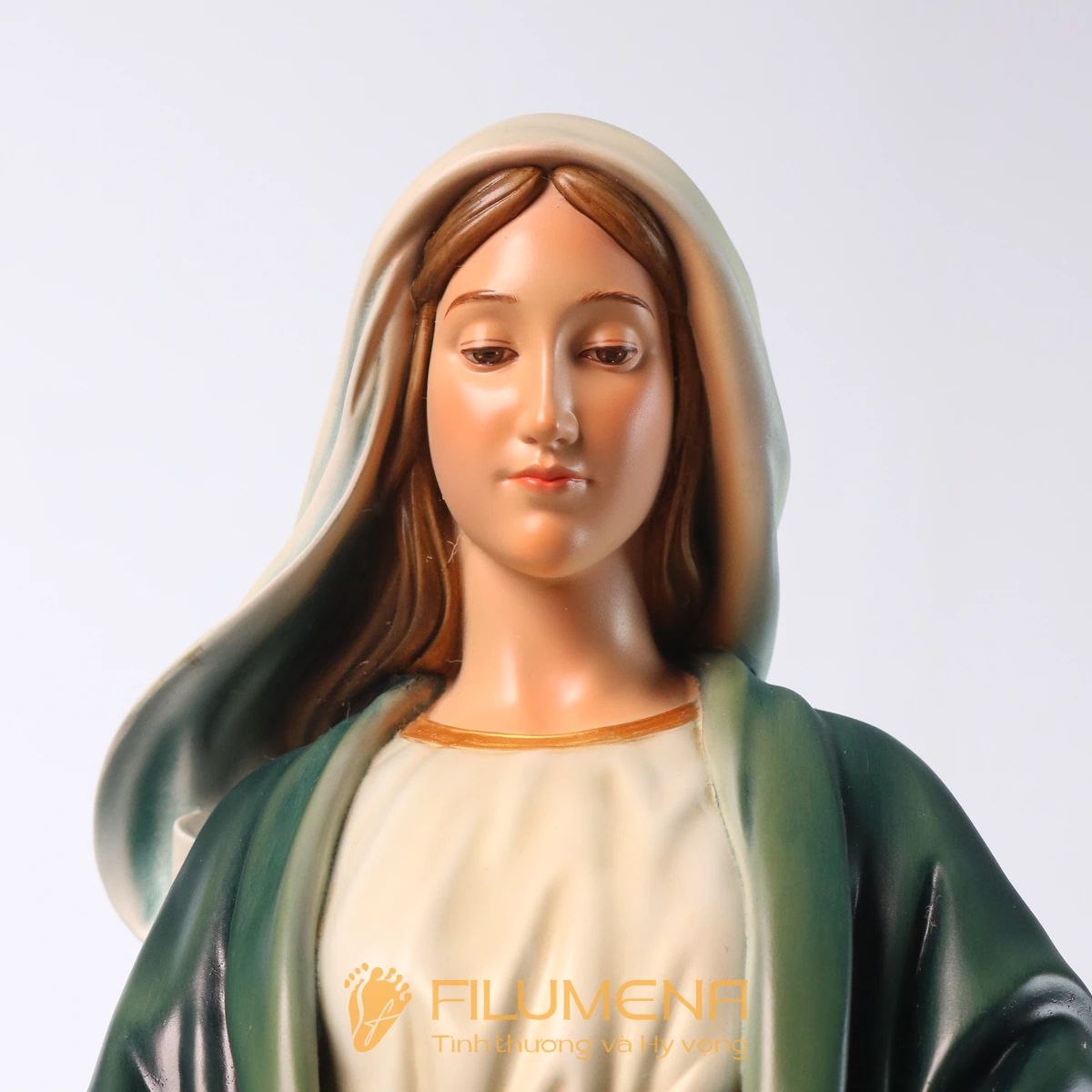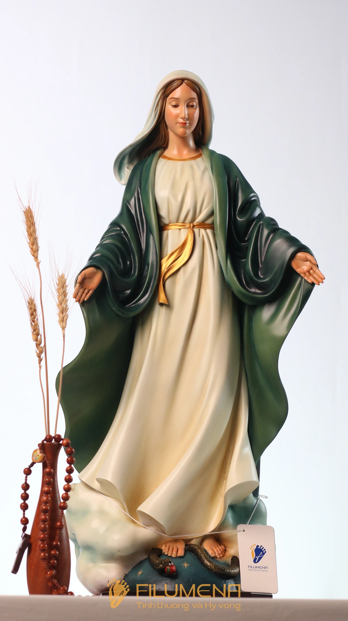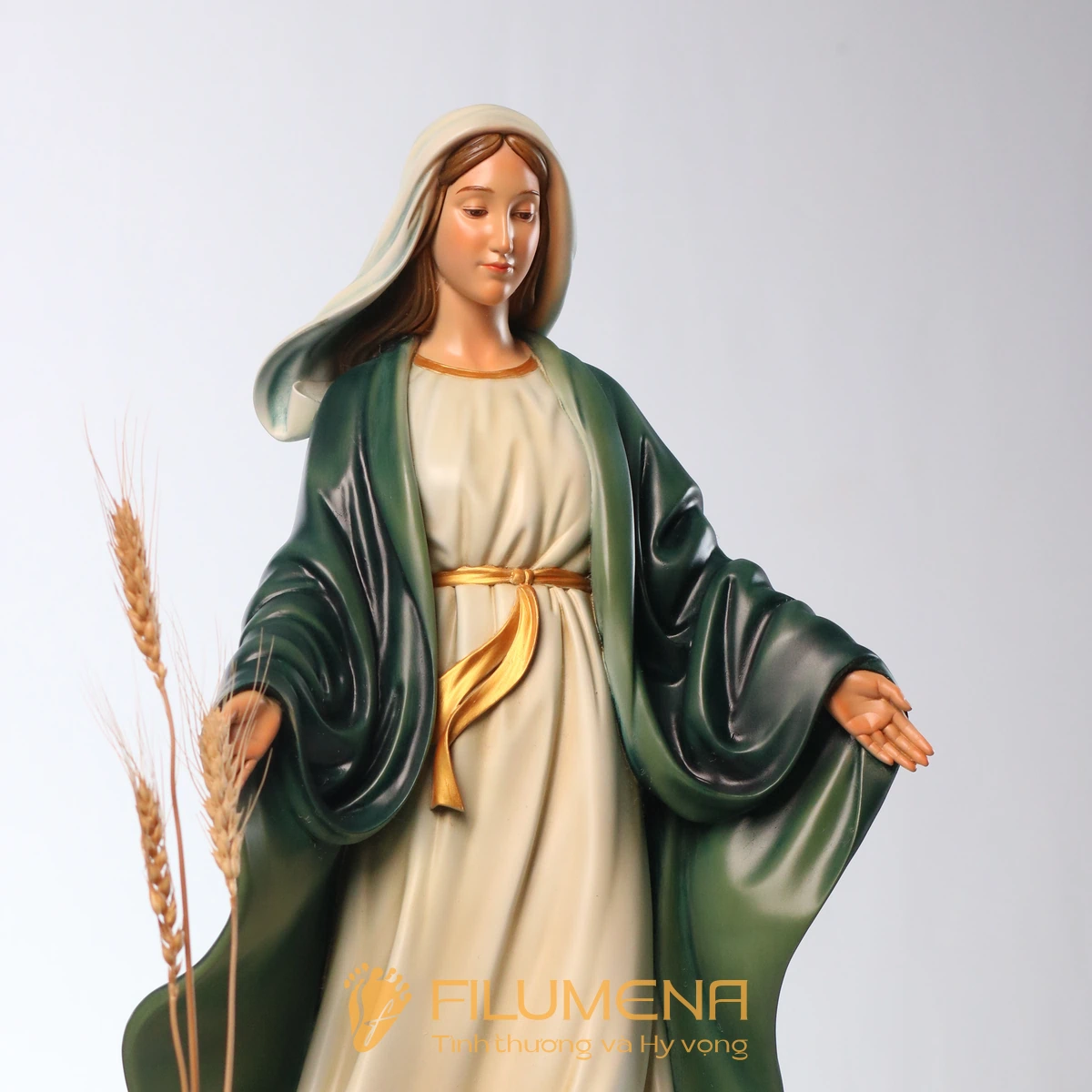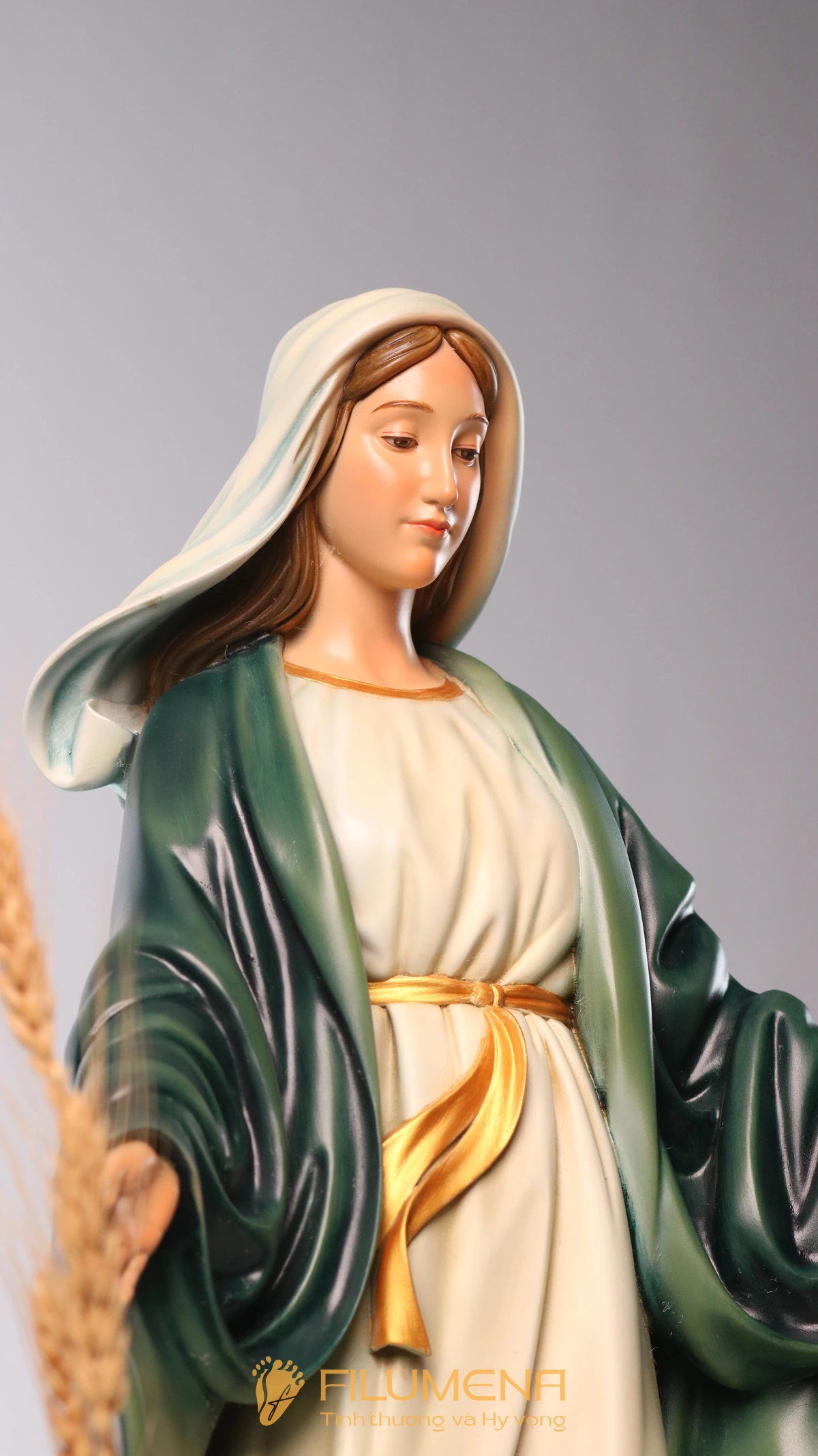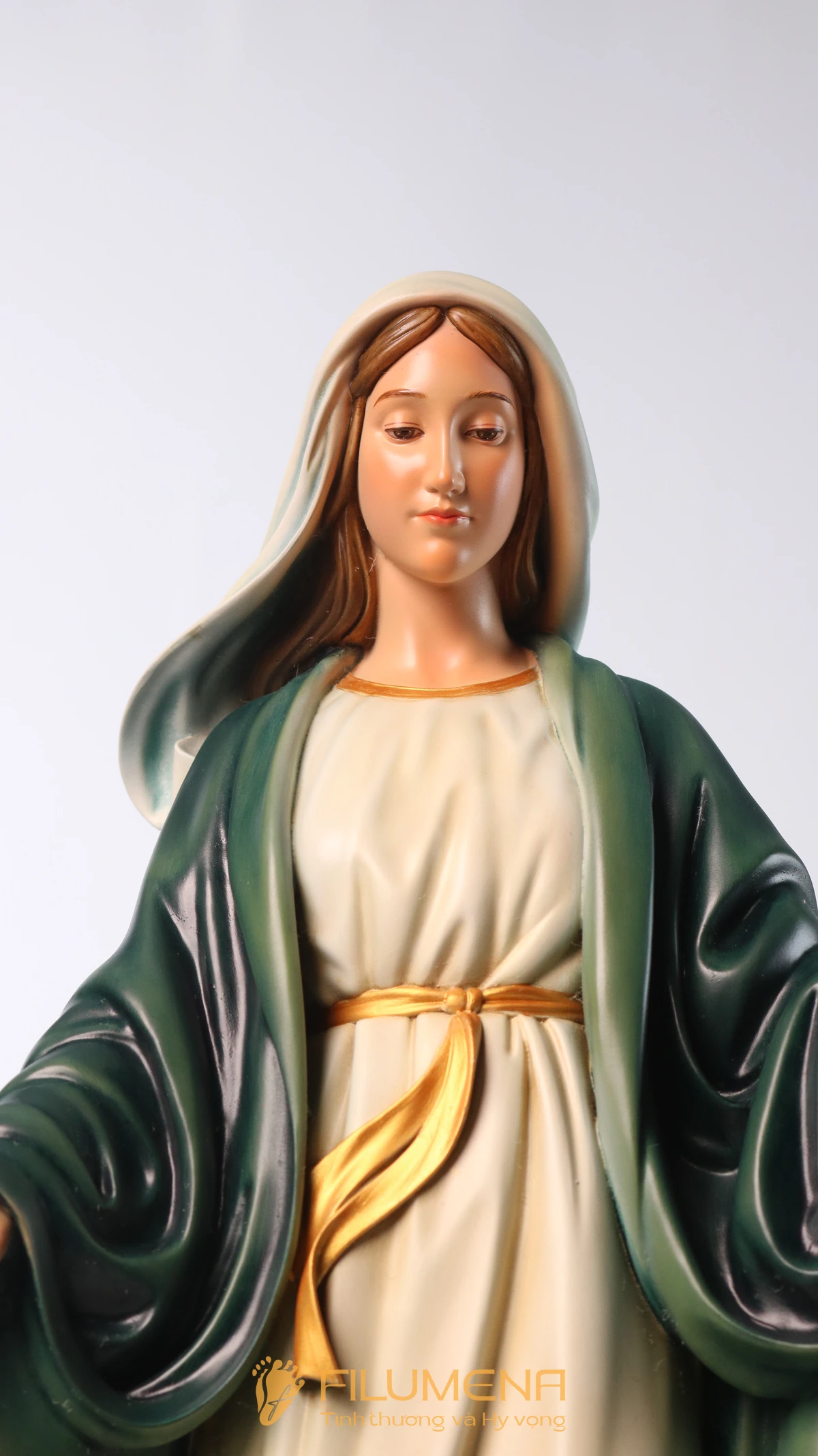 Tượng Đức Mẹ Ban Ơn 60 cm màu xanh ô-liu vì thế không chỉ là một tác phẩm trang trí phụng vụ, mà là dấu chỉ hiện diện của Mẹ trong gia đình: mỗi lần ngước nhìn, ta được nhắc nhớ rằng Mẹ luôn mở rộng đôi tay, âm thầm ban ơn và dẫn ta đến gần Chúa Giêsu hơn.