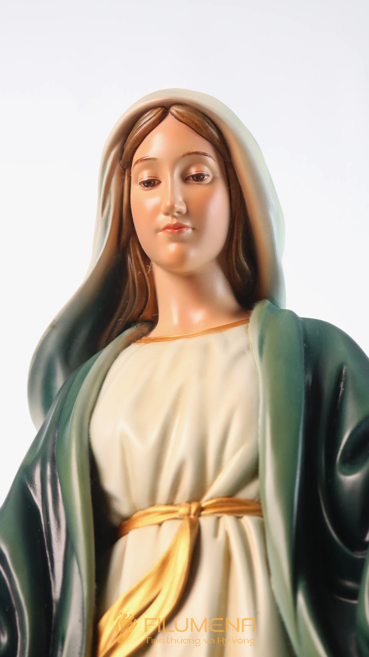 Tượng Đức Mẹ Ban Ơn 60 cm màu xanh ô-liu là lựa chọn trang trọng cho bàn thờ Chúa phòng khách, phòng nguyện gia đình hoặc nhà nguyện nhỏ. Đức Mẹ đứng thẳng, hai tay mở rộng, lòng bàn tay hướng xuống như đang tuôn đổ ơn lành trên từng người con. Áo choàng xanh ô-liu trầm ấm, áo trong sáng hơn, đường viền vàng nhẹ giúp tượng vừa thanh nhã, vừa hài hòa với bàn thờ gỗ và tường màu kem. Khuôn mặt Mẹ hiền từ, ánh mắt dịu dàng nhìn xuống, dễ đưa người chiêm ngắm vào cầu nguyện, nhất là khi lần chuỗi Mân Côi hay đọc kinh tối gia đình.