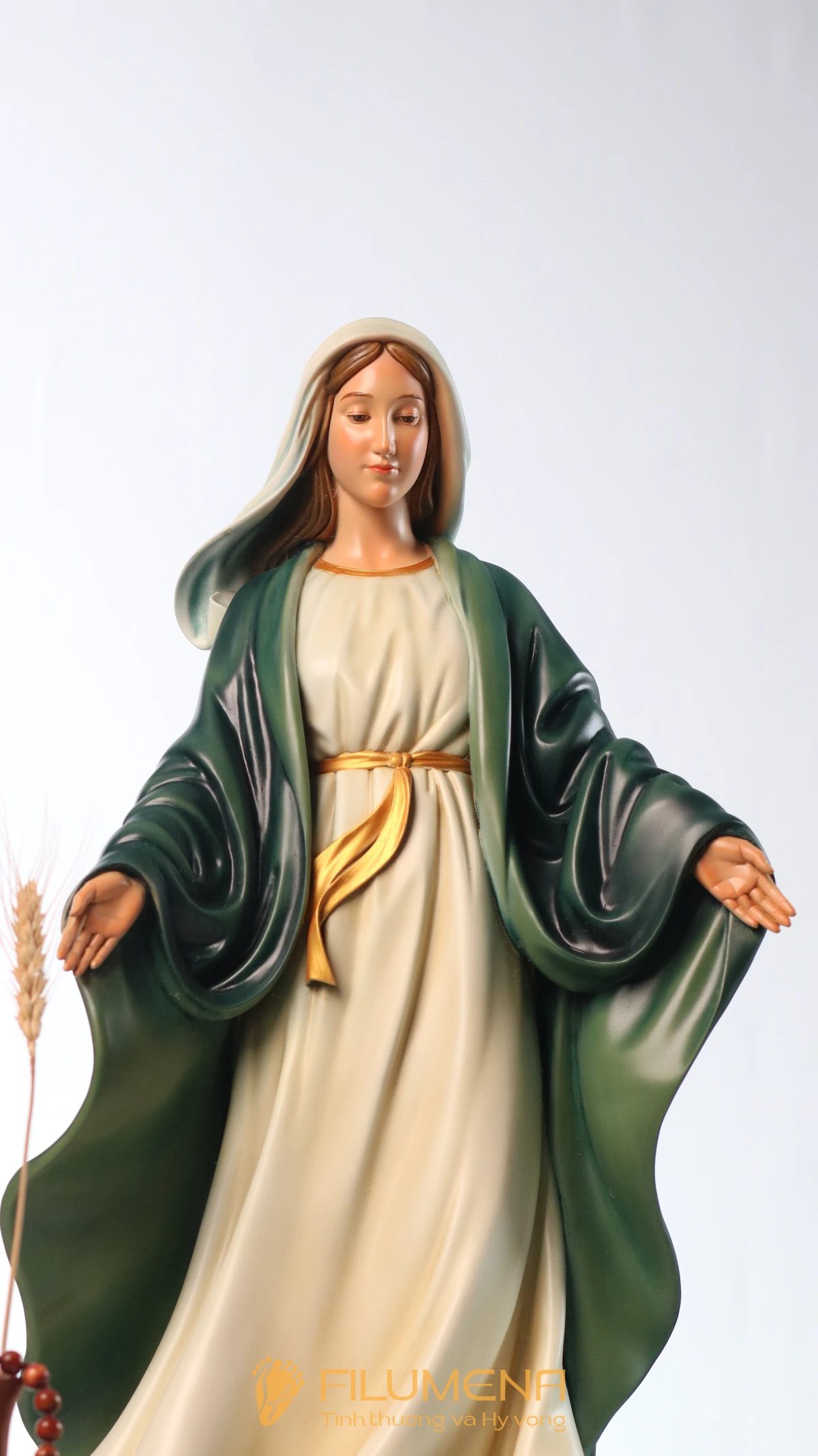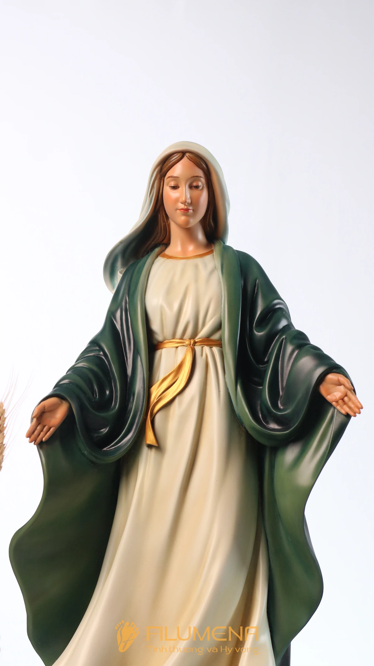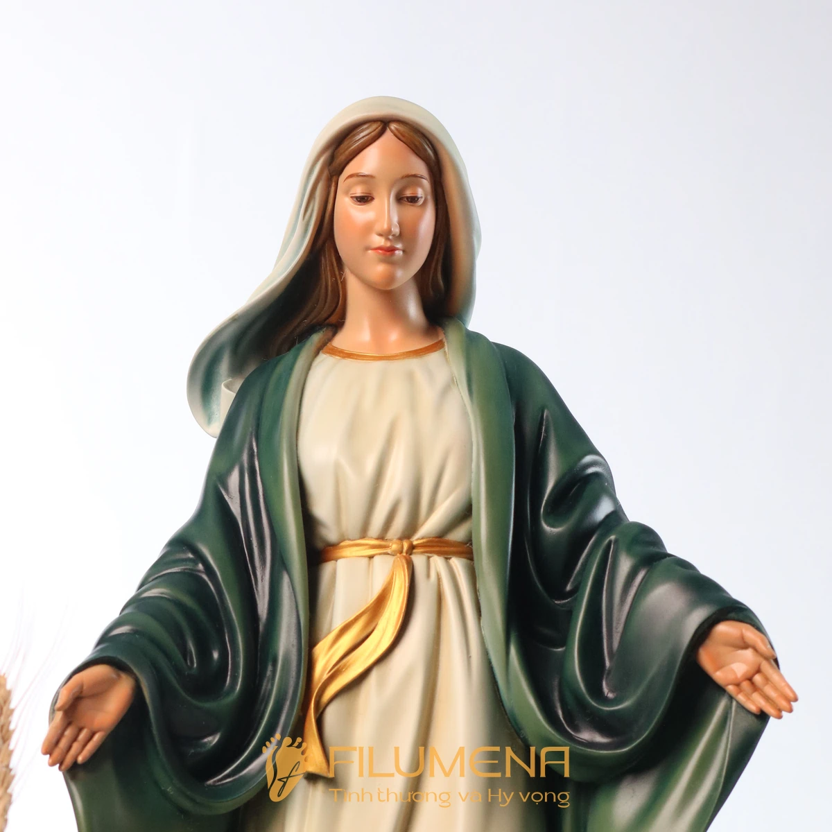 Tượng Đức Mẹ Ban Ơn 60 cm màu xanh ô-liu được Filumena thiết kế cho những không gian cần một điểm nhấn vừa trang trọng, vừa gần gũi: bàn thờ Chúa phòng khách, phòng nguyện gia đình, nhà nguyện nhỏ hoặc phòng hội Công giáo. Hình ảnh Mẹ được khắc họa theo kiểu Ban Ơn quen thuộc của Giáo Hội: Mẹ đứng thẳng, hai tay mở rộng, lòng bàn tay hướng xuống, diễn tả dòng ân sủng Thiên Chúa tuôn trào qua lời chuyển cầu của Đức Maria.