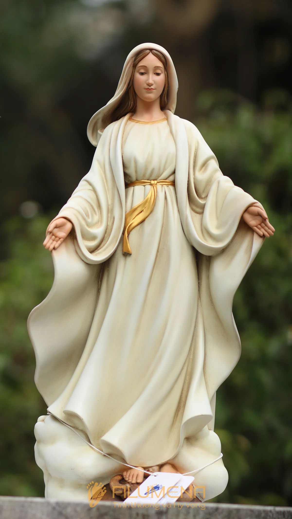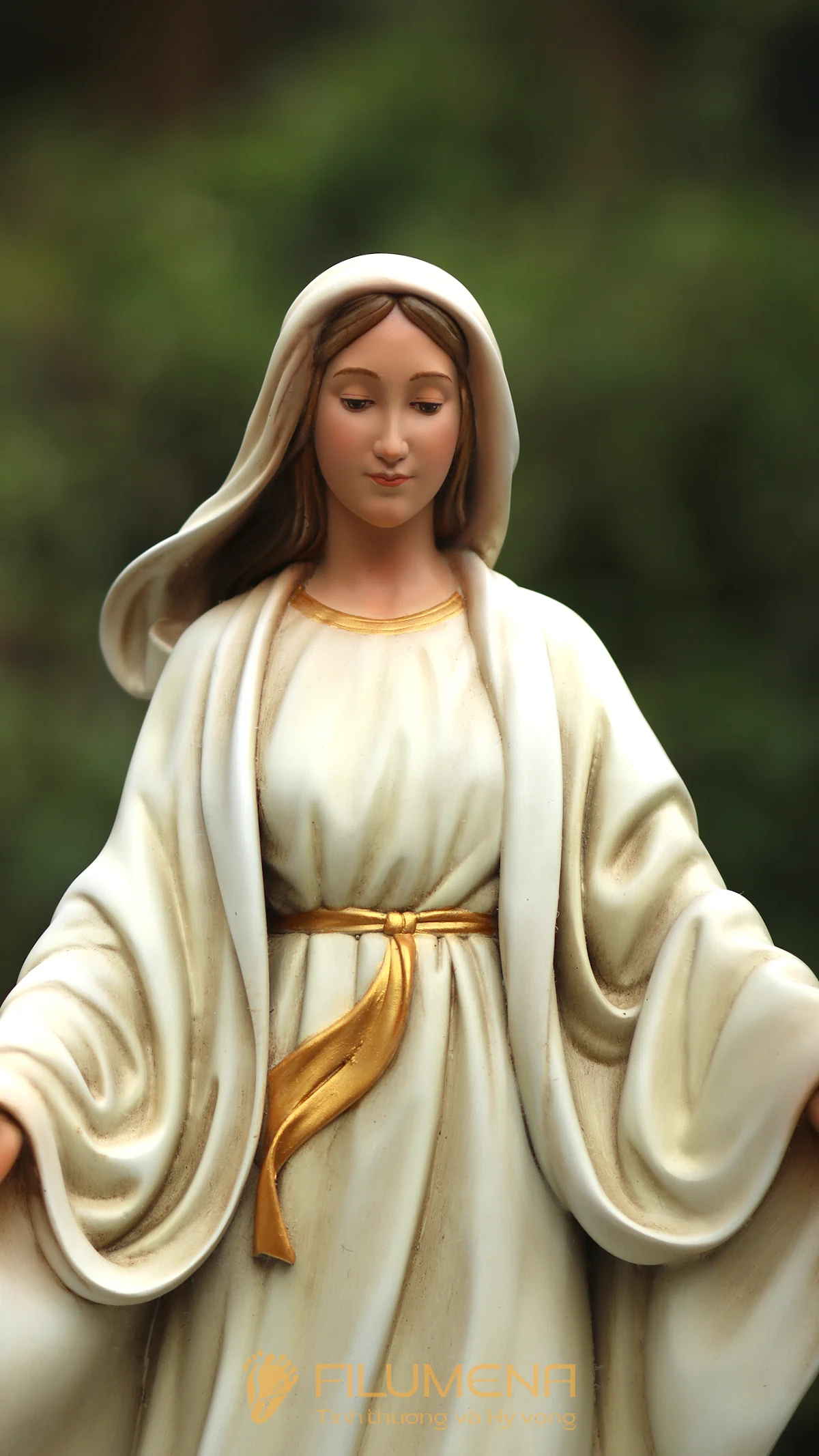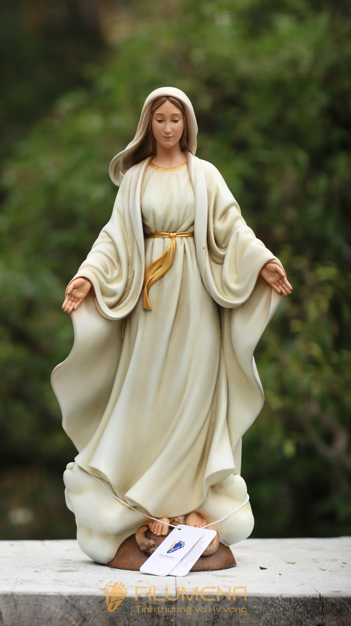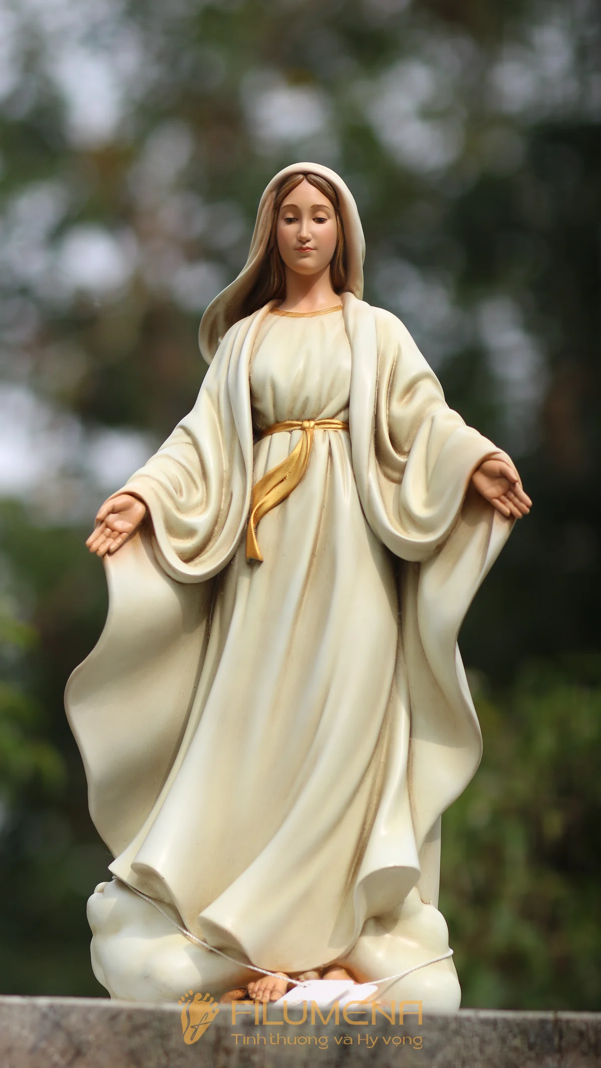 Tượng Đức Mẹ Ban Ơn do Filumena sáng tác, Đức Mẹ trong áo trắng ngà dịu nhẹ, dang tay ban ơn lành cho con cái. Nhiều kích thước từ 15–80 cm, phù hợp cho bàn thờ Chúa phòng khách, bàn thờ Công giáo mini và xe ô tô. Hình tượng được lấy cảm hứng từ Mề-đay Huyền Nhiệm, mang lại cảm giác bình an, tín thác cho những ai yêu mến Đức Mẹ.