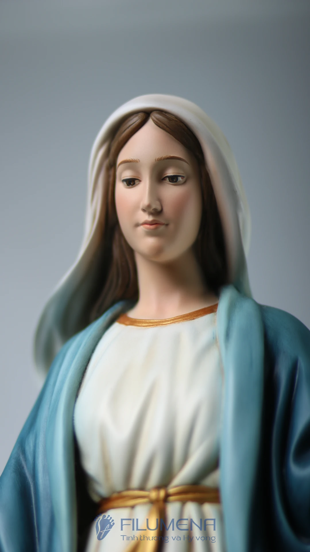 Khuôn mặt Đức Mẹ được diễn tả hiền từ, nhẹ nhàng, ánh mắt nhìn xuống đầy cảm thông. Người chiêm ngắm dễ cảm nhận đây không chỉ là một hình tượng tôn giáo, mà là người Mẹ đang lắng nghe và đồng hành với những vui buồn rất cụ thể của đời sống hằng ngày: chuyện gia đình, công việc, sức khỏe, con cái… Kích thước 50 cm phù hợp với các bàn thờ nhỏ – trung bình, căn hộ, nhà phố; còn 60 cm lý tưởng cho phòng khách rộng, bàn thờ tủ cao, phòng nguyện chung của gia đình hoặc cộng đoàn nhỏ, đủ lớn để nhìn rõ từ xa nhưng vẫn hài hòa với không gian.