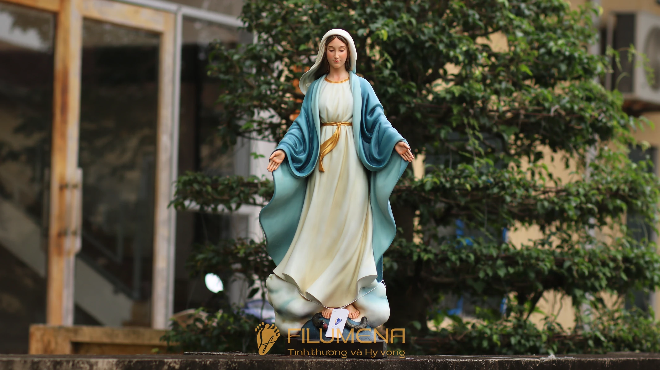 Chiều cao 80 cm giúp tượng nổi bật khi đặt trên bệ gỗ, đôn đá hoặc hốc tường, tạo thành điểm quy chiếu rõ ràng cho mọi ánh nhìn trong căn phòng. Đây là lựa chọn thích hợp cho những ai mong muốn dành một vị trí trang trọng cho Đức Mẹ Ban Ơn, để ngôi nhà hay cộng đoàn luôn sống trong sự che chở và bình an của Mẹ.