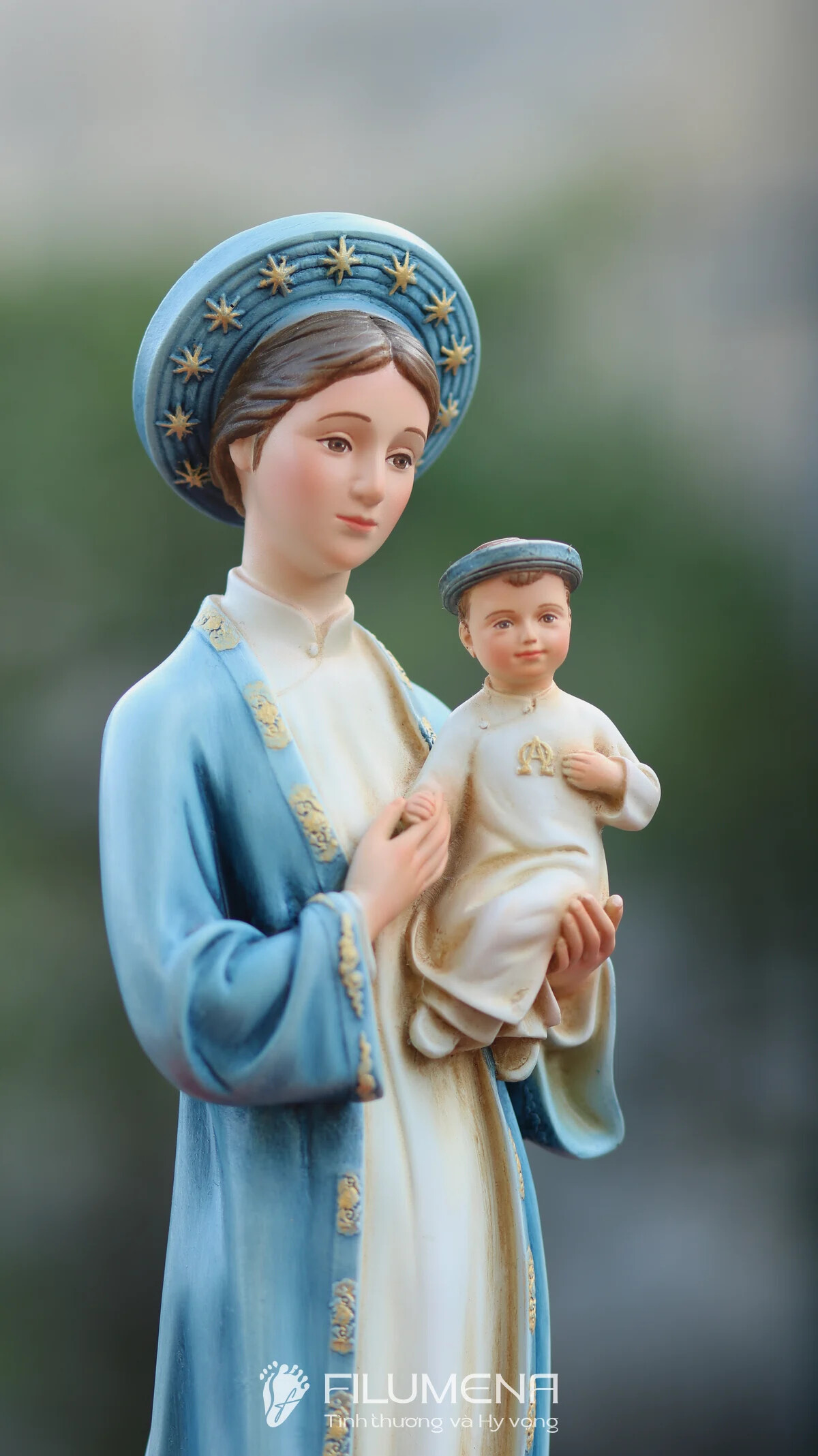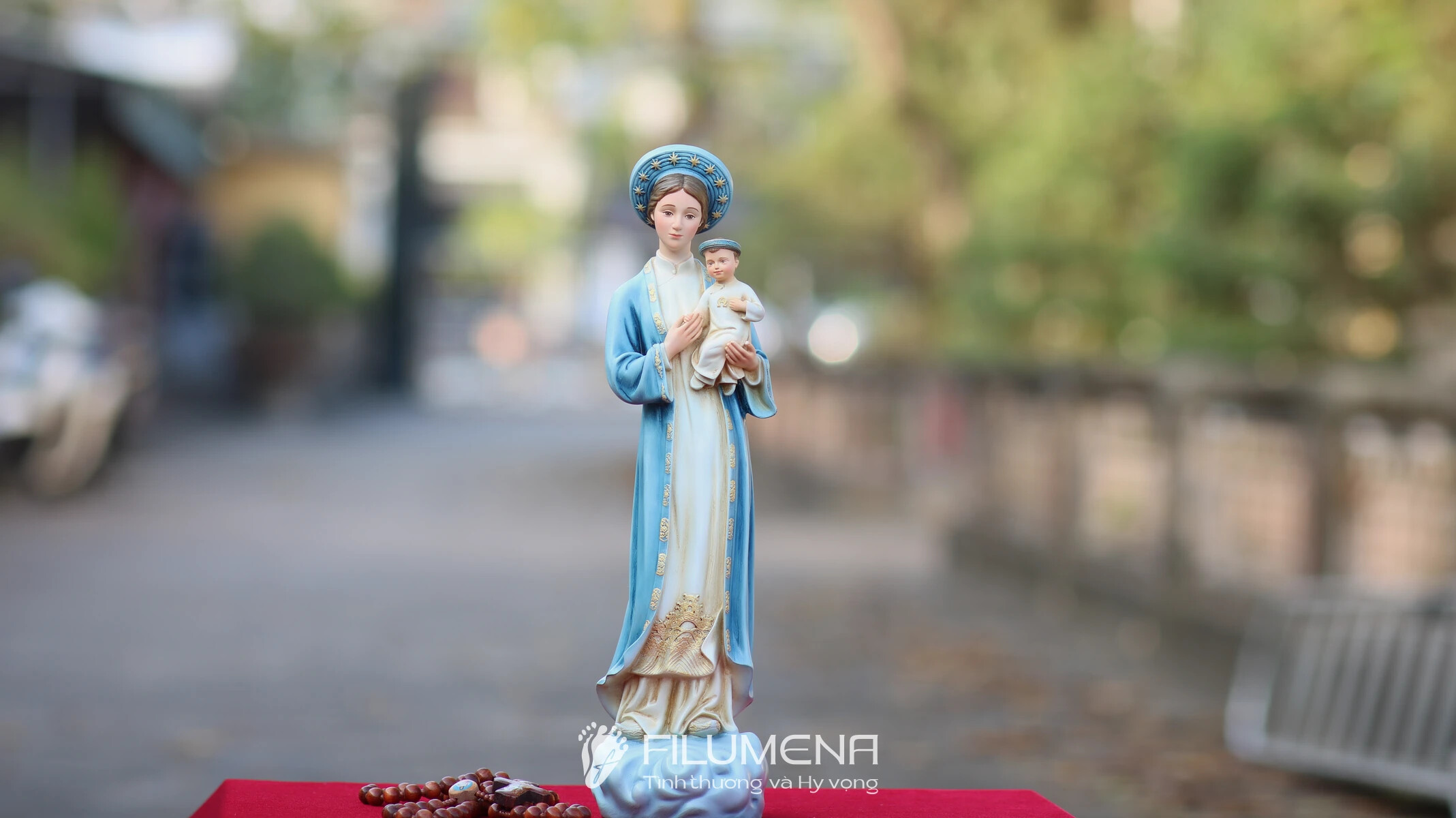 Tượng Đức Mẹ La Vang 40 cm do Filumena sáng tác, Mẹ mặc áo dài – khăn xếp, khoác áo choàng xanh da trời, bế Chúa Hài Đồng dịu hiền. Hoa văn trên áo được nghiên cứu từ họa tiết cổ phục nữ hoàng Việt Nam, vừa đúng lịch sử vừa thanh nhã, rất phù hợp đặt trên bàn thờ gia đình, kệ phòng khách hoặc góc cầu nguyện của người Công giáo Việt.