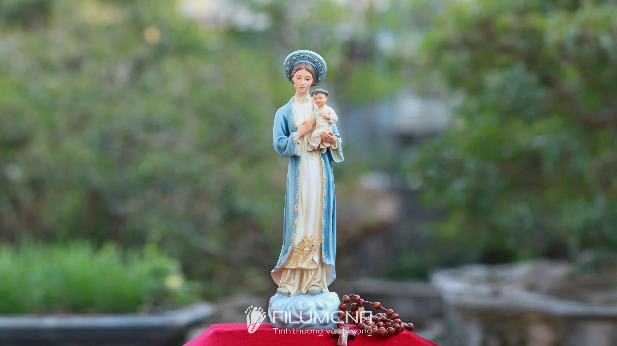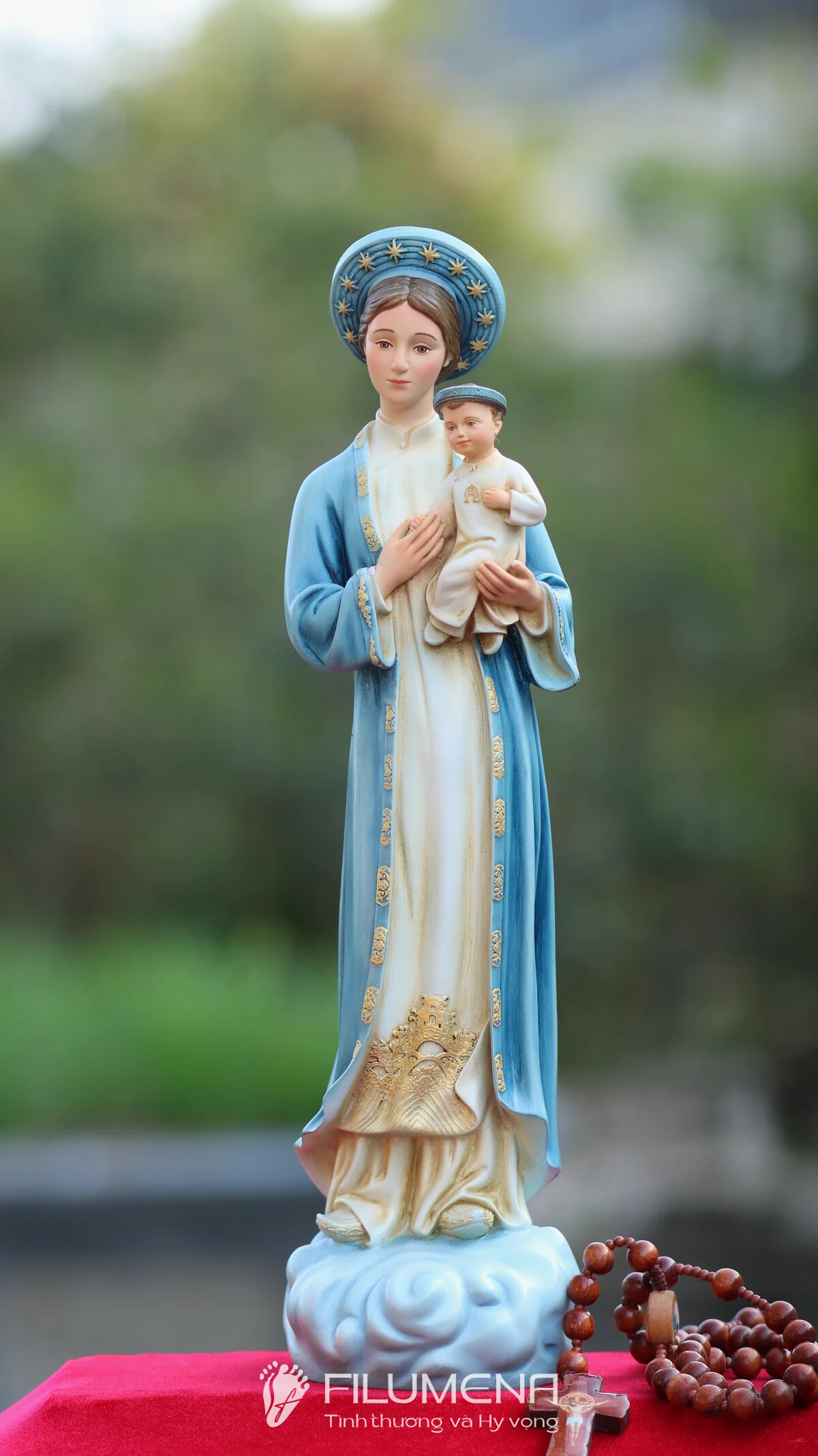 Tượng Đức Mẹ La Vang 40 cm là một trong những mẫu tượng mà Filumena dành rất nhiều tâm huyết, như một lời tri ân Đức Maria trong bối cảnh đức tin và văn hóa Việt Nam. Hình ảnh Mẹ hiện ra giữa rừng La Vang năm xưa được diễn tả bằng ngôn ngữ rất Việt: Mẹ mặc áo dài, đội khăn xếp, khoác áo choàng xanh da trời – sắc màu truyền thống gắn liền với các ảnh tượng Đức Mẹ trong phụng vụ, nhưng được đặt trọn vẹn trong đường nét cổ phục Việt.