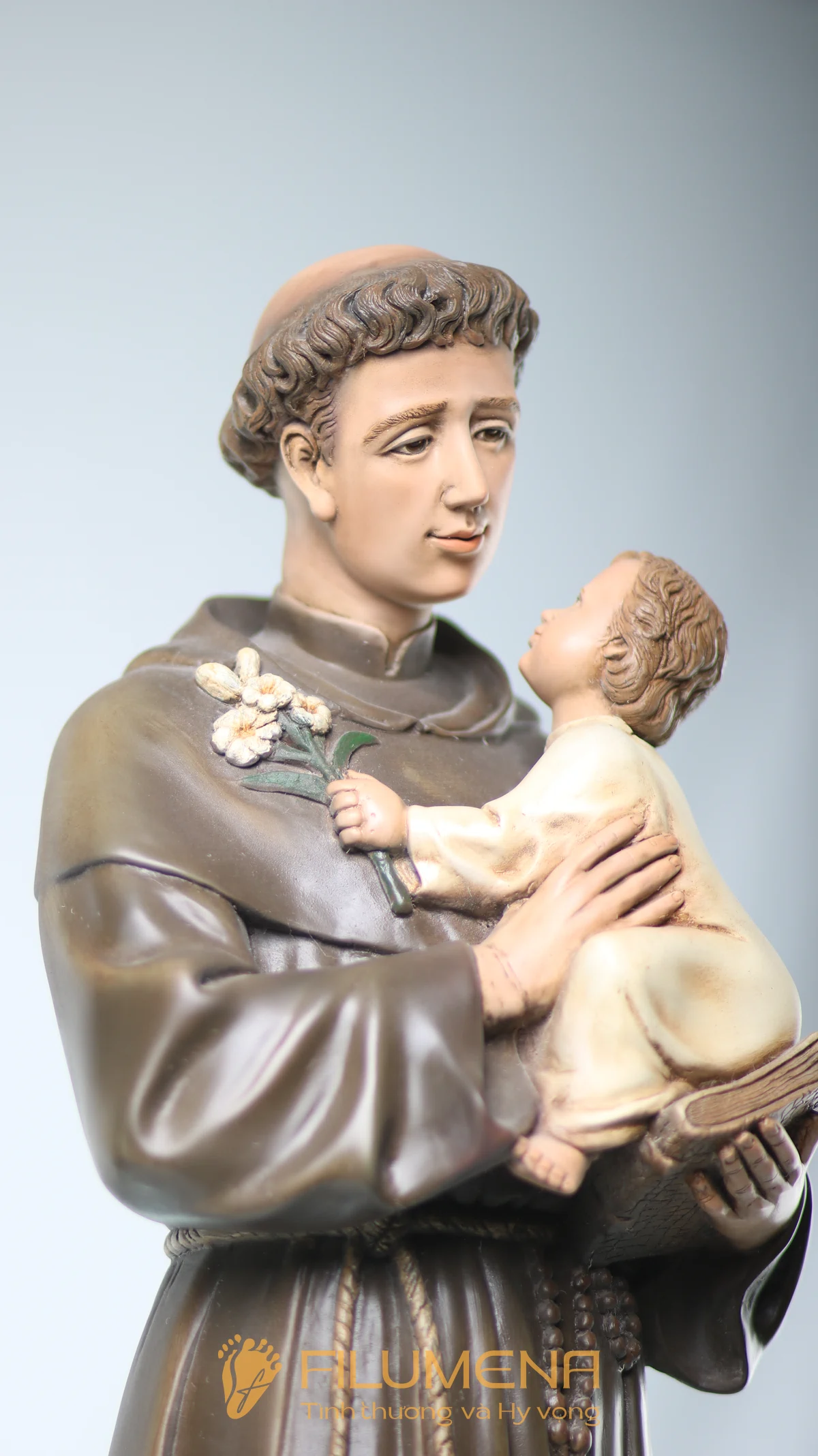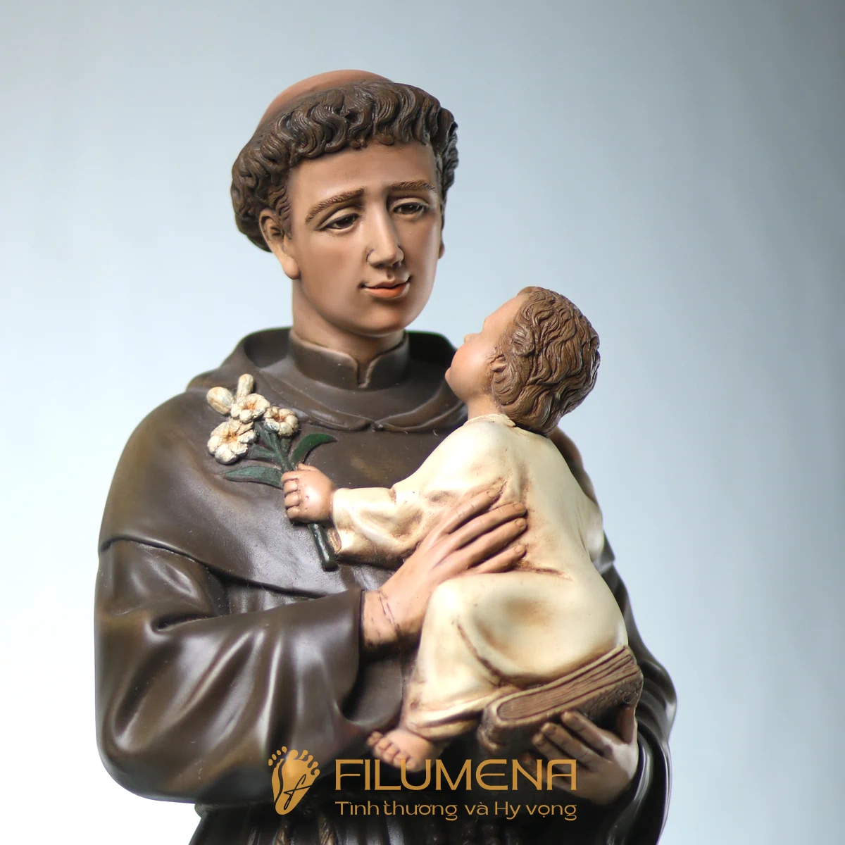 Tượng Thánh Antôn bế Chúa Hài Đồng do Filumena sáng tác khắc họa hình ảnh quen thuộc nhưng luôn đầy xúc động: Thánh Antôn trong tu phục hiền hòa, tay ôm Chúa Hài Đồng và nâng quyển Kinh Thánh sát vào lòng. Trên tay Chúa là nhành hoa huệ trắng, biểu tượng của sự thanh khiết và tình yêu trong sáng. Ánh mắt Chúa Hài Đồng hướng về Thánh Antôn cách trìu mến, như một cuộc đối thoại thinh lặng giữa Đấng Cứu Thế và người môn đệ hiền lành.