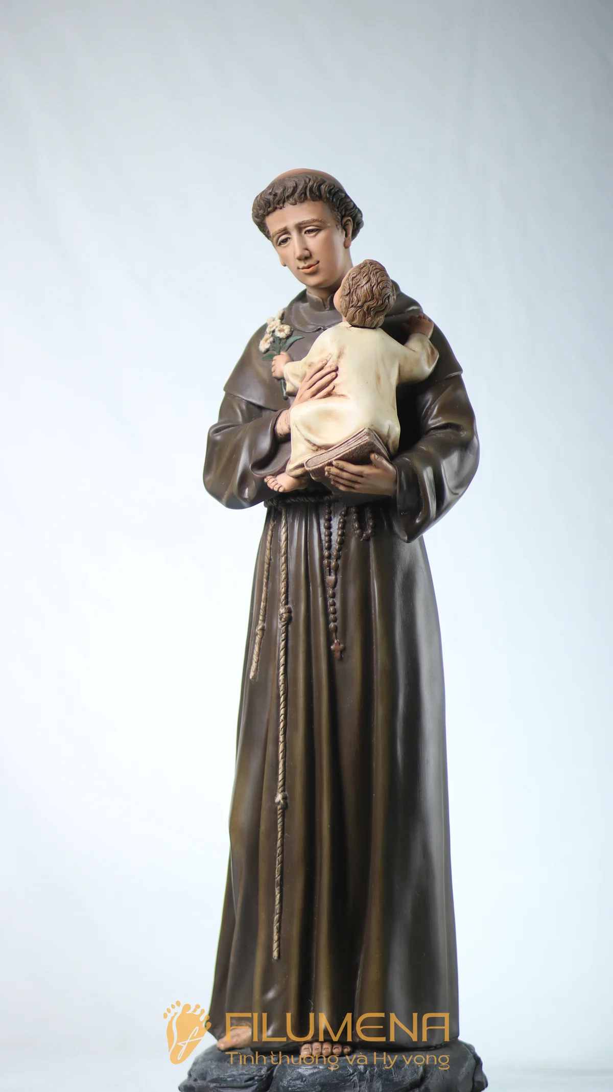 Tượng Thánh Antôn bế Chúa Hài Đồng do Filumena sáng tác khắc họa hình ảnh quen thuộc nhưng luôn đầy xúc động: Thánh Antôn trong tu phục hiền hòa, tay ôm Chúa Hài Đồng và nâng quyển Kinh Thánh sát vào lòng. Trên tay Chúa là nhành hoa huệ trắng, biểu tượng của sự thanh khiết và tình yêu trong sáng. Ánh mắt Chúa Hài Đồng hướng về Thánh Antôn cách trìu mến, như một cuộc đối thoại thinh lặng giữa Đấng Cứu Thế và người môn đệ hiền lành. Tượng cao 63 cm.