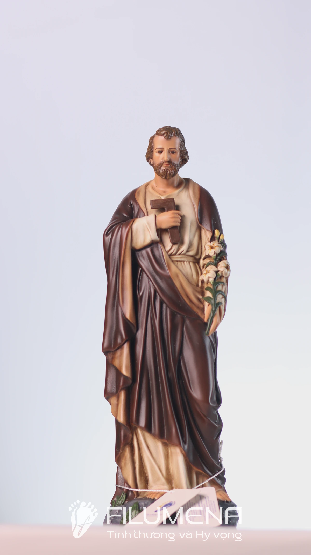 Tượng Thánh Giuse Thợ 30 cm, 40 cm màu nâu M1 khắc họa Thánh Cả trong hình ảnh người lao động hiền lành, âm thầm. Thánh Giuse khoác áo choàng nâu cổ điển, tay cầm dụng cụ nghề mộc, gương mặt trầm lắng nhưng hiền từ, gợi nhớ những năm tháng lao động tại Nazareth vì gia đình nhỏ của mình. Tông màu nâu M1 ấm áp, dễ hài hòa với bàn thờ gỗ và nội thất phòng khách. Kích thước 30 cm phù hợp cho bàn thờ nhỏ, góc cầu nguyện, bàn làm việc; kích thước 40 cm lý tưởng cho bàn thờ Chúa phòng khách hoặc phòng nguyện gia đình, như một lời nhắc sống siêng năng, trung tín và khiêm nhường theo gương Thánh Giuse Thợ.