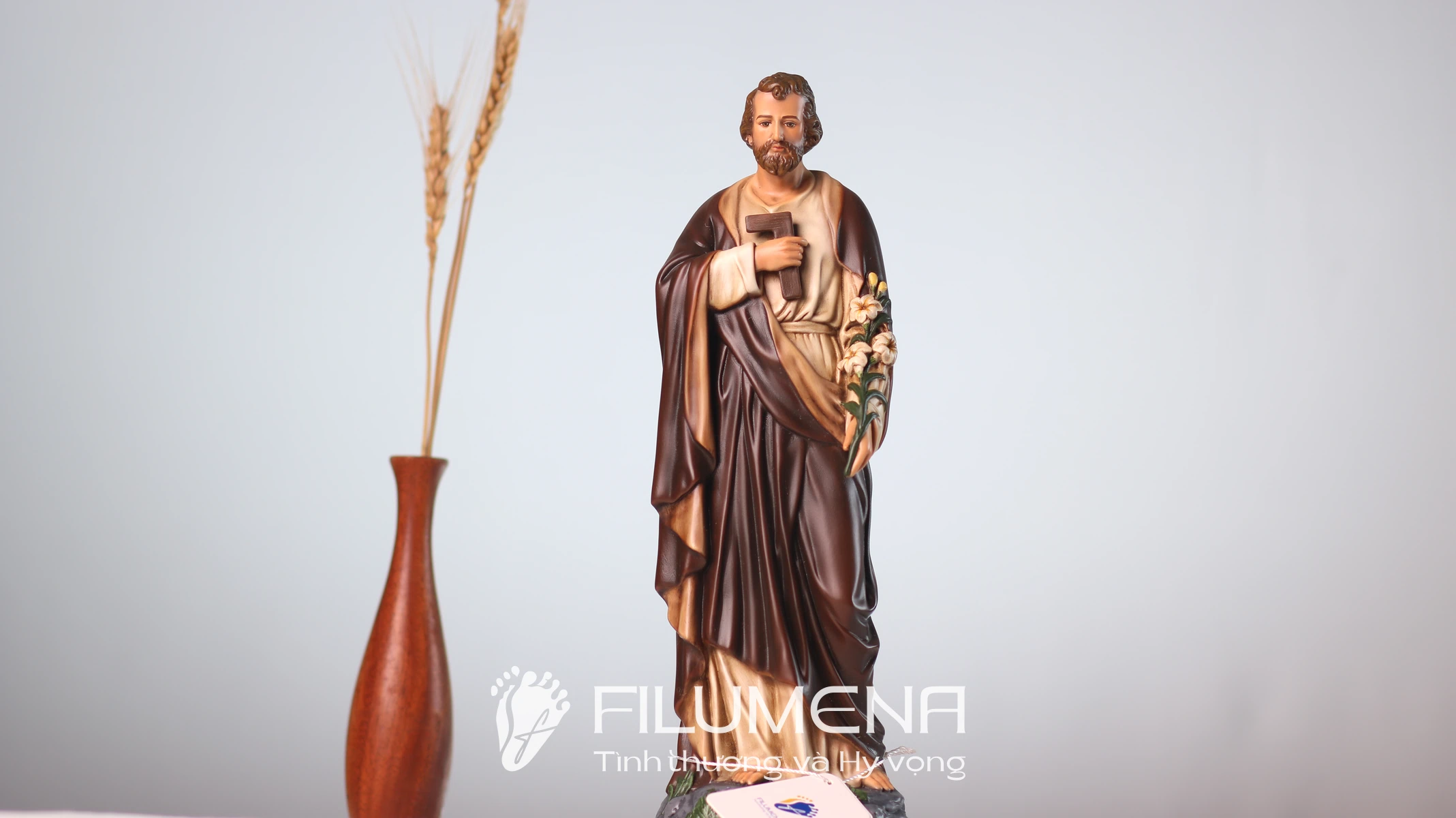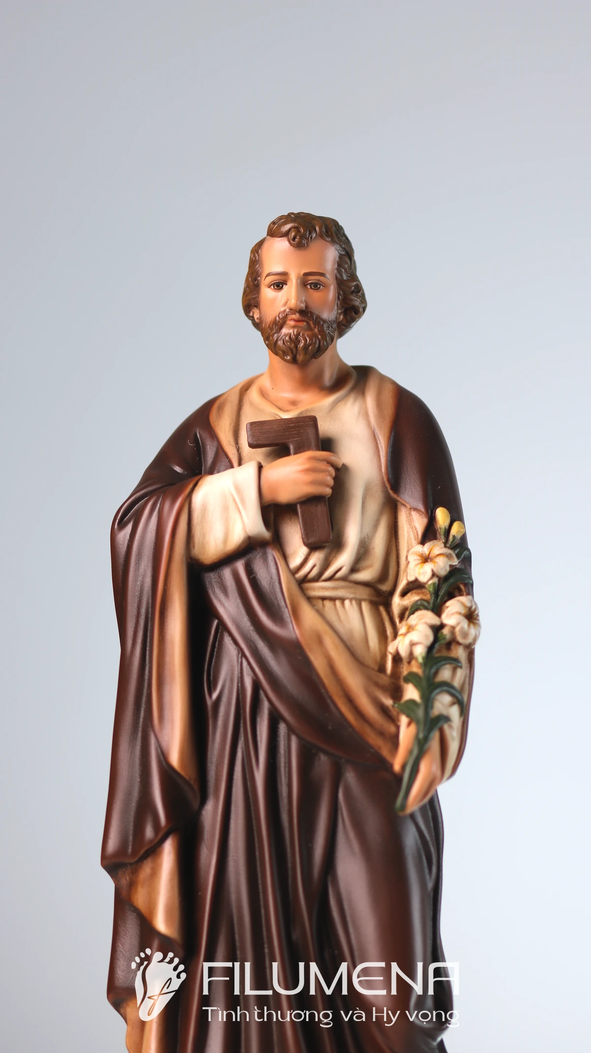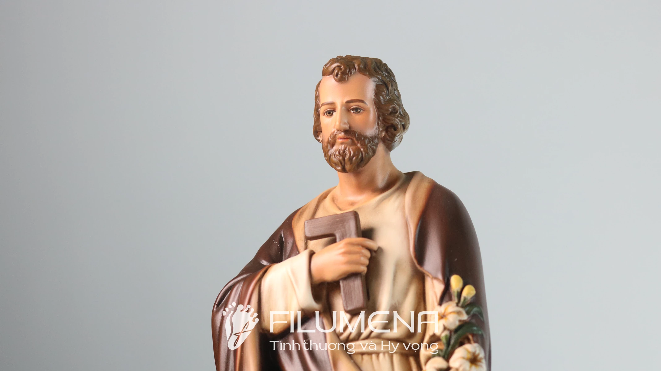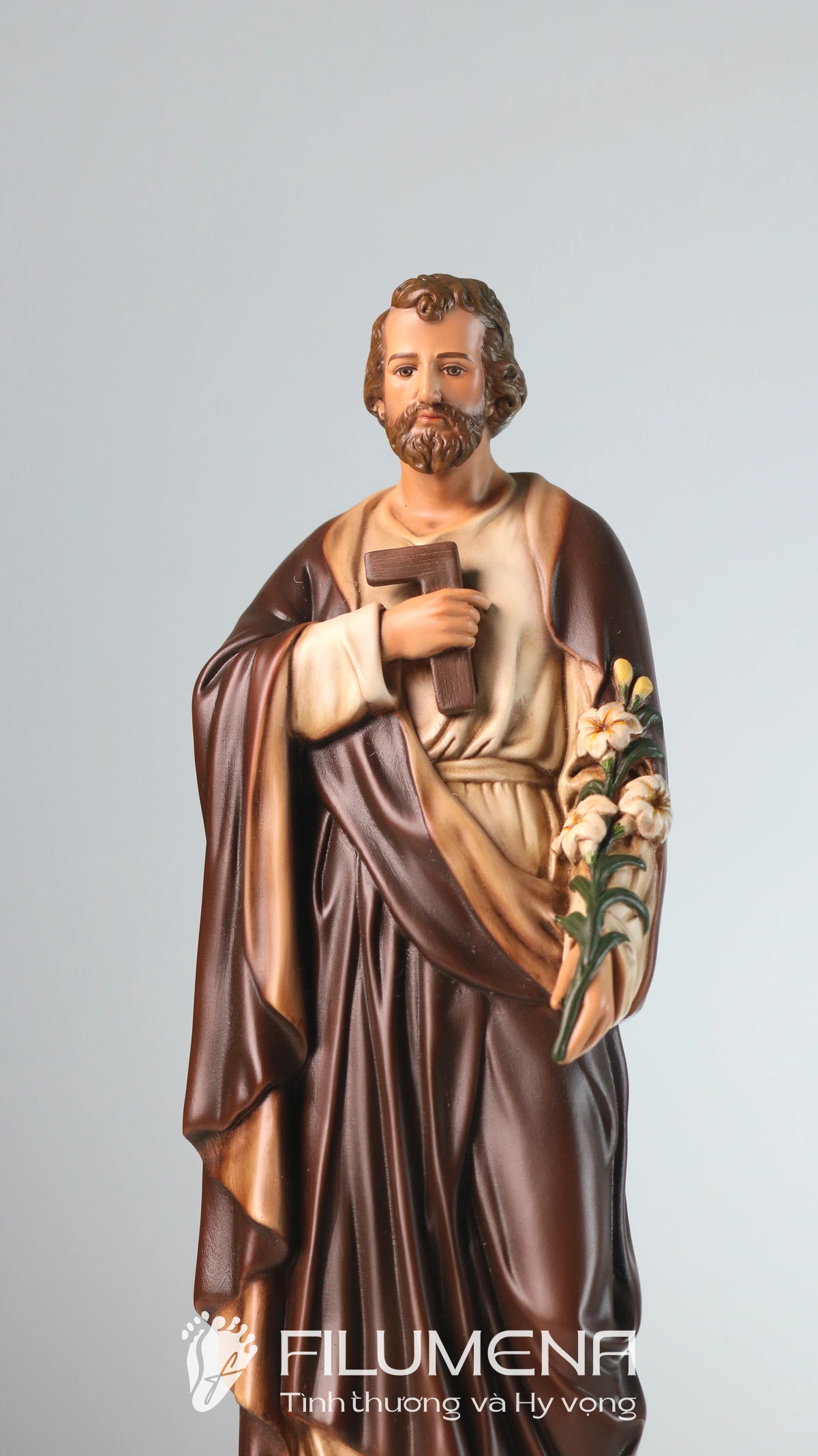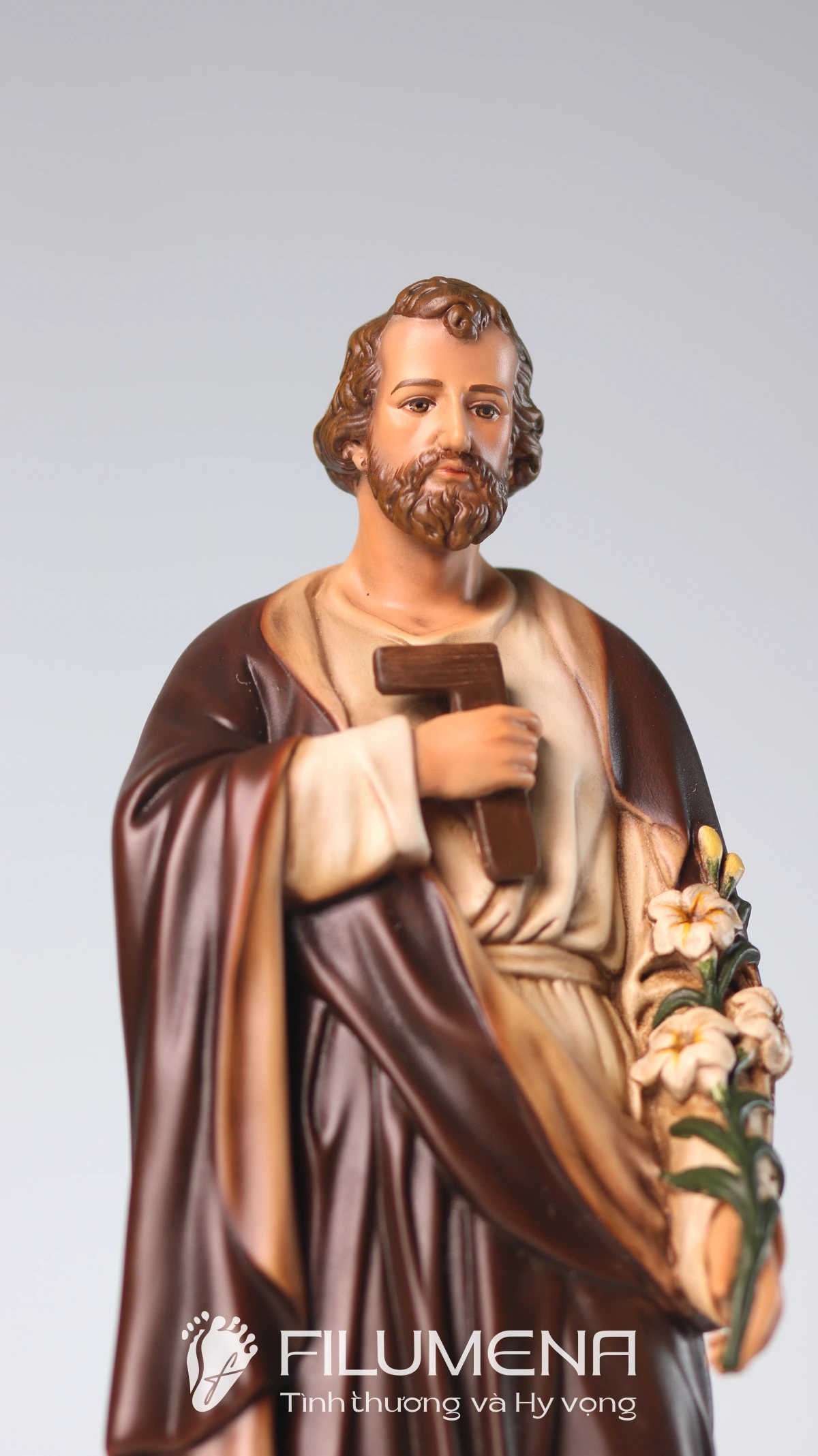Thánh nhân khoác áo choàng màu nâu cổ điển M1, bên trong là áo sáng hơn, tạo nên một tổng thể ấm áp và rất “đời thường”. Tông nâu M1 giúp tượng dễ hòa với màu gỗ của bàn thờ, tủ, kệ trong phòng khách hay góc cầu nguyện gia đình. Tư thế đứng vững chãi, tay cầm dụng cụ nghề mộc / tựa bên phiến gỗ, bàn làm việc (tùy phiên bản), gợi lại những giờ lao động âm thầm nhưng đầy yêu thương của Thánh Giuse dành cho Đức Maria và Chúa Giêsu.