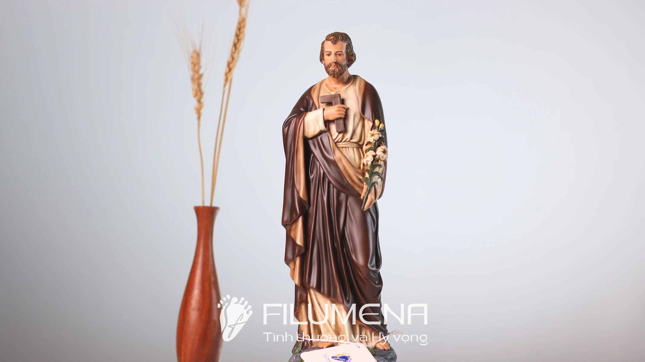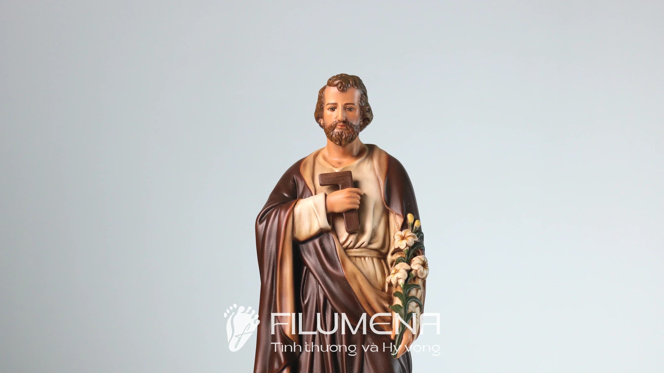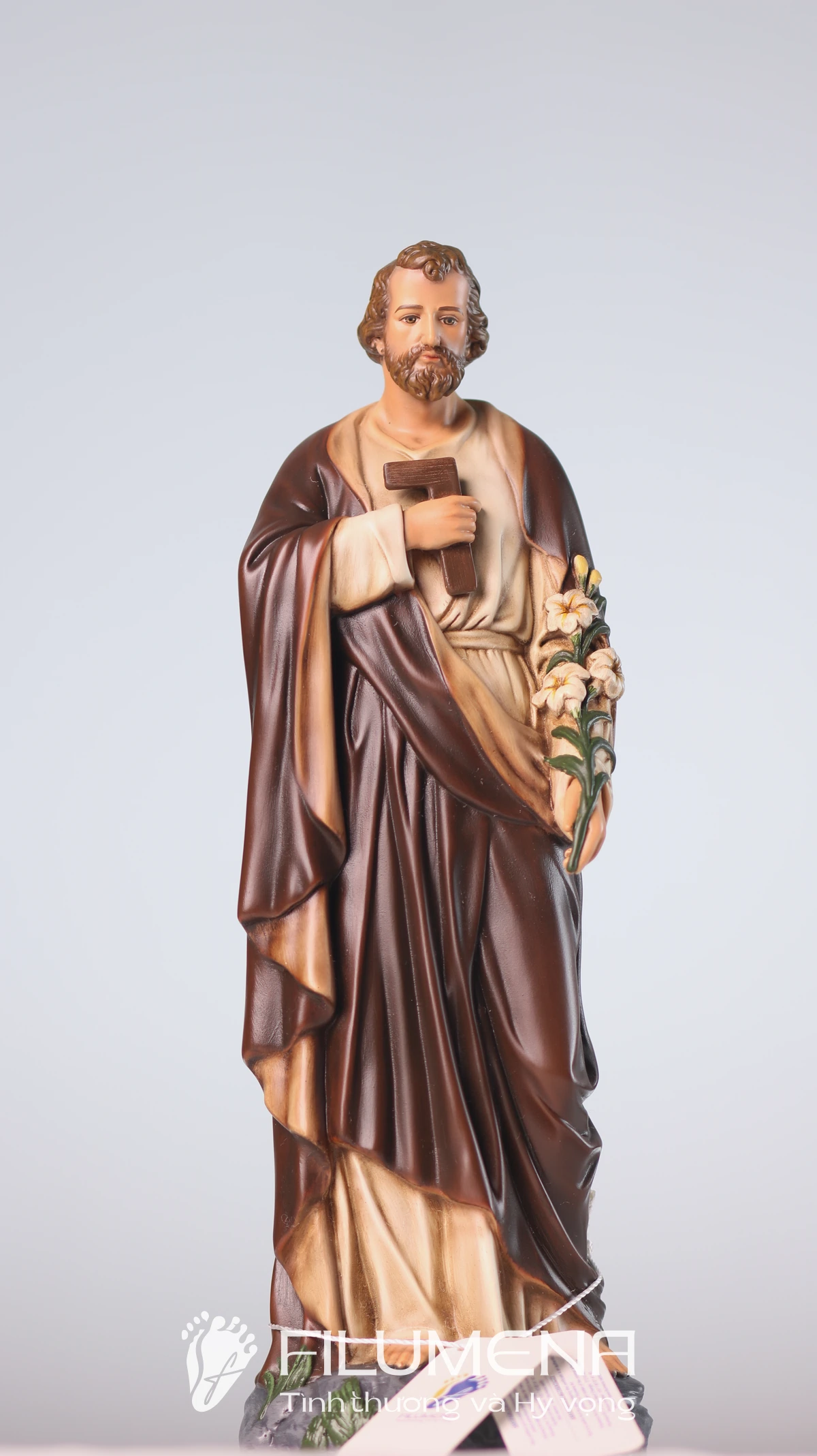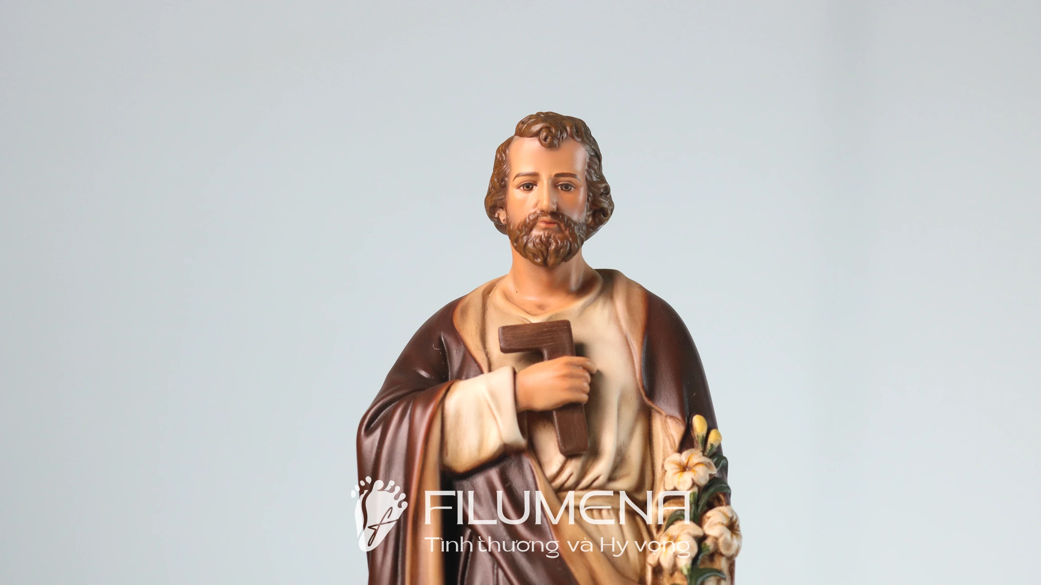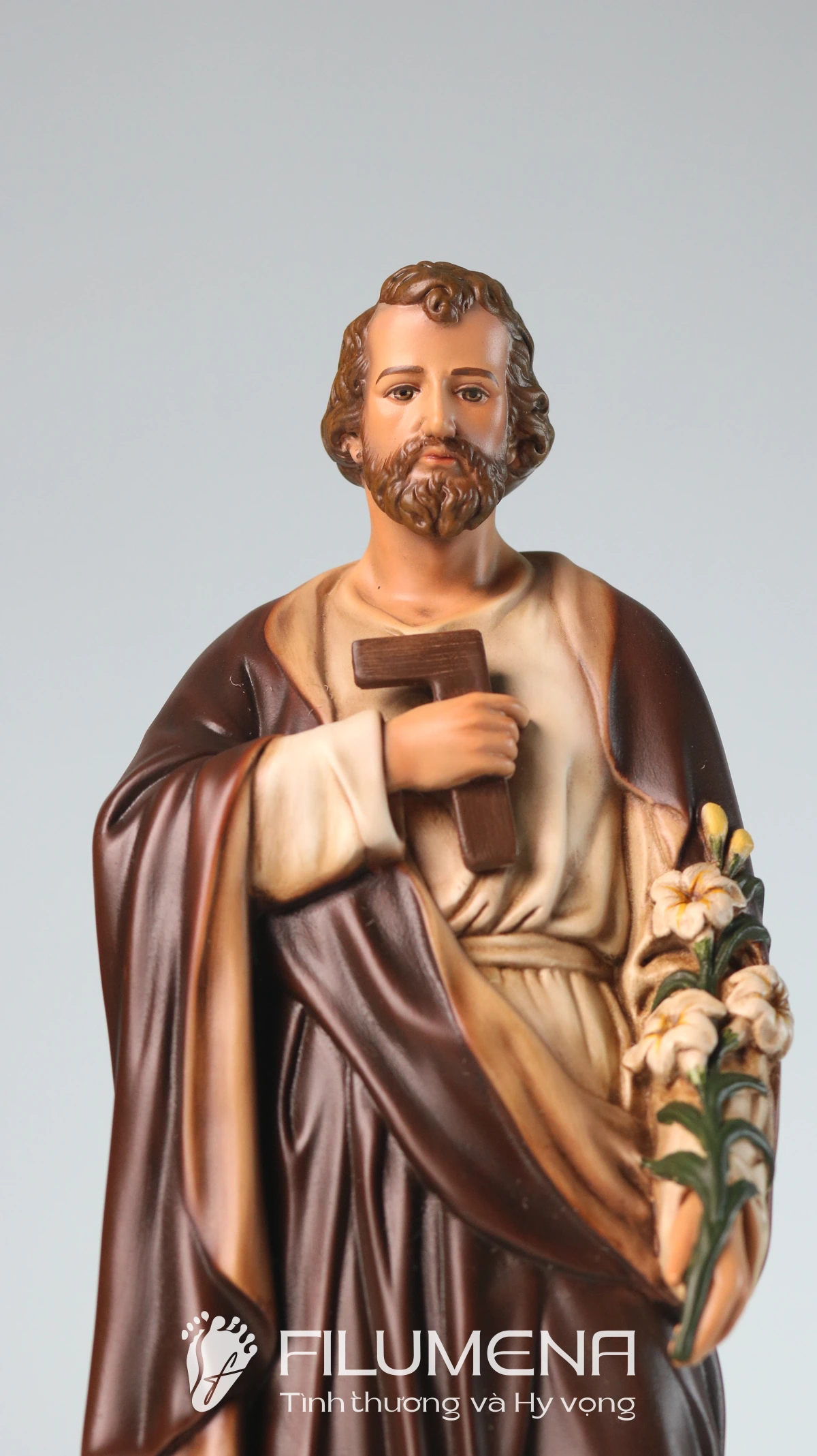 Thánh nhân khoác áo choàng màu nâu cổ điển M1, bên trong là áo sáng hơn, tạo nên một tổng thể ấm áp và rất “đời thường”. Tông nâu M1 giúp tượng dễ hòa với màu gỗ của bàn thờ, tủ, kệ trong phòng khách hay góc cầu nguyện gia đình. Tư thế đứng vững chãi, tay cầm dụng cụ nghề mộc / tựa bên phiến gỗ, bàn làm việc (tùy phiên bản), gợi lại những giờ lao động âm thầm nhưng đầy yêu thương của Thánh Giuse dành cho Đức Maria và Chúa Giêsu.
