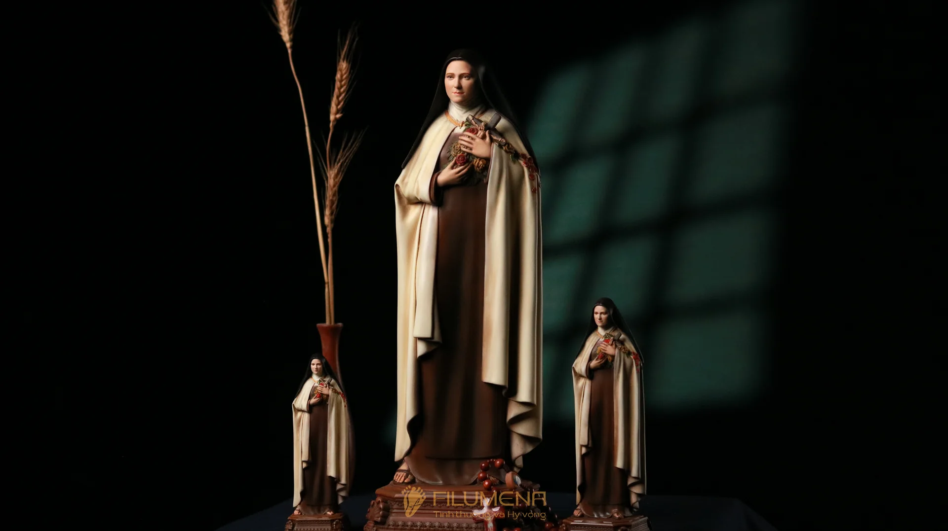 Tượng Thánh Tê-rê-sa khắc họa chị Thánh với gương mặt dịu hiền, tay ôm thánh giá và những đóa hồng – biểu tượng cho “con đường thơ ấu thiêng liêng” mà chị Thánh đã sống: đơn sơ, phó thác và đầy yêu thương trong những điều nhỏ bé hằng ngày. Từng chi tiết nhỏ như ánh mắt, tà áo dòng Kín Cát Minh hay cánh hoa rơi nhẹ cũng đều được thể hiện một cách chăm chút, tỉ mỉ.