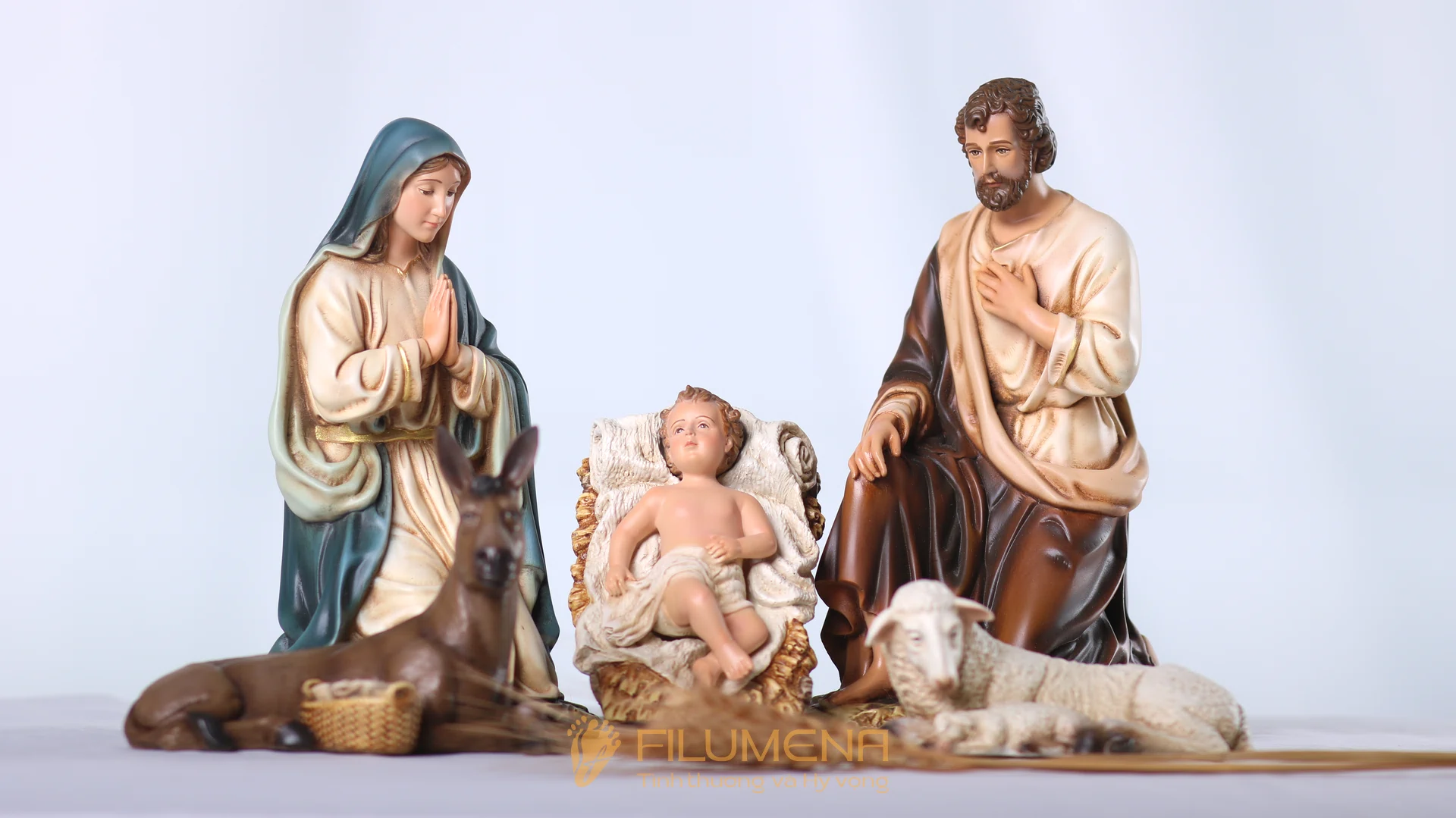 Dù không gian rộng hay nhỏ, nguyên tắc là mọi ánh nhìn hướng về Hài Nhi. Đặt tượng thấp hơn tầm mắt một chút để gợi cảm giác cúi mình thờ lạy. Sử dụng đèn vàng ấm hắt nhẹ từ một phía, tạo vùng sáng tập trung lên Hài Nhi; Đức Mẹ và Thánh Giuse đứng hai bên, tạo tam giác hài hòa. Tránh đèn nhấp nháy mạnh hoặc màu quá rực – vì dễ làm phân tán ý nghĩa thiêng liêng.