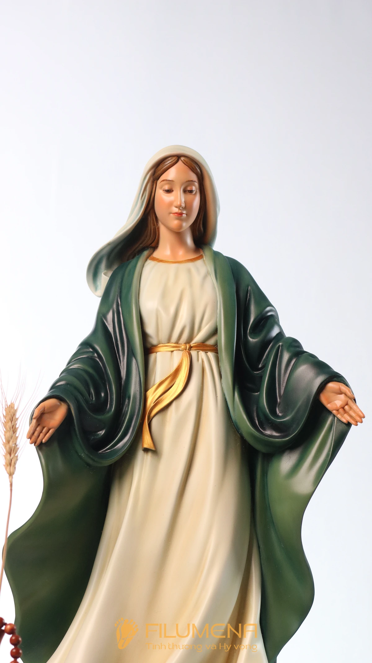 Mẫu tượng của Filumena nổi bật với gương mặt hiền từ, ánh mắt sâu lắng và chi tiết sắc nét – từ áo dòng cho đến sách Thánh và chuỗi Mân Côi.